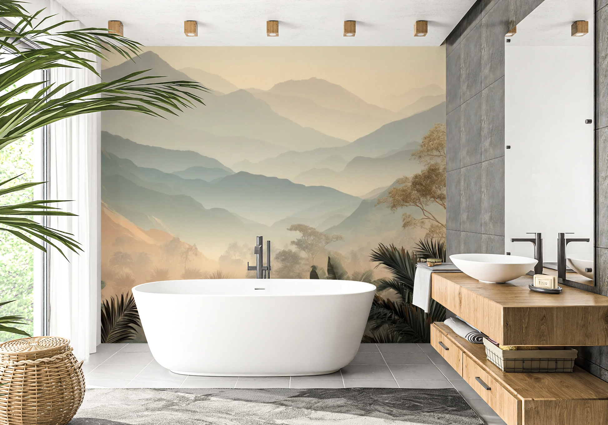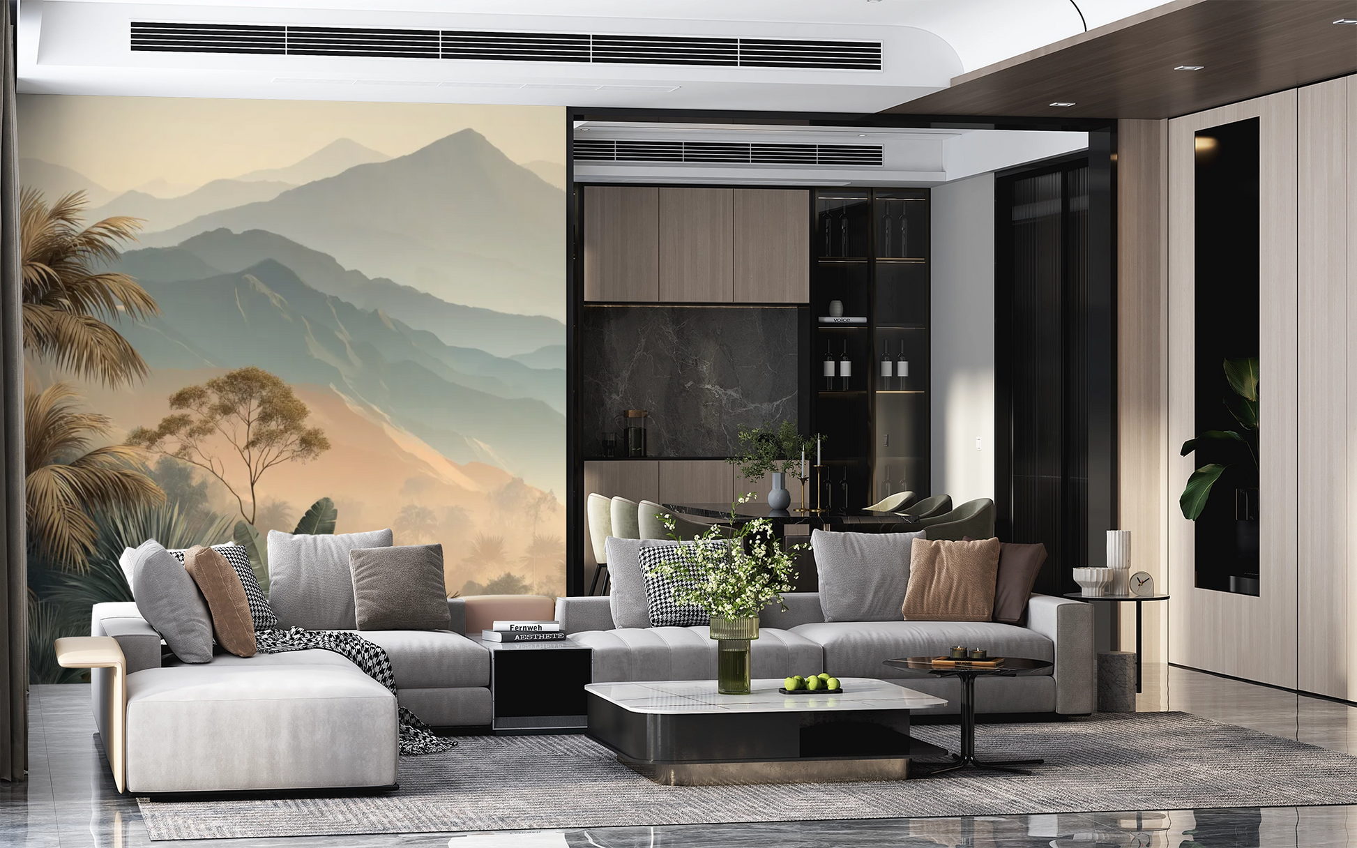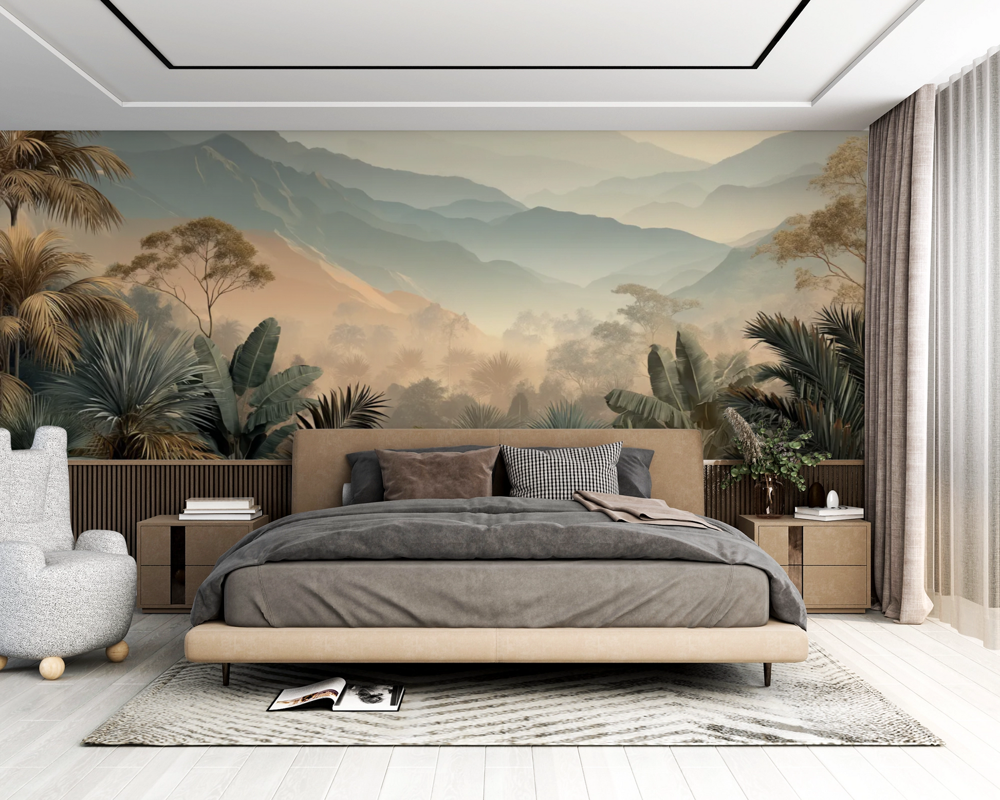 This wall mural presents a tranquil mountain landscape layered with soft mist, distant ridgelines, and subtle tropical foliage in the foreground. The warm, muted color palette transitions gently across the scene, creating depth and a sense of quiet movement that draws the eye toward the horizon.