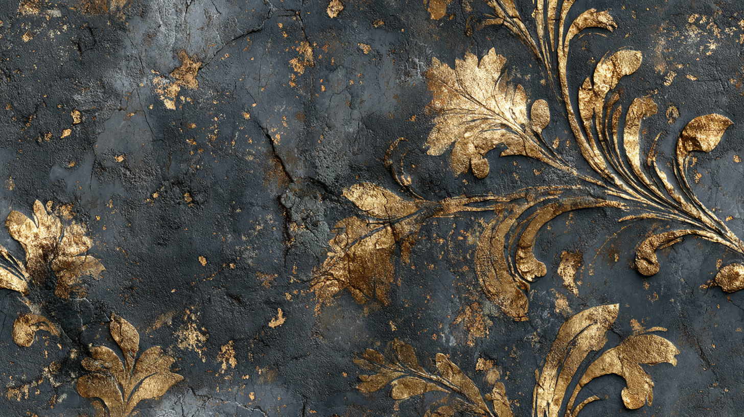 This wall mural features intricate baroque-inspired botanical flourishes rendered in luminous gold against a deep charcoal and slate stone background. Ornate leaf motifs sweep gracefully across a richly textured surface, where subtle cracks, patina, and mineral variations add depth and authenticity. The contrast between the dark, weathered stone and the metallic gold detailing creates a dramatic, refined aesthetic that feels both historic and contemporary. Elegant yet bold, this design evokes old-world luxury with a modern edge. Ideal for living rooms, dining spaces, powder rooms, offices, boutique hotels, or upscale commercial interiors, this mural delivers a statement of timeless sophistication and architectural richness.