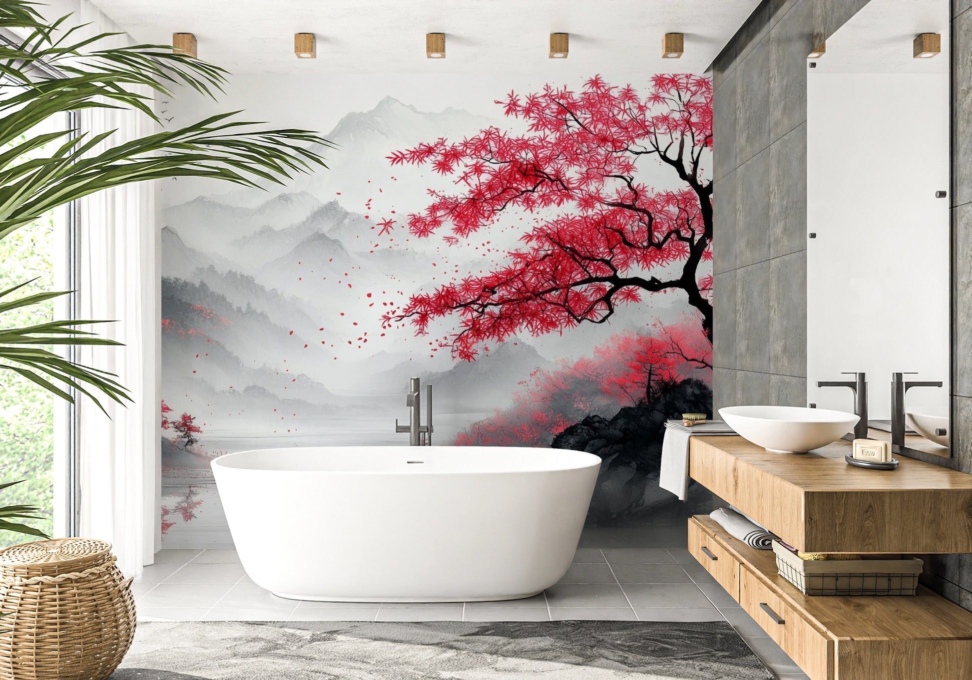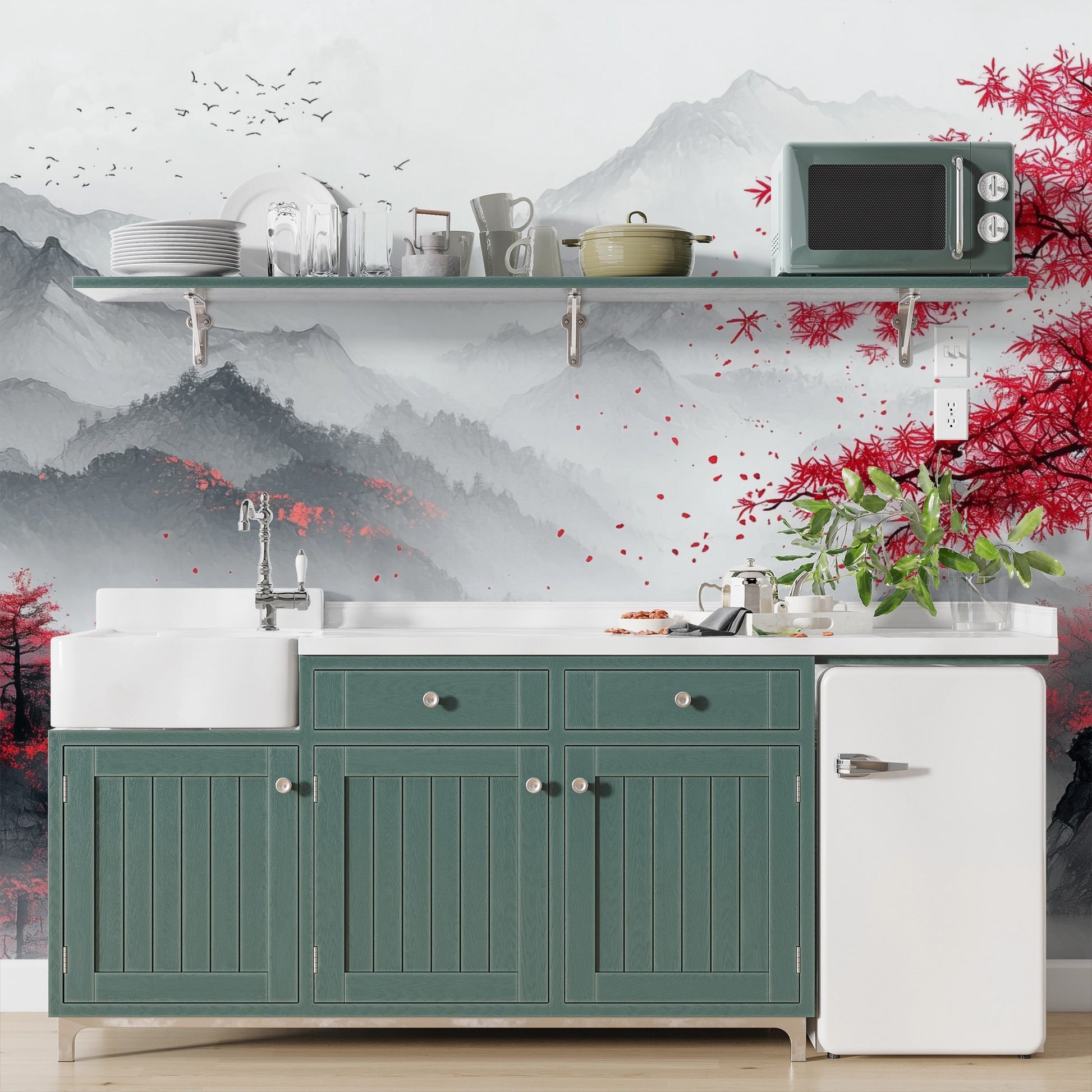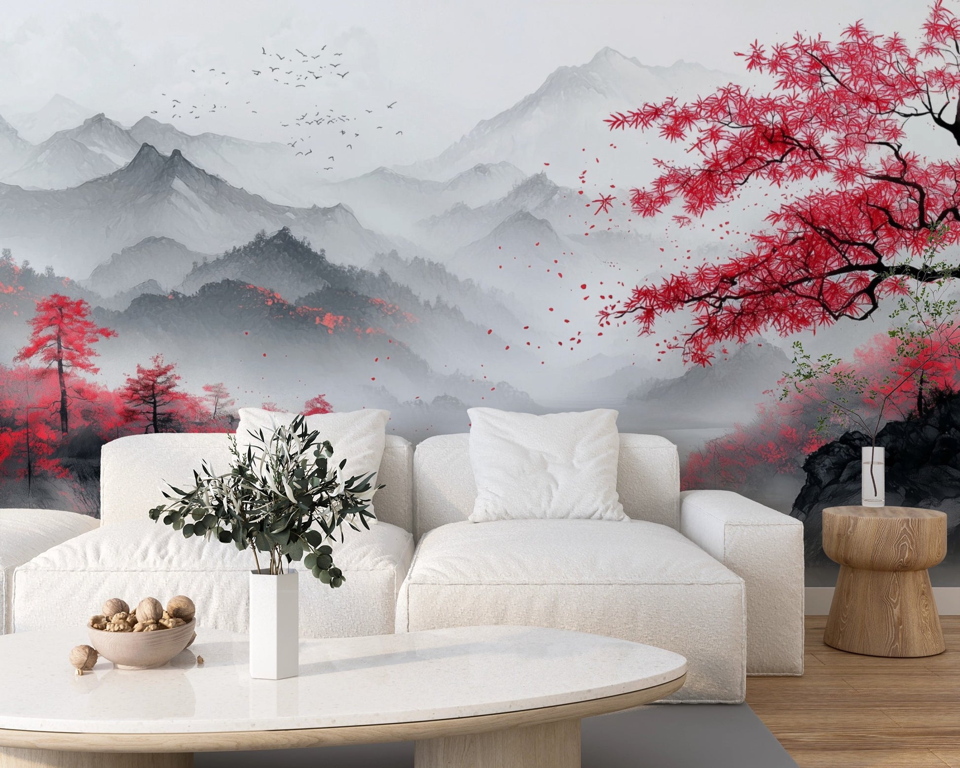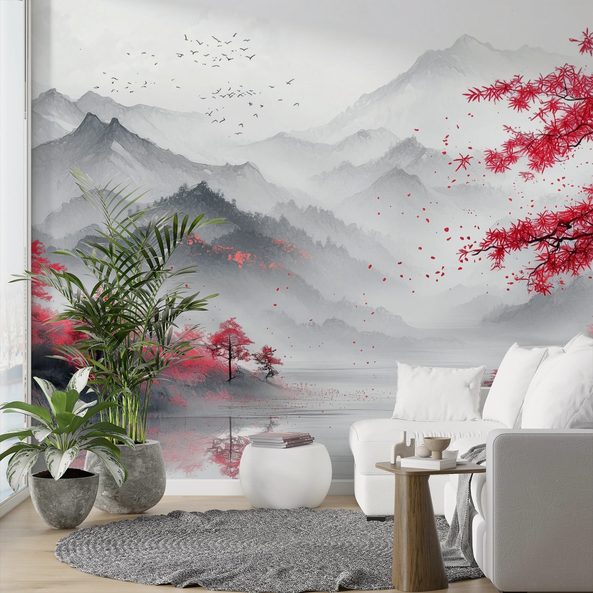 Oriental Minimalism with Cherry Blossom Charm: Misty Mountain Artwork