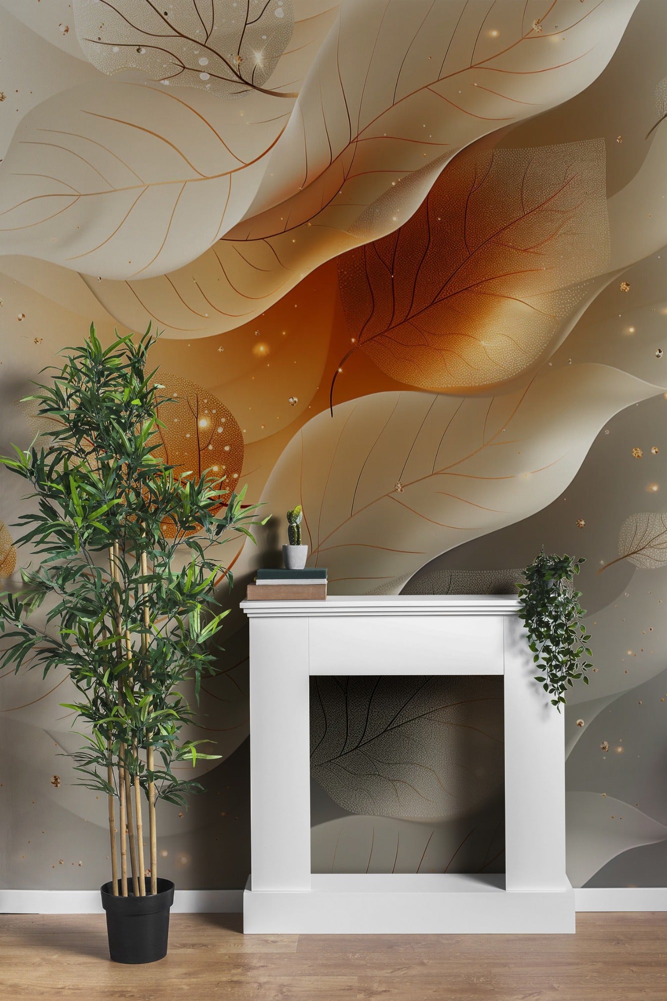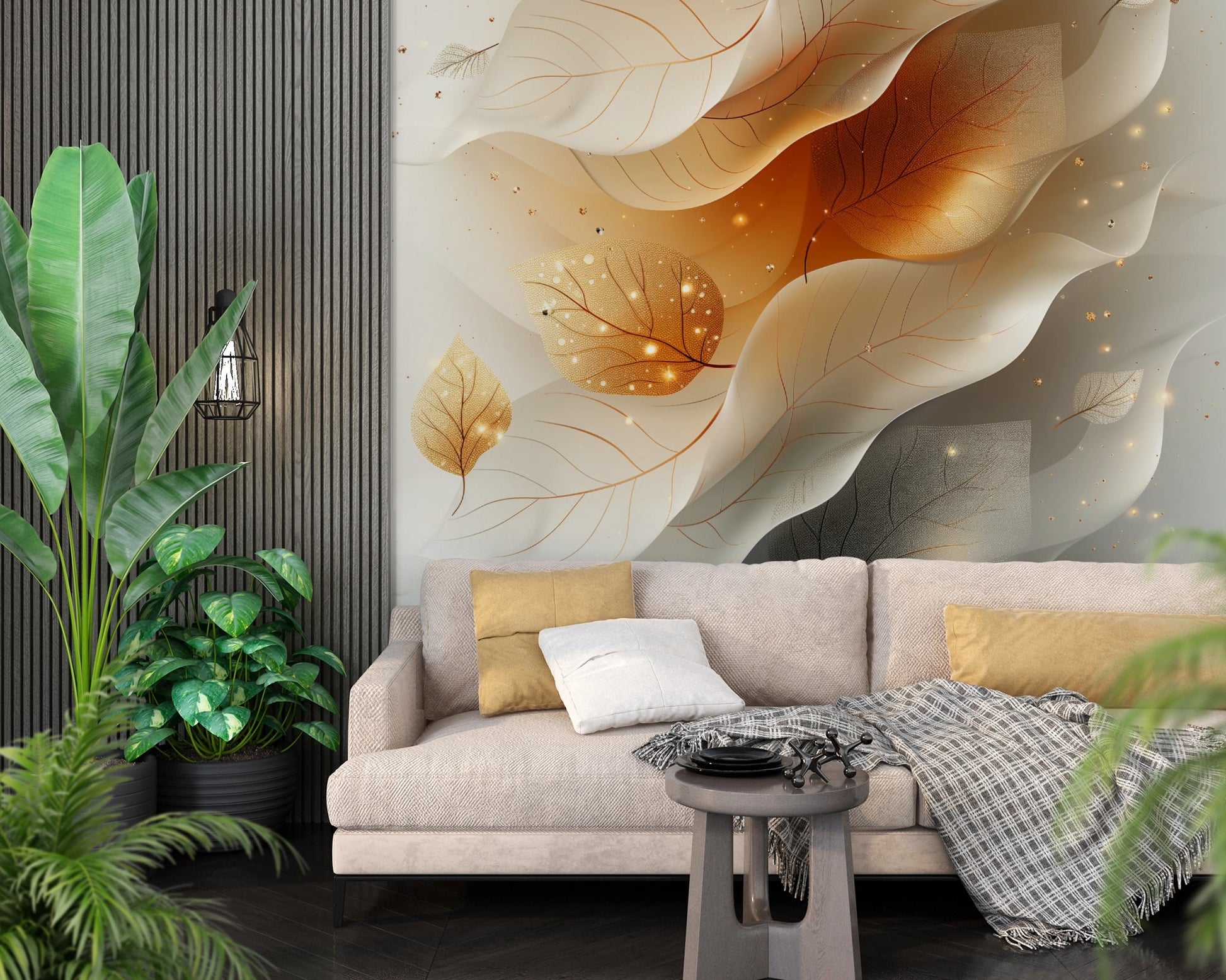 Add modern sophistication to your home with our golden abstract leaf peel and stick wallpaper. Featuring flowing layers of soft cream, gray, and amber tones with delicate leaves highlighted in shimmering gold, this mural creates a sense of depth, elegance, and warmth. Perfect for living rooms, bedrooms, dining areas, or feature walls, it transforms any space into a contemporary statement with a touch of luxury.