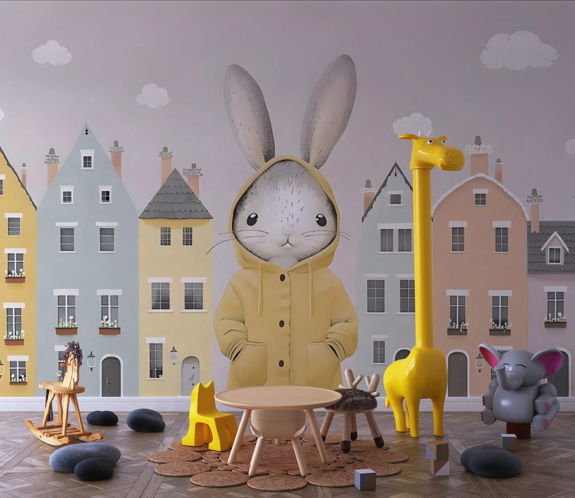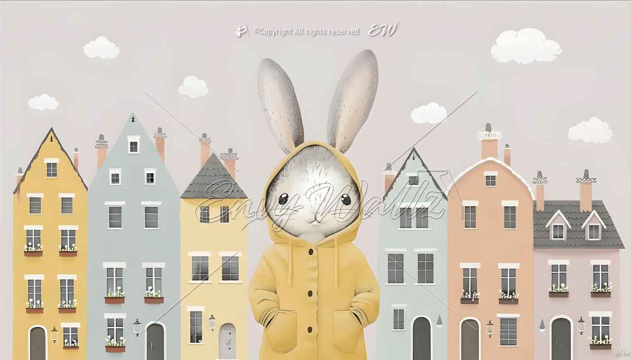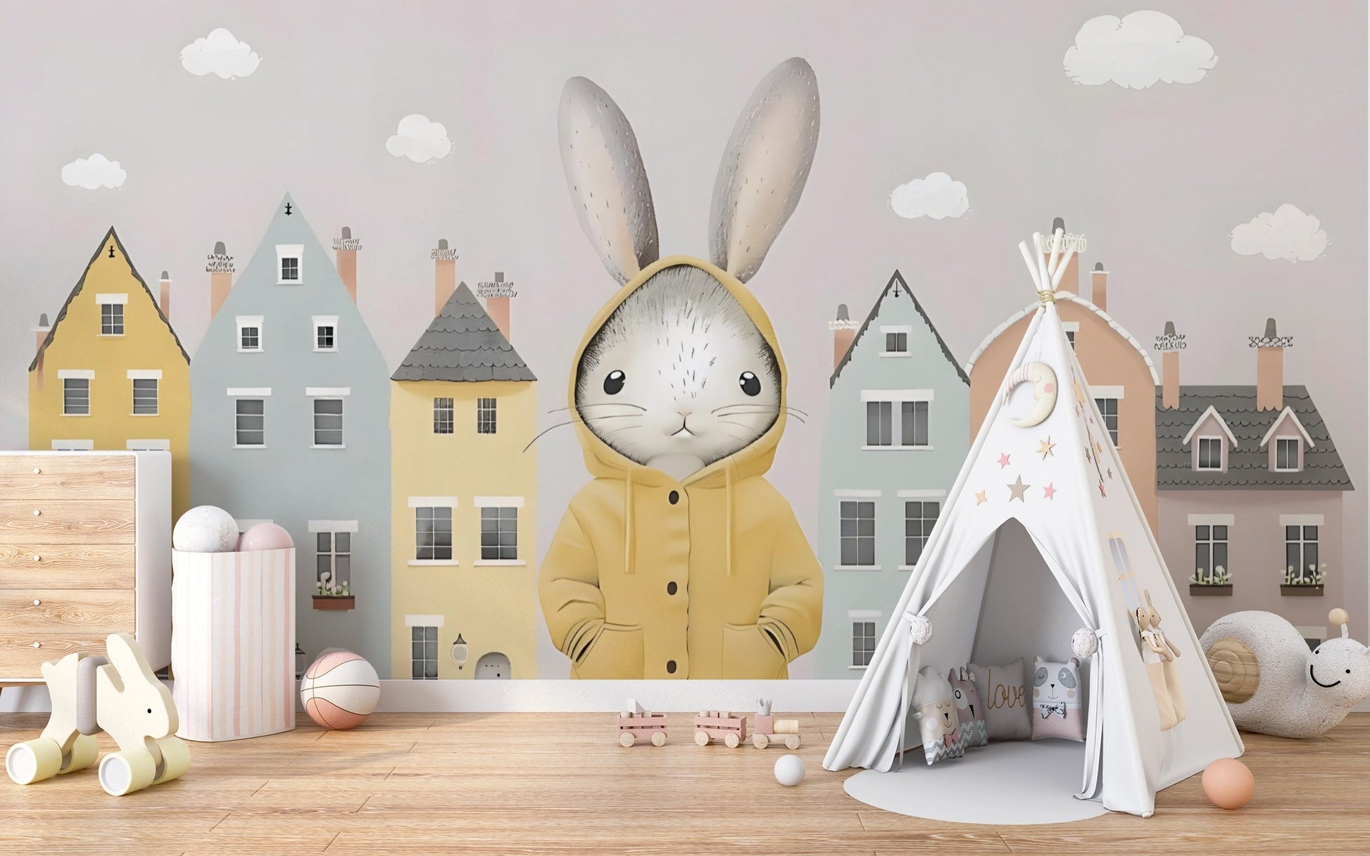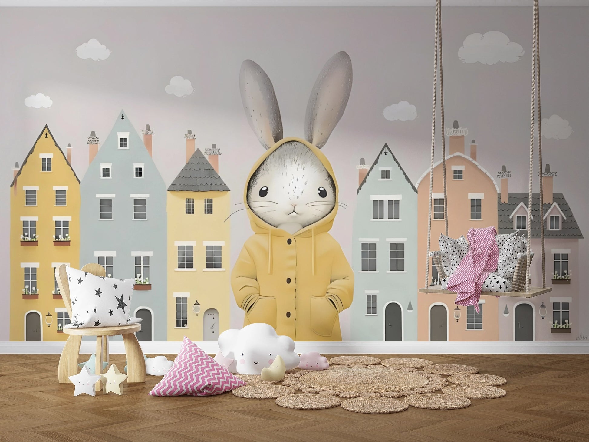 Add a touch of whimsy and comfort to your child’s room with our bunny in yellow hoodie peel and stick wallpaper mural. Featuring a sweet rabbit character standing in front of pastel-colored townhouses under a sky with fluffy clouds, this mural creates a playful yet cozy atmosphere. The muted palette of yellows, blues, and soft neutrals makes it versatile for both boys’ and girls’ spaces, adding joy without overwhelming the room.