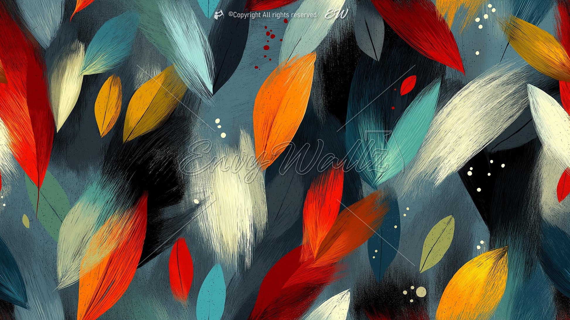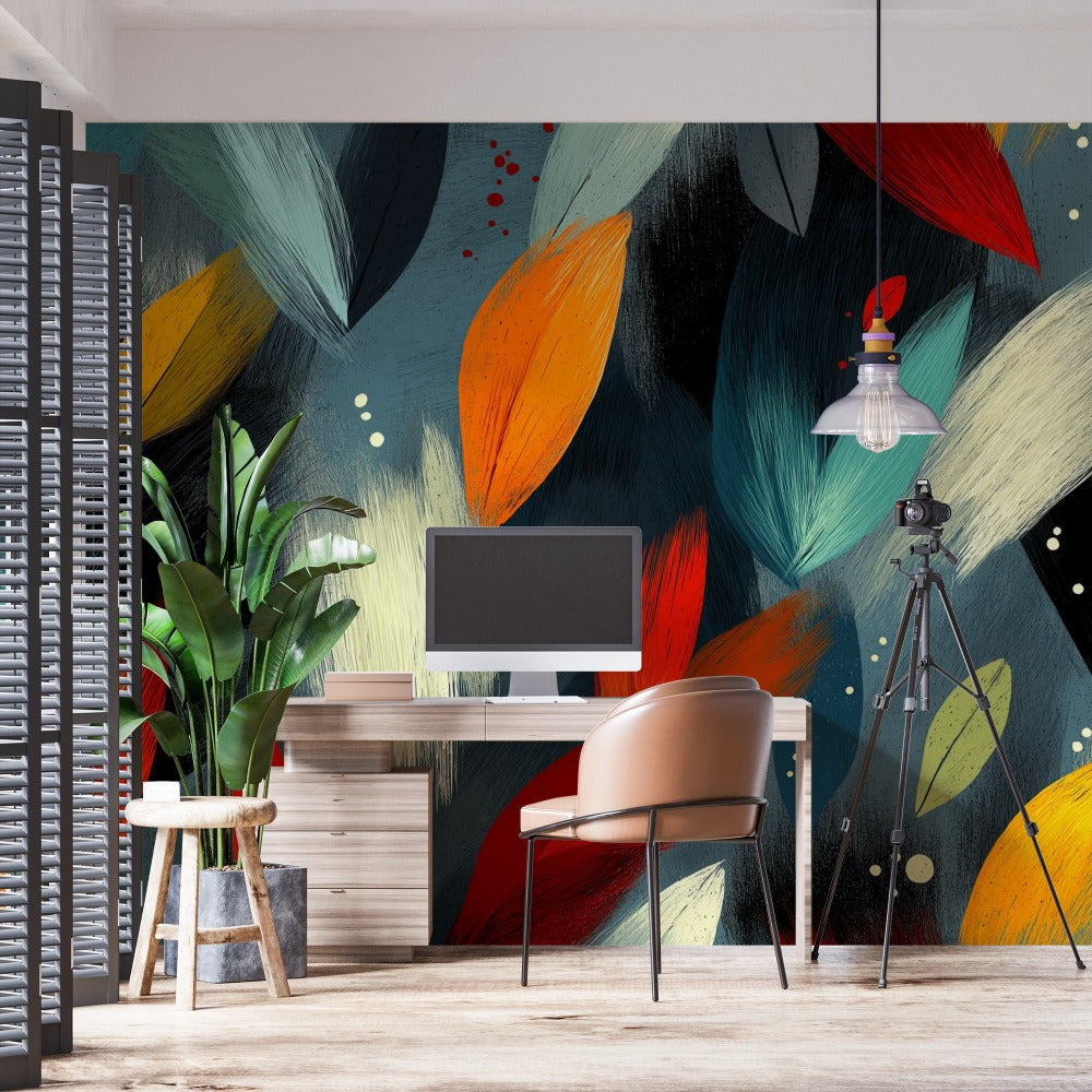 This peel and stick wallpaper features an abstract pattern of stylized feathers and leaves swirling on a dark background. Strokes of scarlet red, burnt orange, mustard yellow, turquoise, green and cream intertwine and overlap, evoking feathers dancing in the wind or falling petals. The brush like texture of each shape gives the mural an artistic quality, and the scattered dots add a playful touch, like sparks or droplets. Ideal for living rooms, creative studios or accent walls, this design brings energy, dynamism and modern flair to any space.