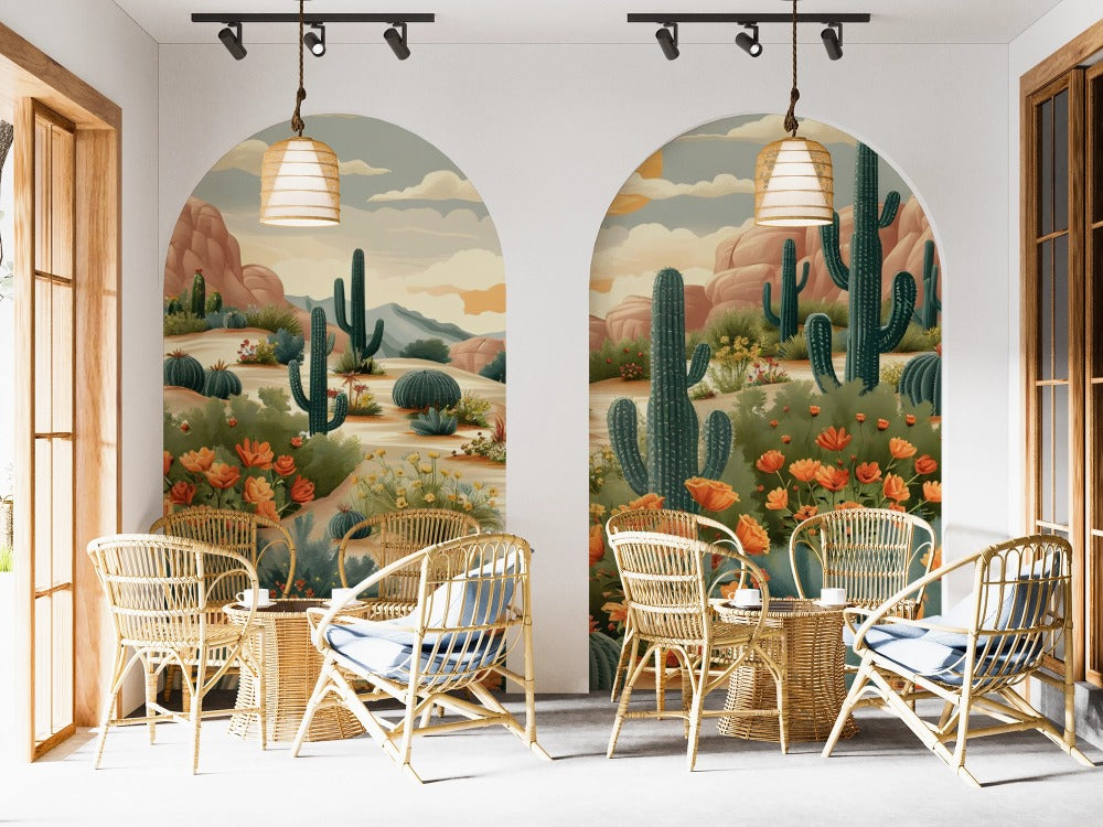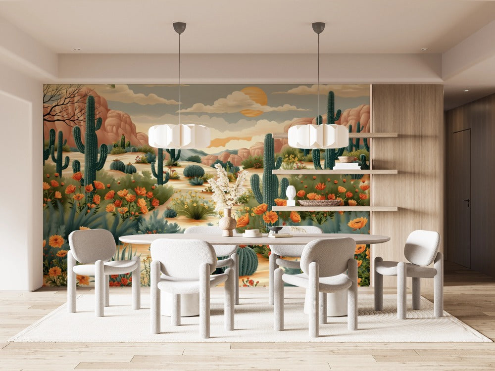 Transform your walls with the vibrant beauty of our desert bloom peel and stick wallpaper. This mural features tall saguaro cacti surrounded by golden and orange wildflowers, set against a backdrop of warm desert mountains and a glowing sunset sky. The design captures the spirit of the Southwest, bringing warmth, energy, and a natural touch of adventure into your home.