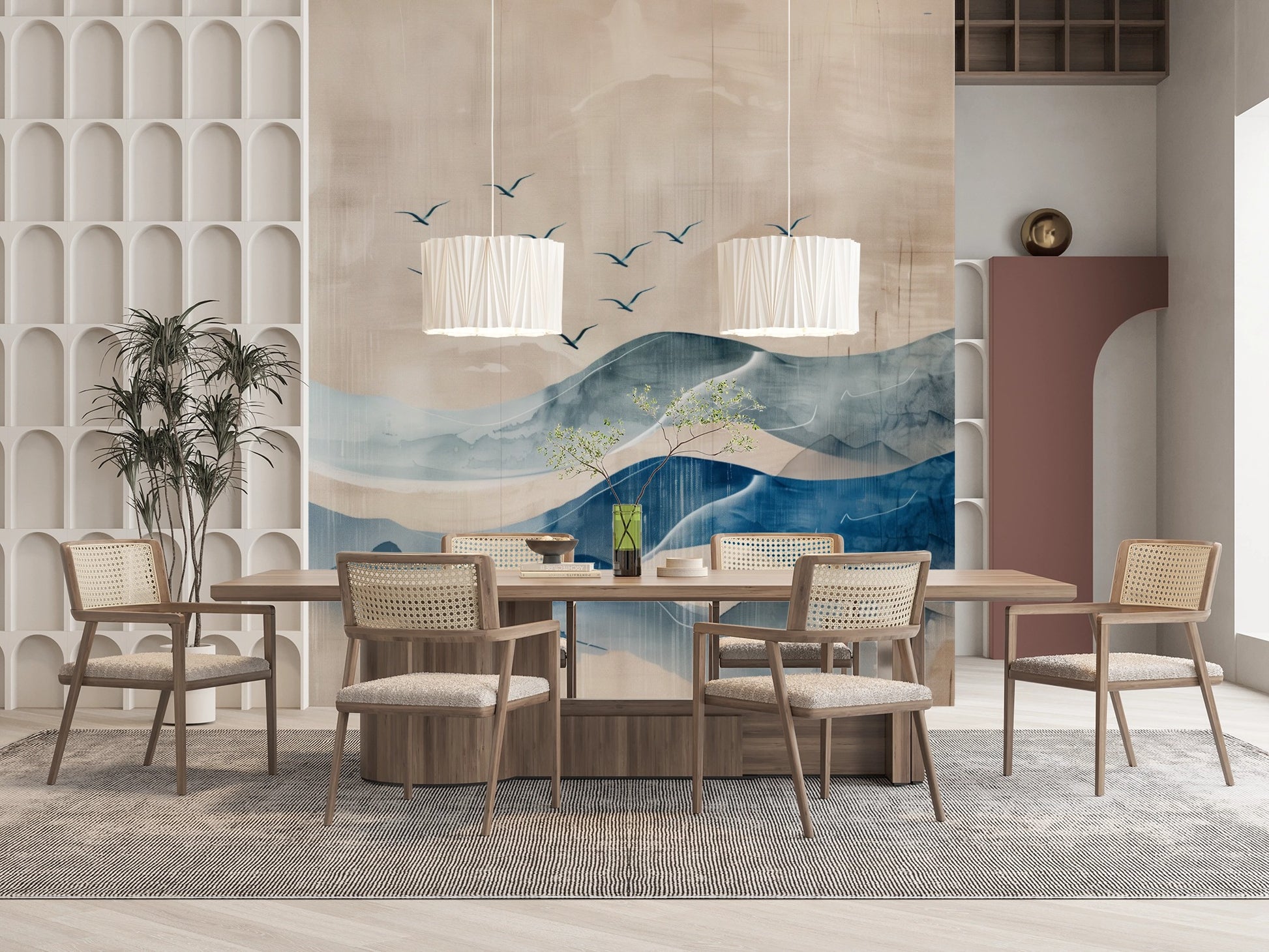 Mountains of Serenity: Abstract Blue Toned Art with Birds in Flight