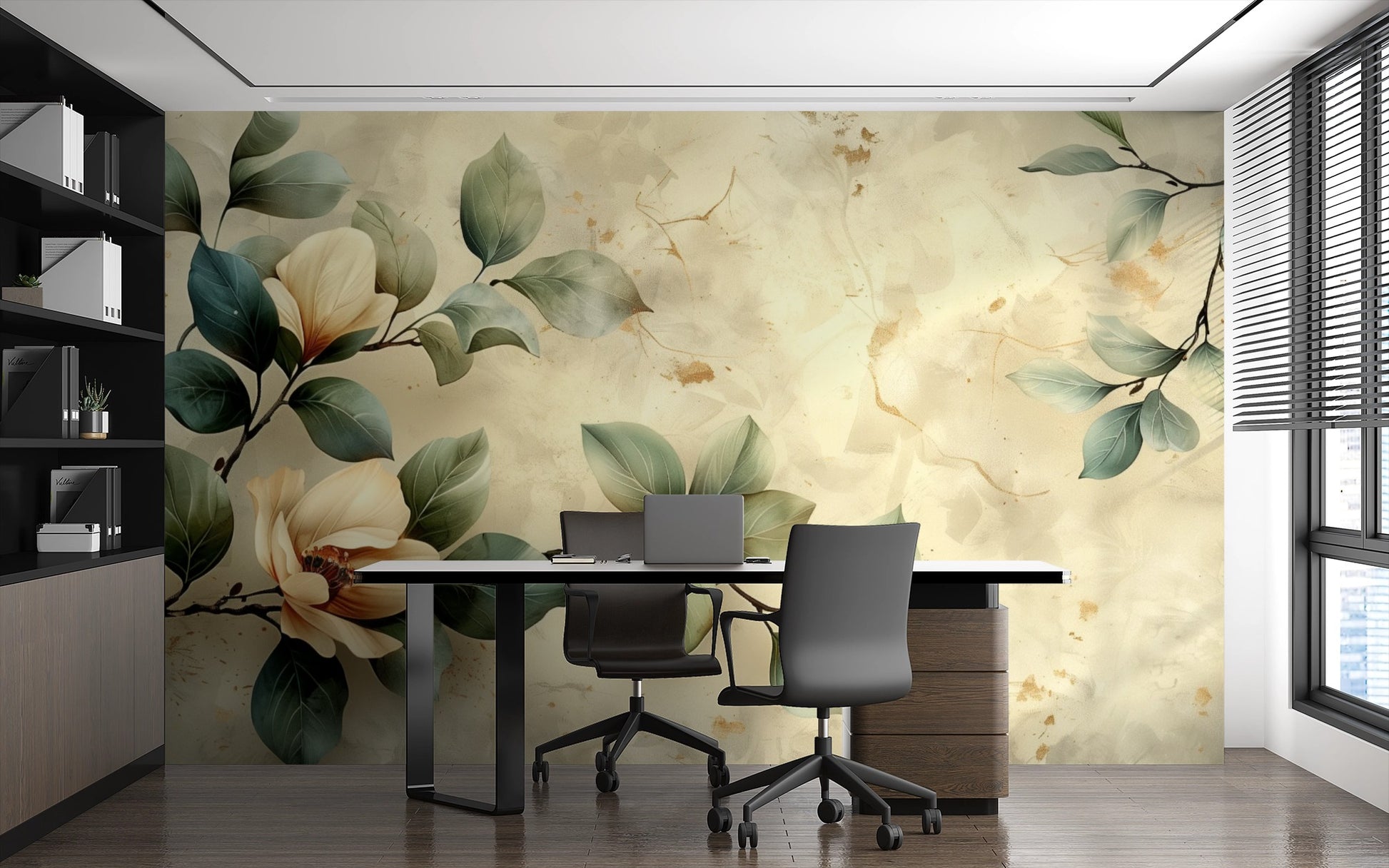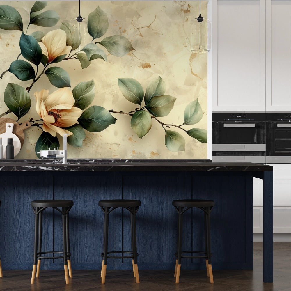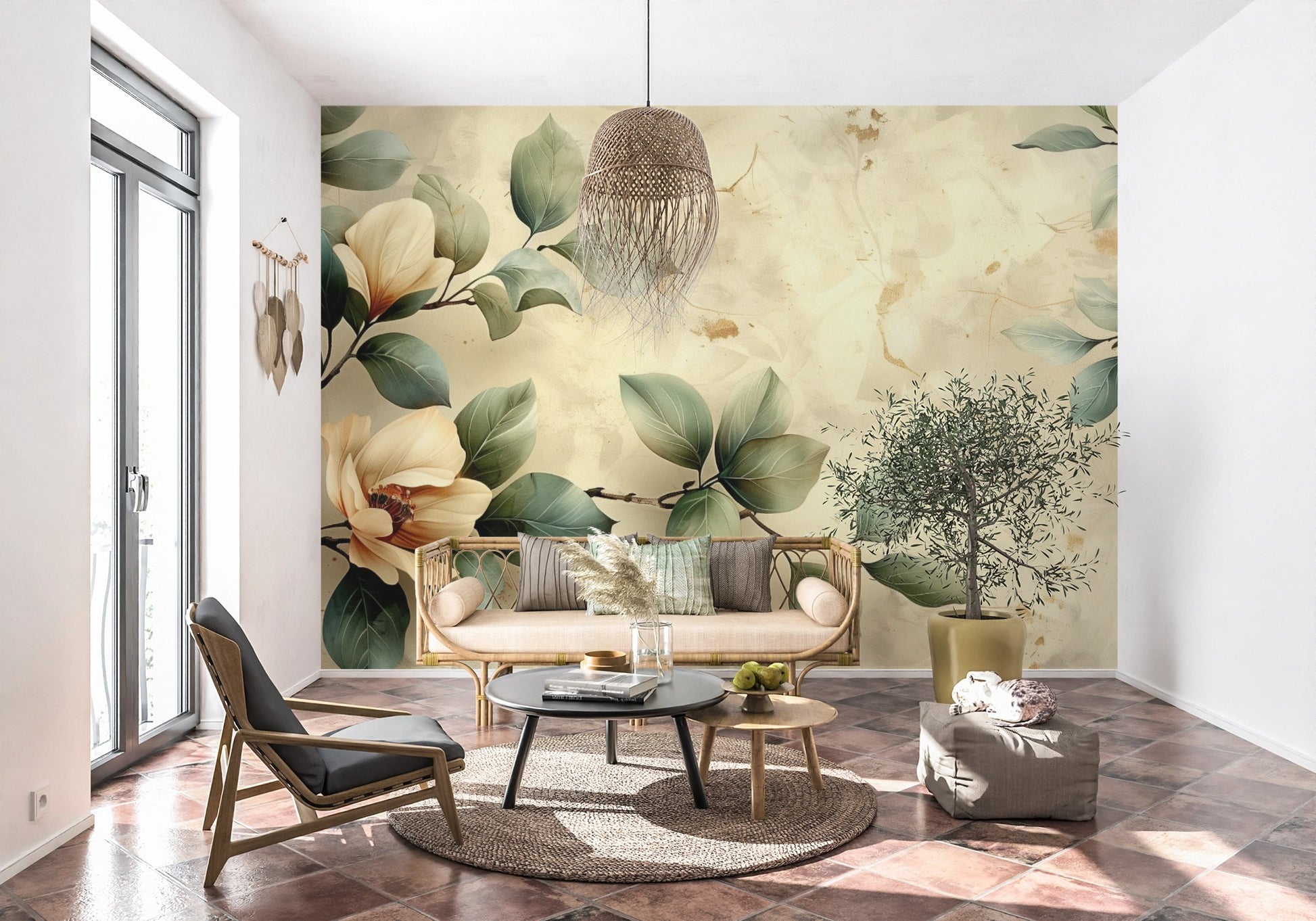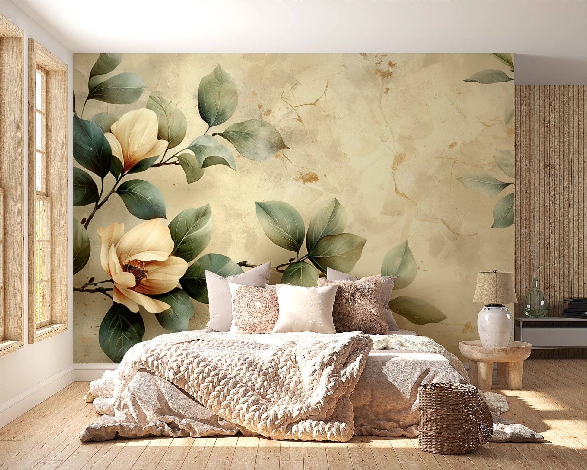 Add timeless elegance to your home with our vintage floral peel and stick wallpaper, featuring soft magnolia blooms and lush green leaves against a warm beige textured background. This mural combines classic sophistication with natural beauty, creating a calming and luxurious atmosphere for bedrooms, living rooms, dining areas, or entryways.