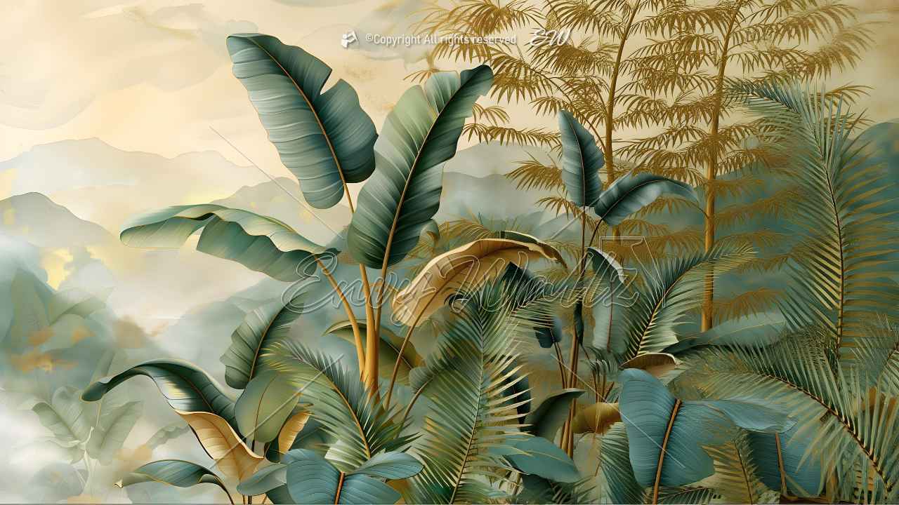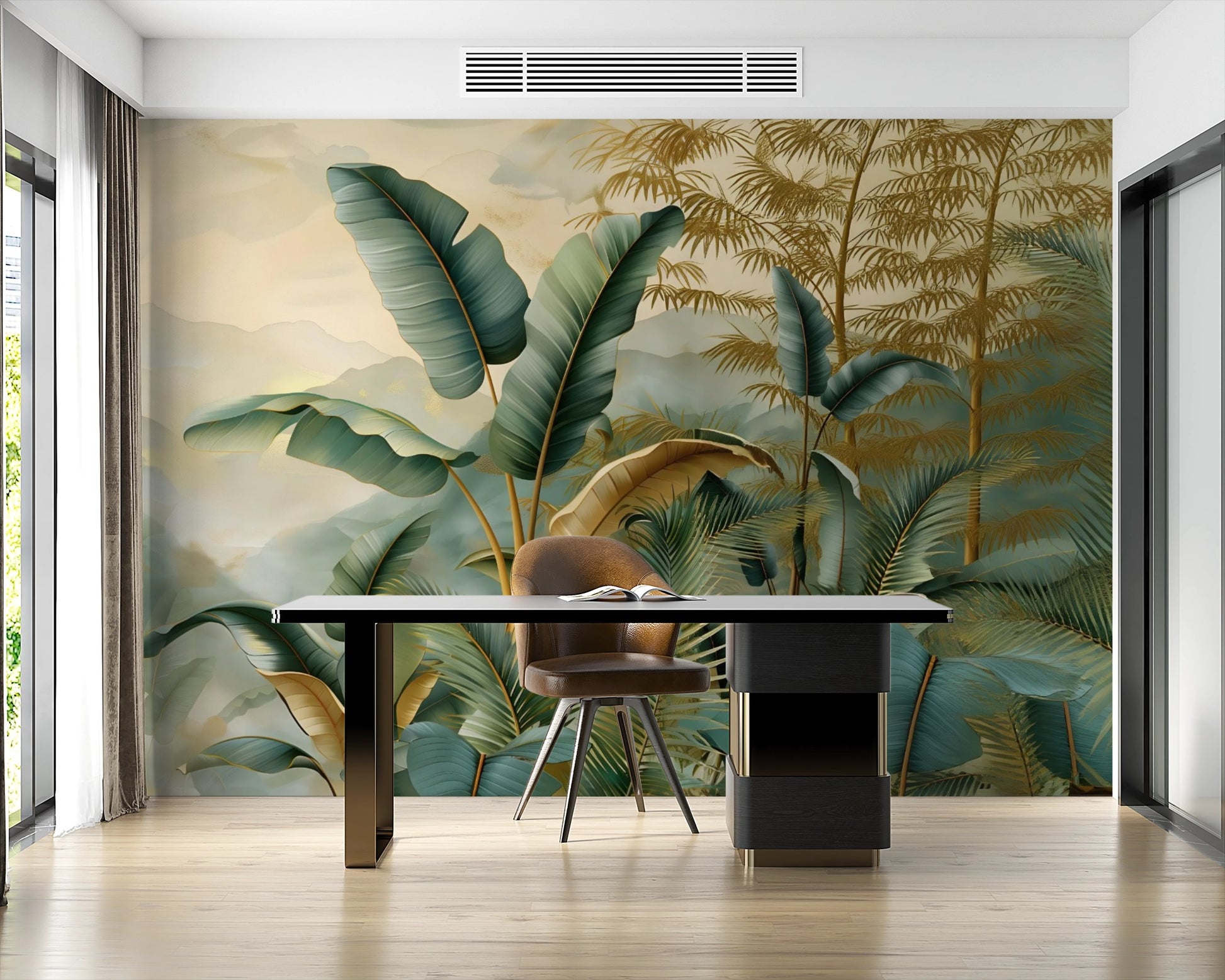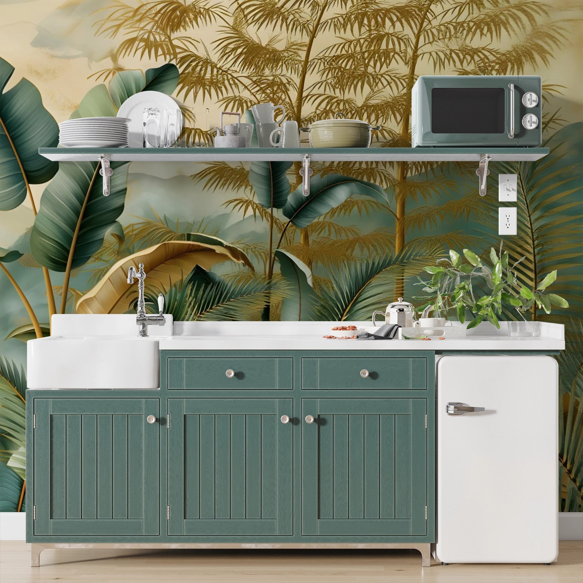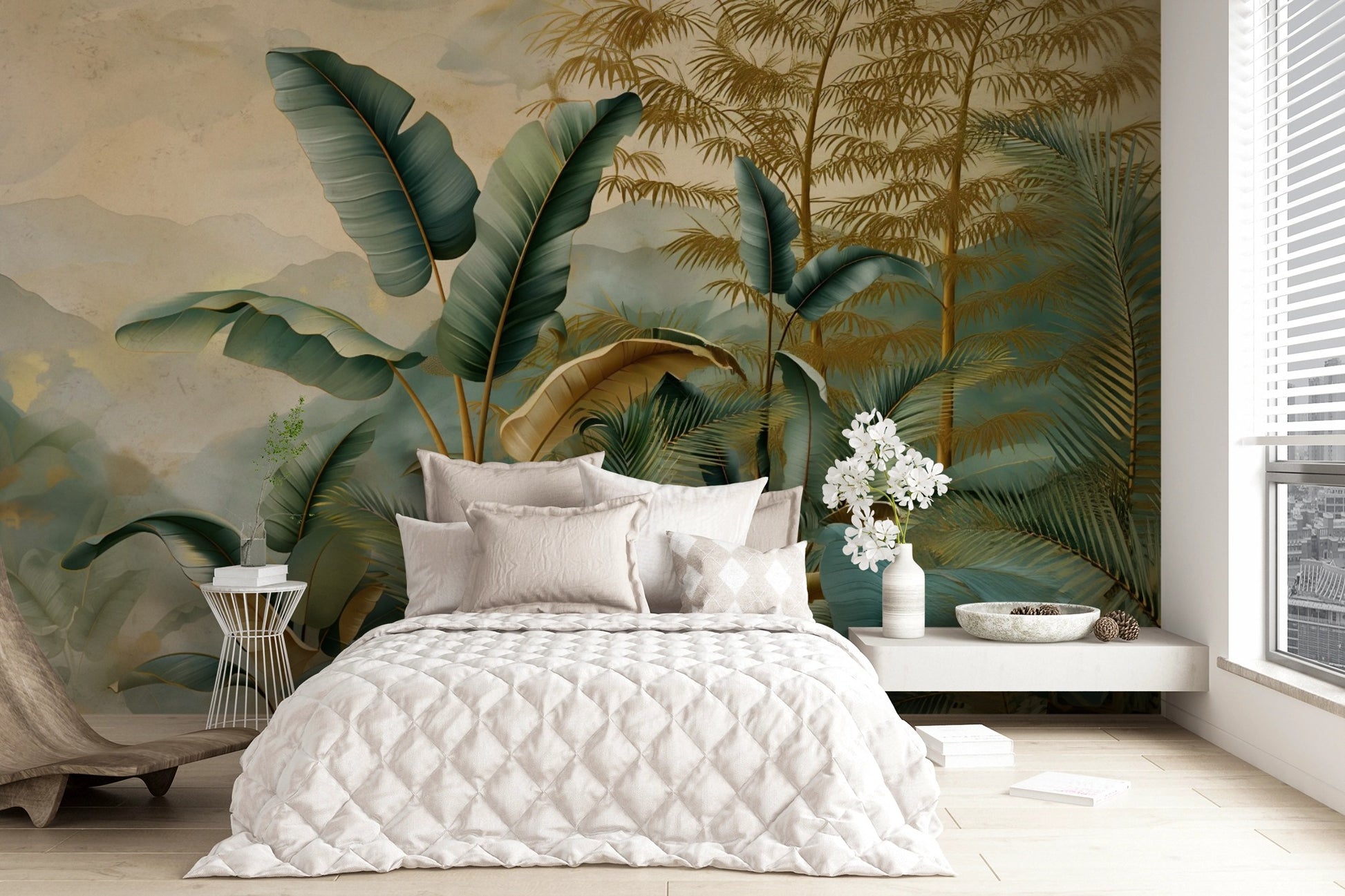 Escape into the beauty of nature with our tropical jungle peel and stick wallpaper. Featuring oversized banana leaves, delicate palms, and golden bamboo set against a misty mountain backdrop, this mural captures the magic of an exotic rainforest. Its warm earthy tones and layered depth bring richness and tranquility, making it perfect for living rooms, bedrooms, dining spaces, or offices seeking a luxurious natural vibe.