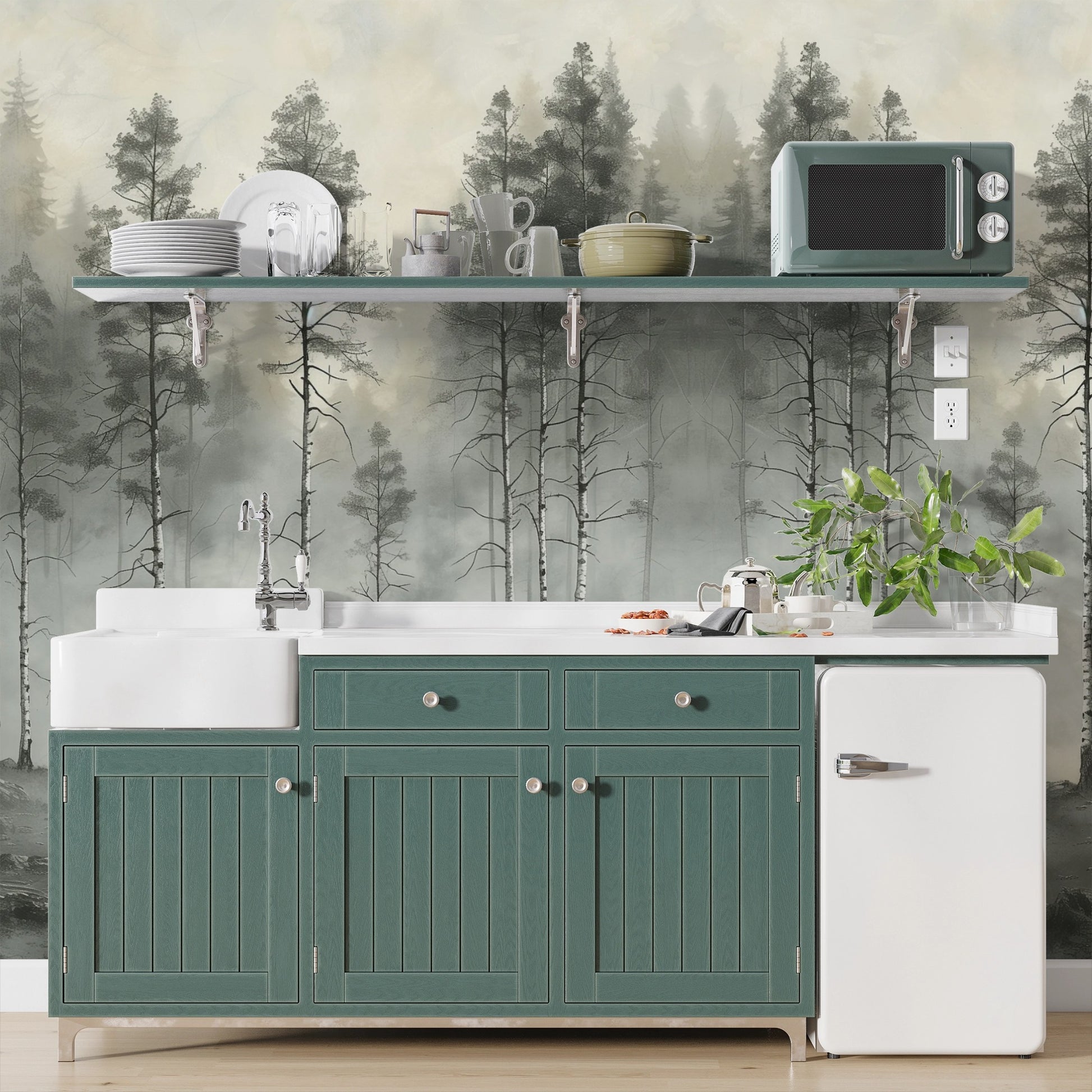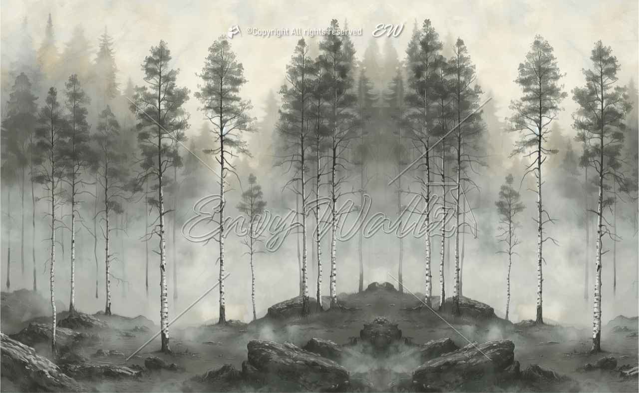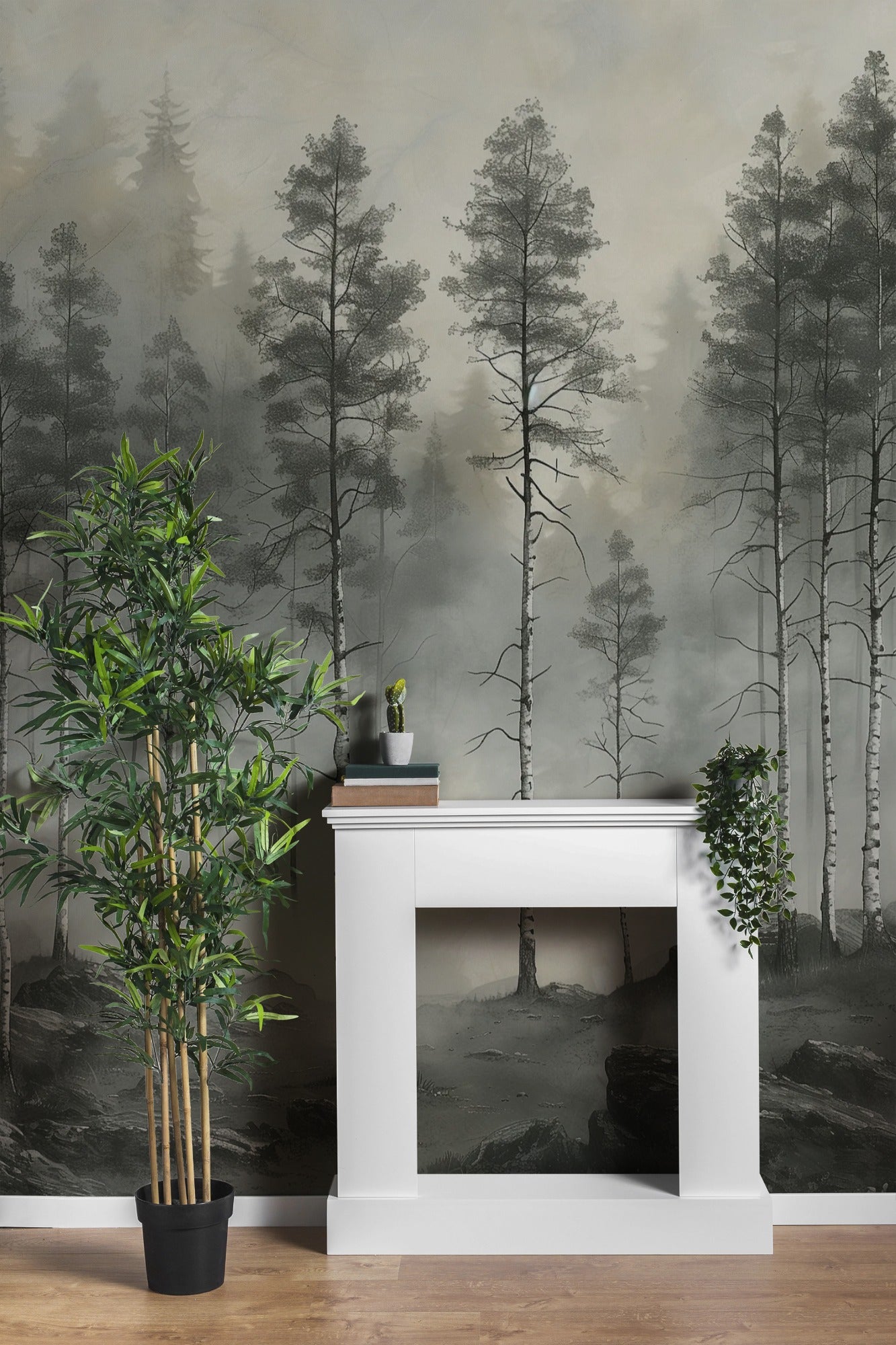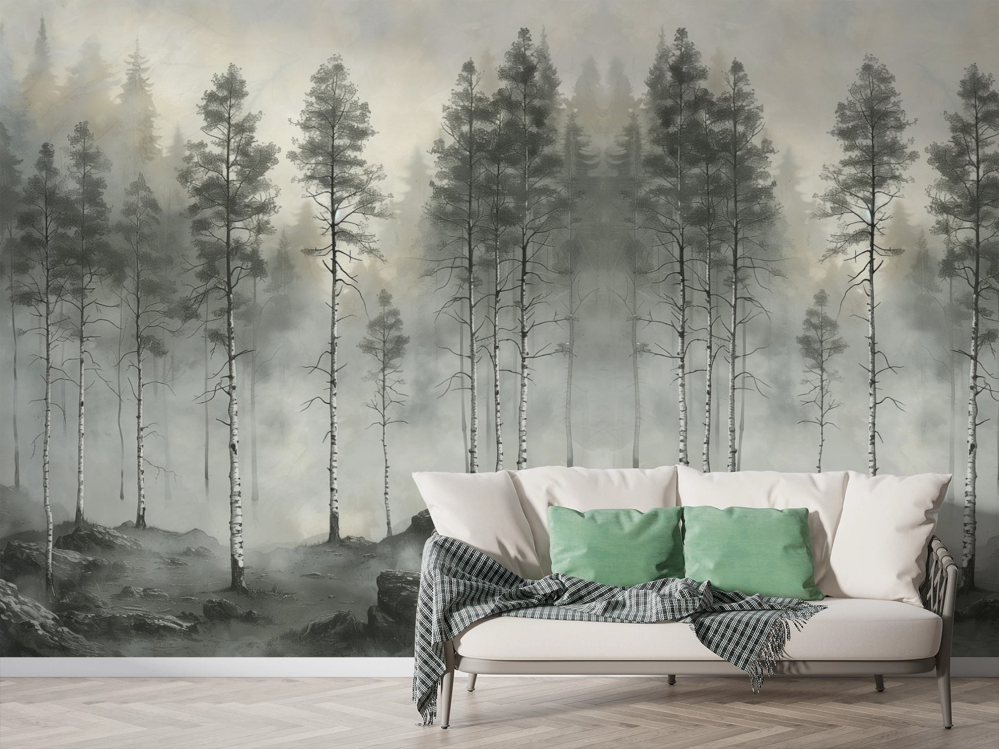 Bring the calming beauty of nature indoors with our misty forest peel and stick wallpaper. Featuring tall birch trees rising through a veil of fog over rugged stone terrain, this mural creates a serene and atmospheric escape. Its grayscale palette with soft highlights adds depth and sophistication, making it ideal for bedrooms, living rooms, offices, or creative spaces that crave a dramatic yet tranquil touch.