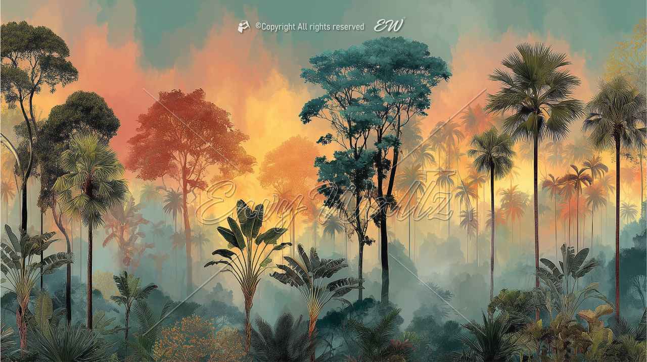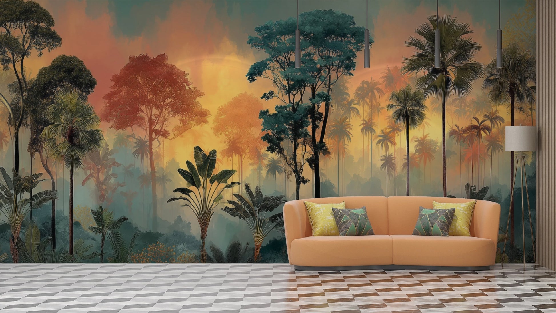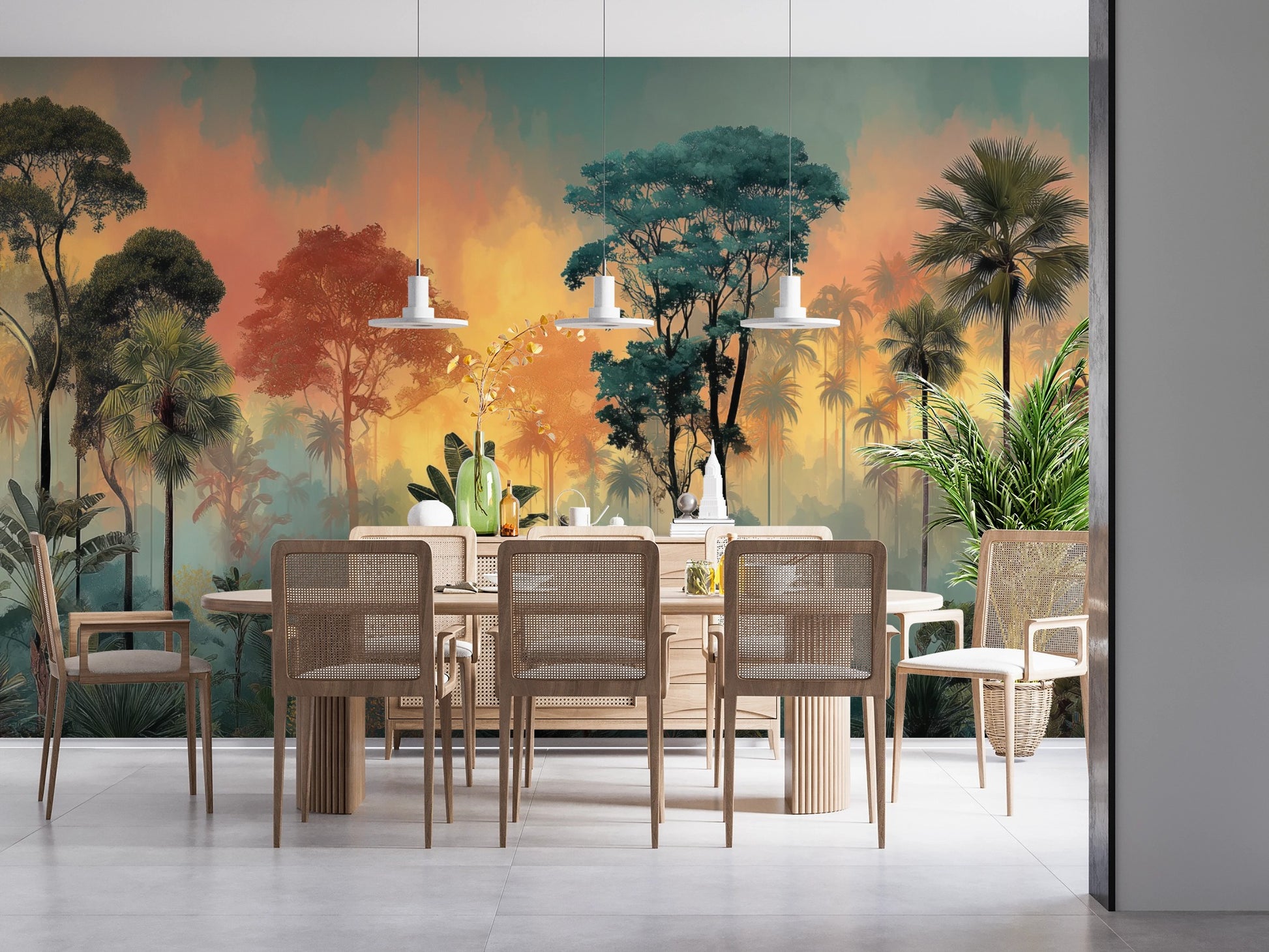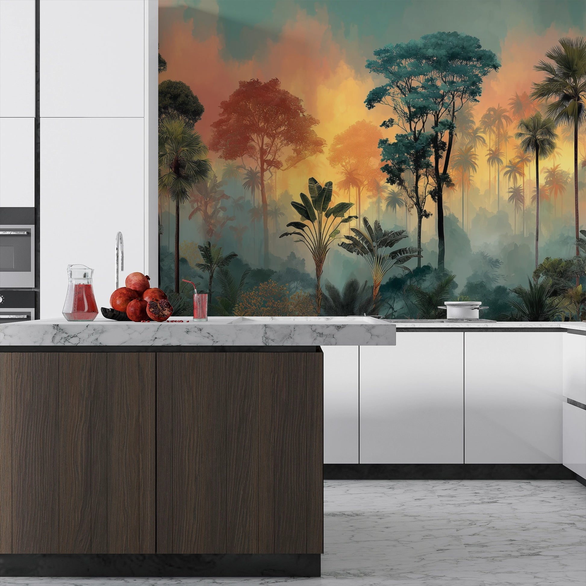 Bring the magic of the tropics into your home with our tropical rainforest peel and stick wallpaper mural. This stunning design captures the beauty of a sunset jungle, with lush palm trees and tall rainforest canopies painted in vibrant shades of green, red, and gold. The dramatic sky glows with warm hues, transforming any wall into a breathtaking work of art.