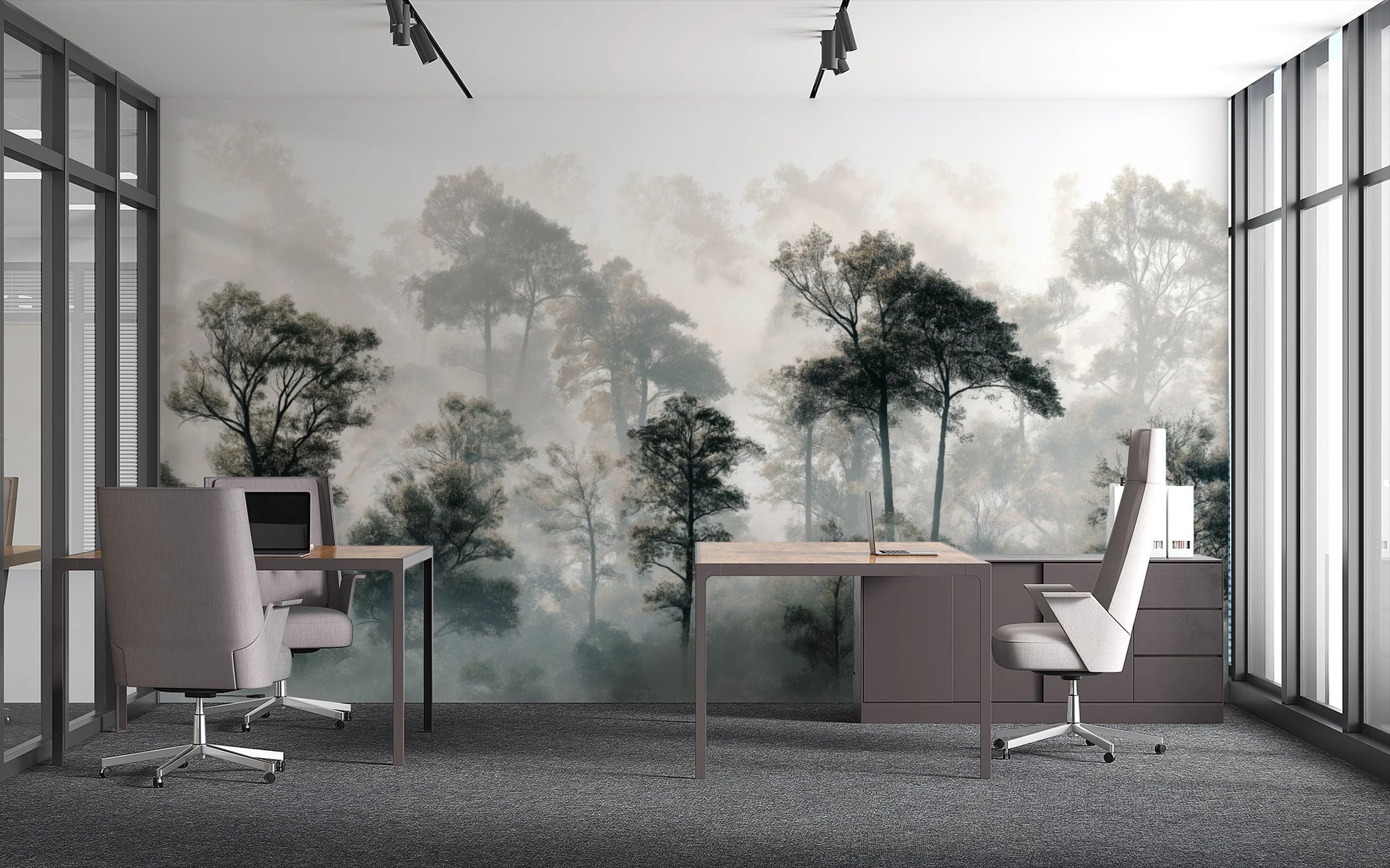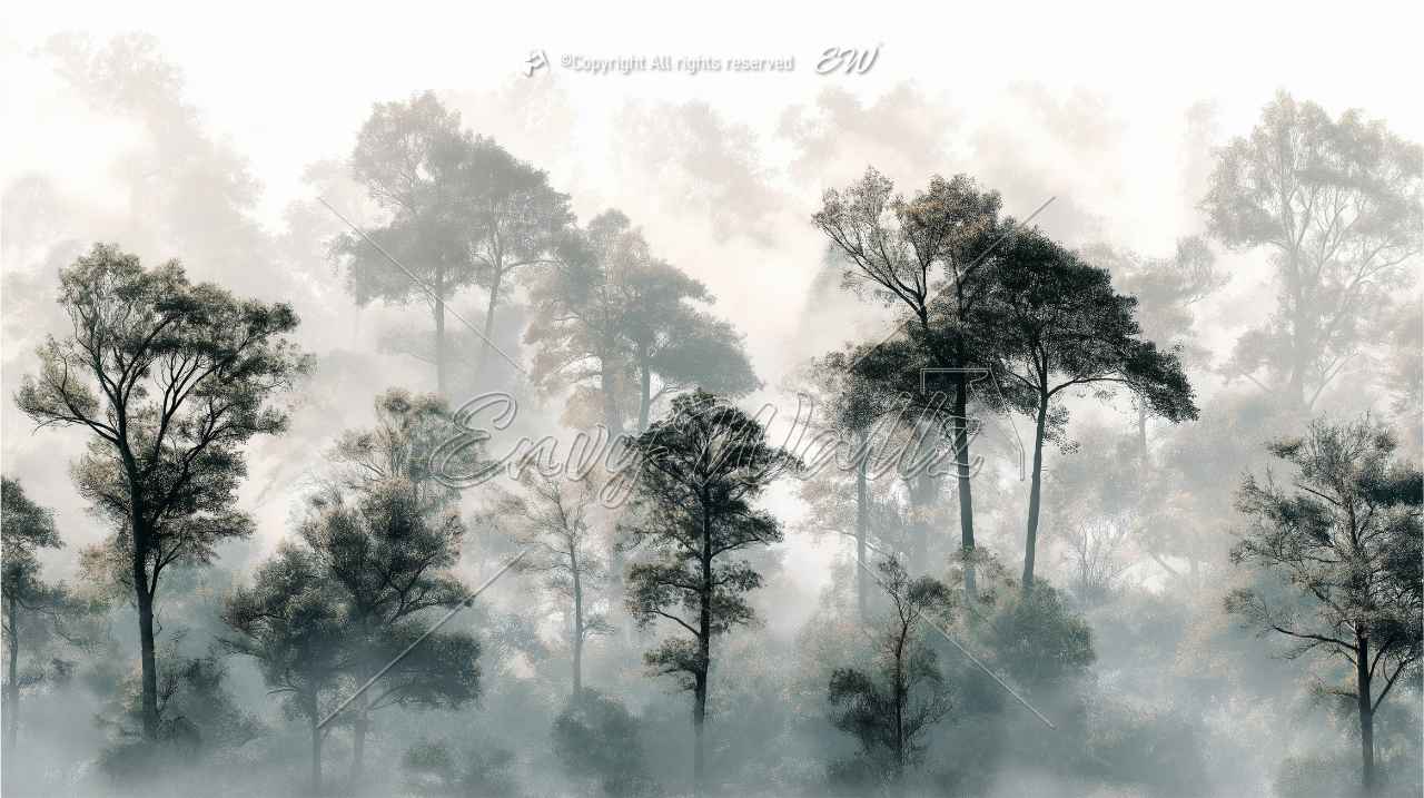 Bring serenity to your home with this peel and stick mural of a misty forest. Its soft, realistic tones create a soothing and refreshing atmosphere, perfect for bedrooms, living rooms, or relaxation spaces seeking natural elegance.
