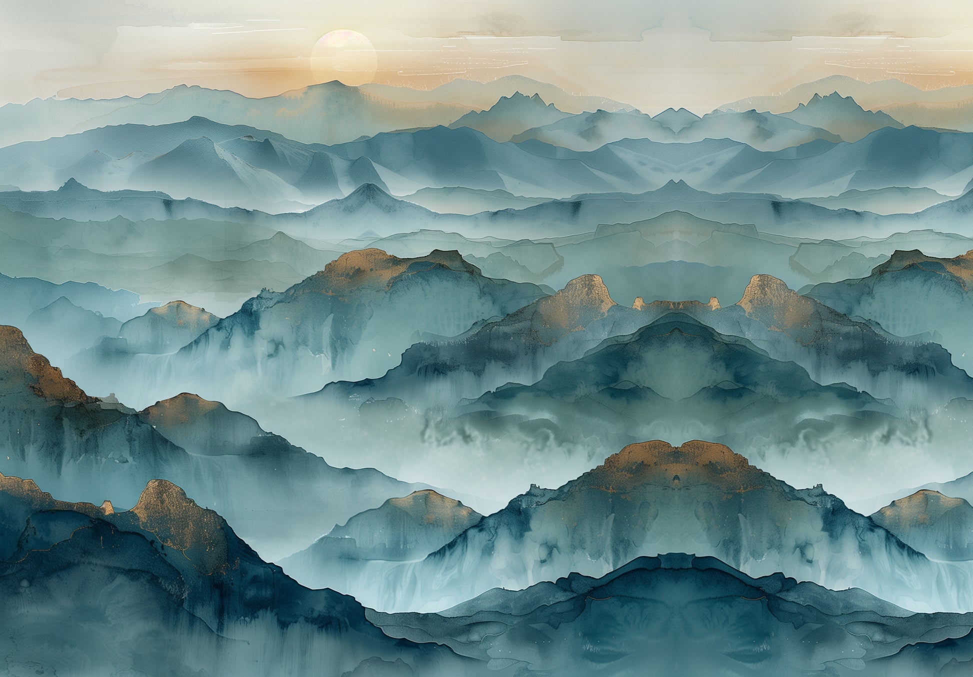 This wall mural depicts a serene mountain landscape composed of softly layered ridgelines fading into atmospheric mist. Overlapping mountain forms unfold in calming tones of blue-gray, slate, sage, and muted teal, with subtle accents of warm sand and antique gold along select peaks. The watercolor-inspired textures and gentle gradation of depth create a sense of distance, balance, and quiet movement without harsh contrast. A softly diffused sun rests above the horizon, enhancing the tranquil mood and reinforcing the mural’s natural, meditative quality. Ideal for living rooms, bedrooms, offices, wellness spaces, or upscale commercial interiors, this design offers a timeless landscape statement rooted in calm, openness, and refined simplicity.