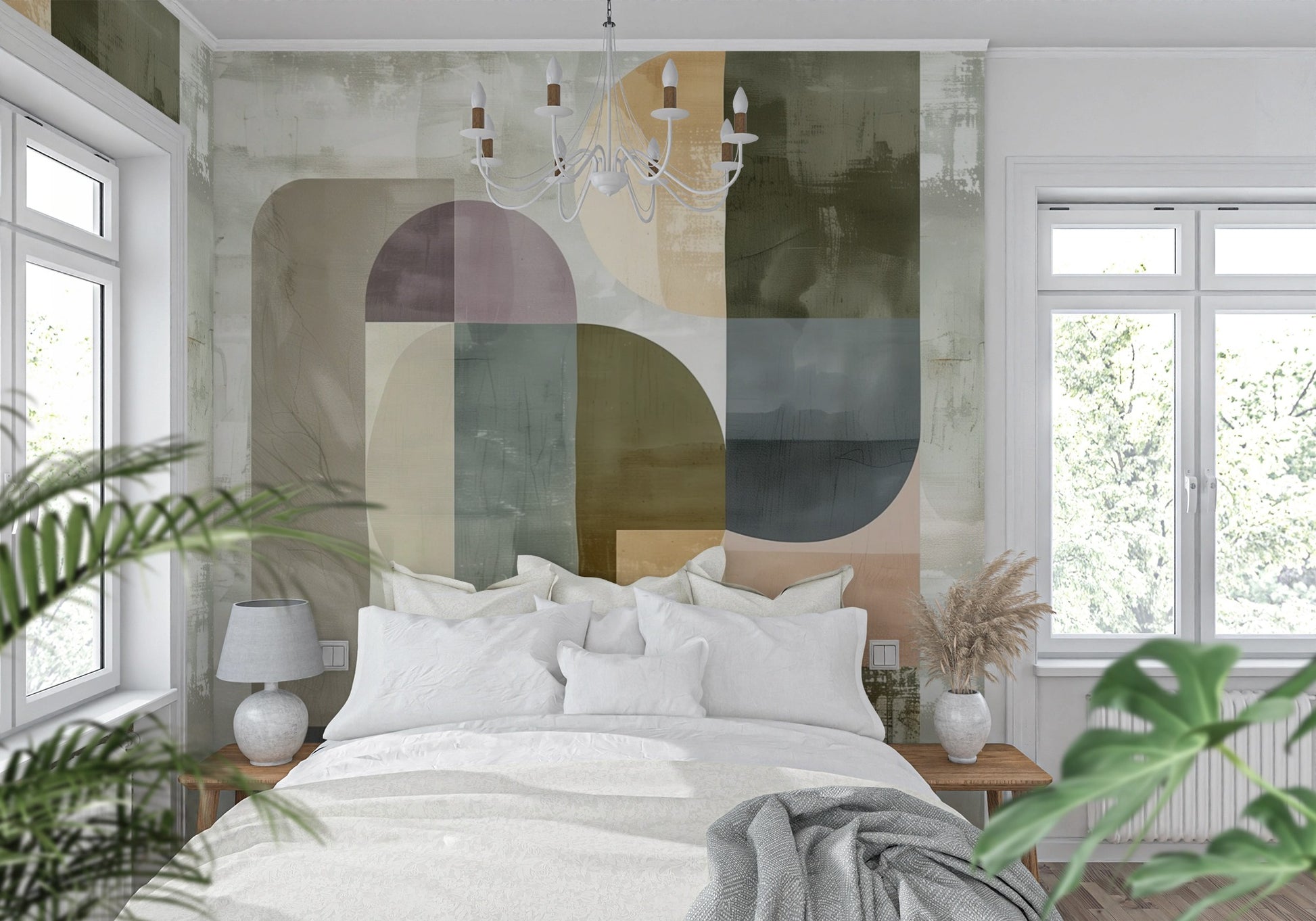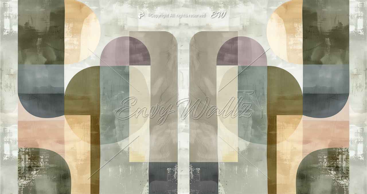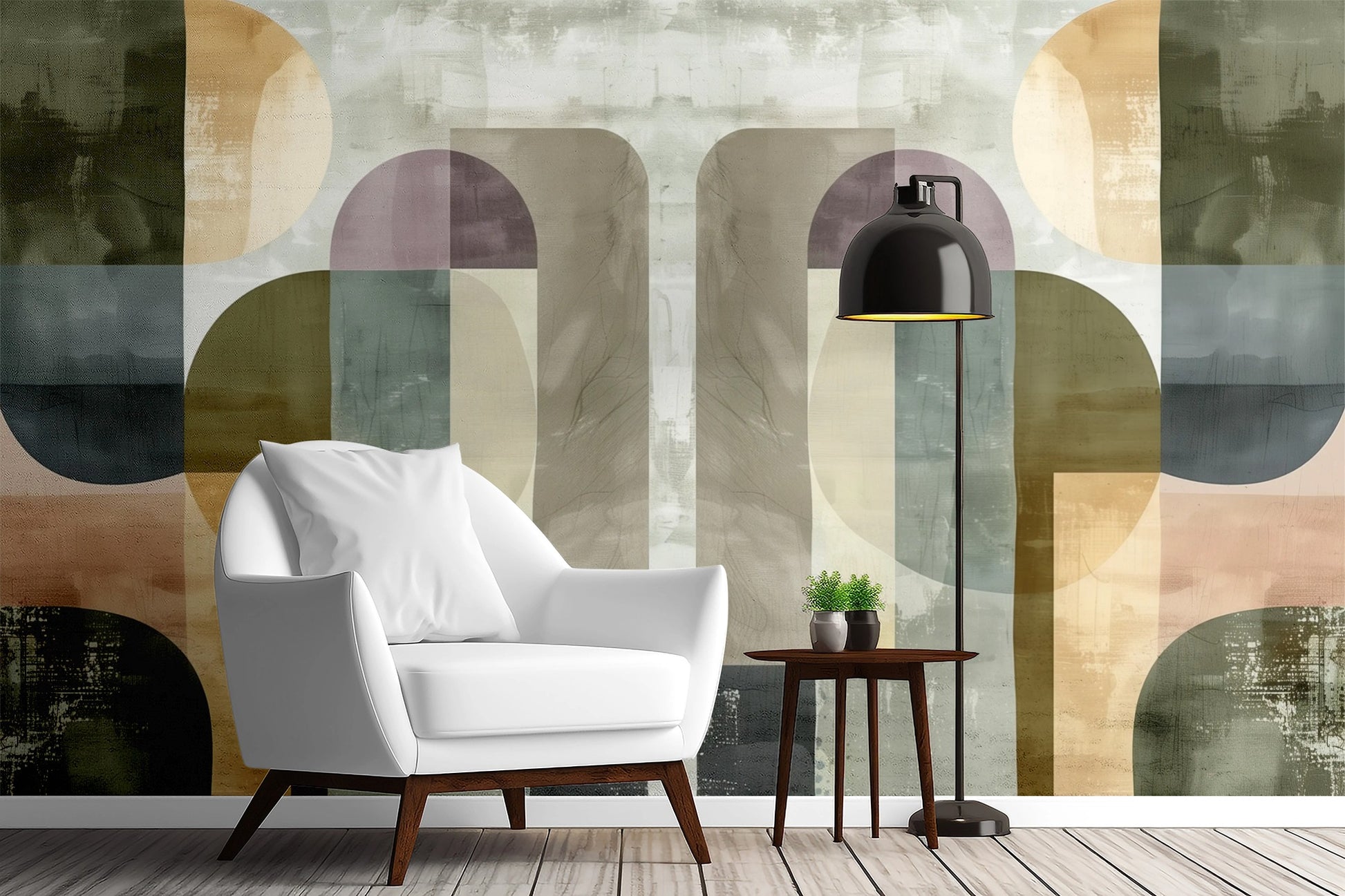 Transform your space with our geometric abstract peel and stick wallpaper mural, designed with overlapping shapes in calming tones of beige, sage green, gray, and soft mauve. This modern wall art creates a sophisticated balance, perfect for contemporary interiors, offices, or creative spaces.