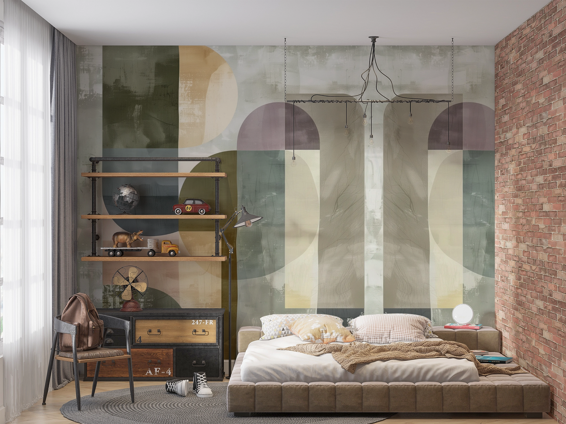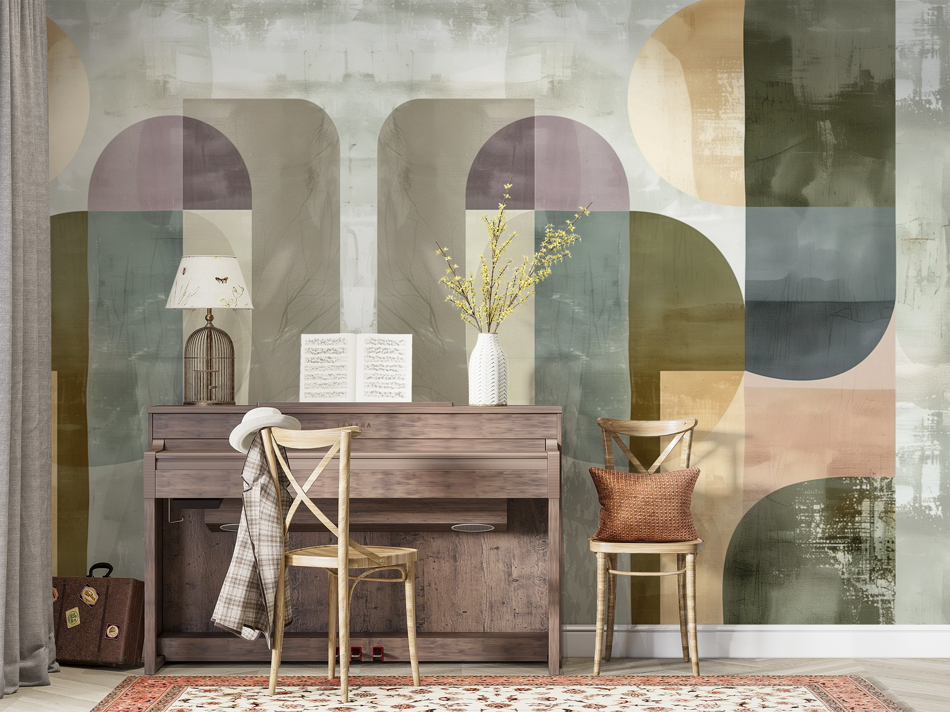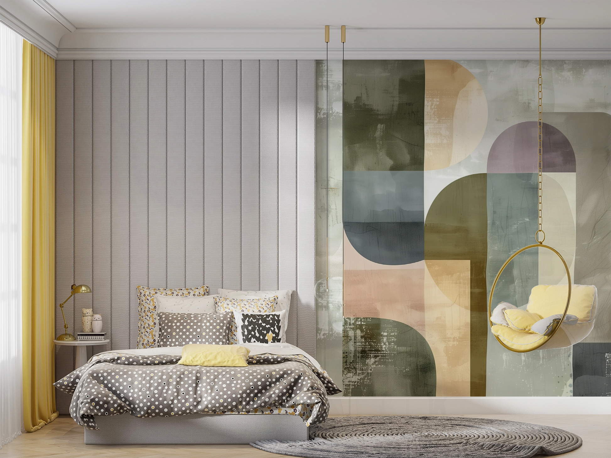 Transform your space with our geometric abstract peel and stick wallpaper mural, designed with overlapping shapes in calming tones of beige, sage green, gray, and soft mauve. This modern wall art creates a sophisticated balance, perfect for contemporary interiors, offices, or creative spaces.