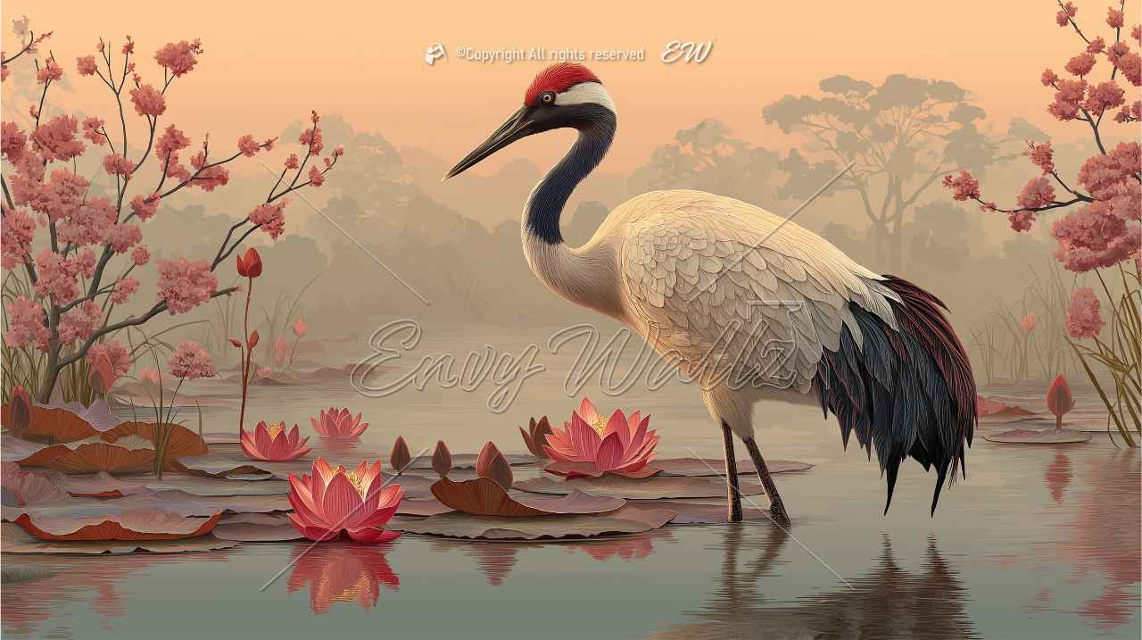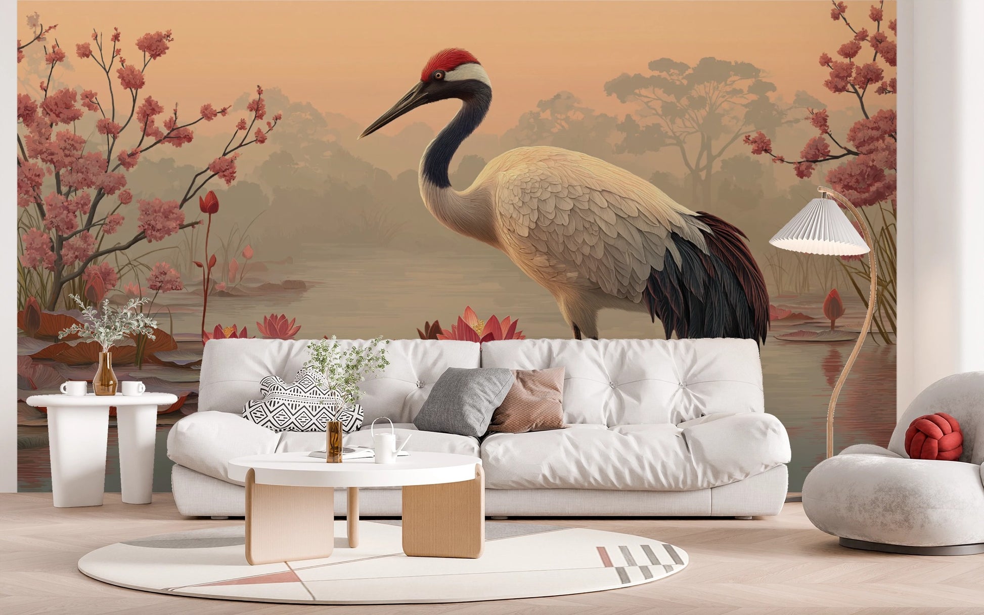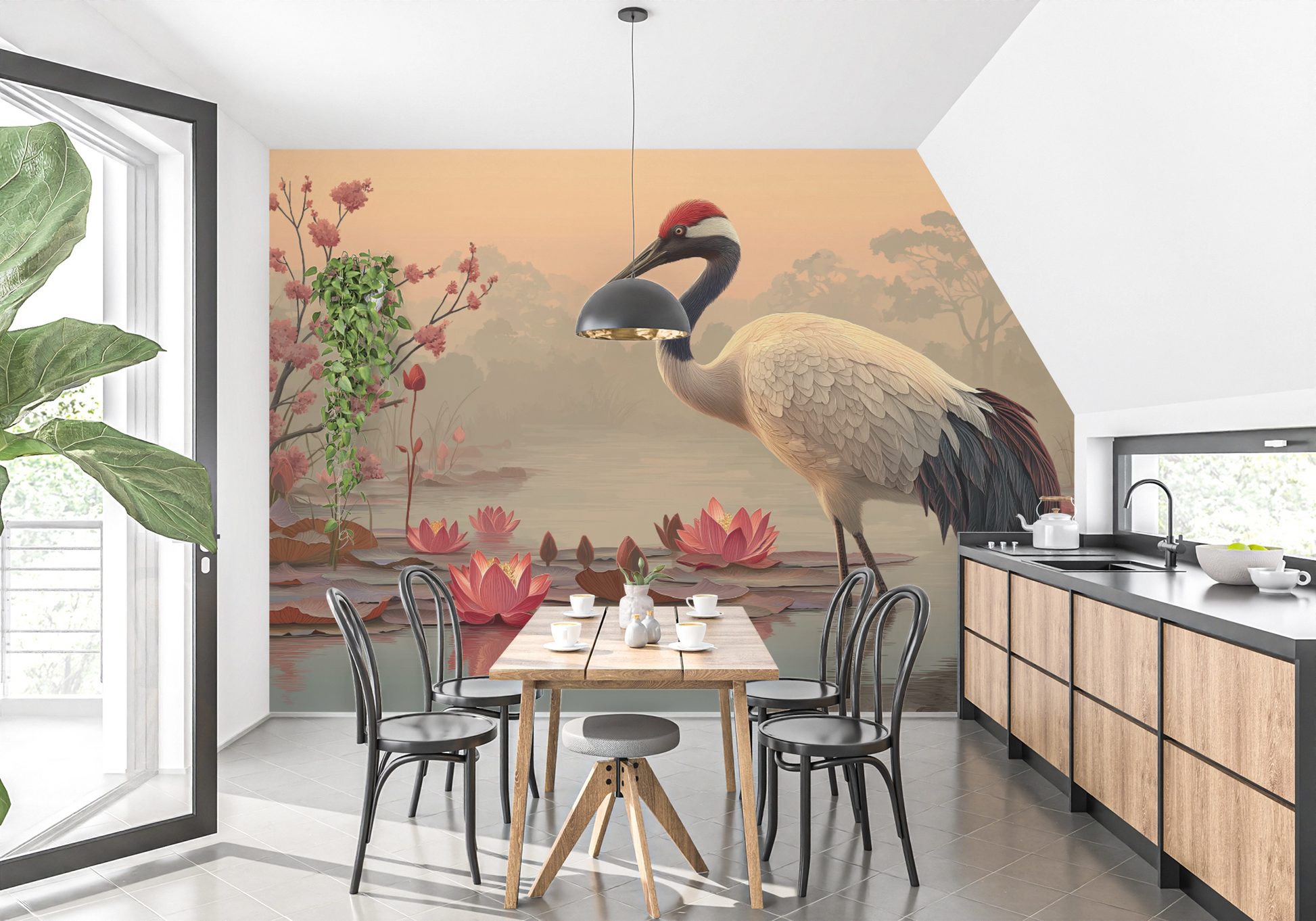 Oriental Crane with Water Lilies Wall Mural - Tranquil Nature Design