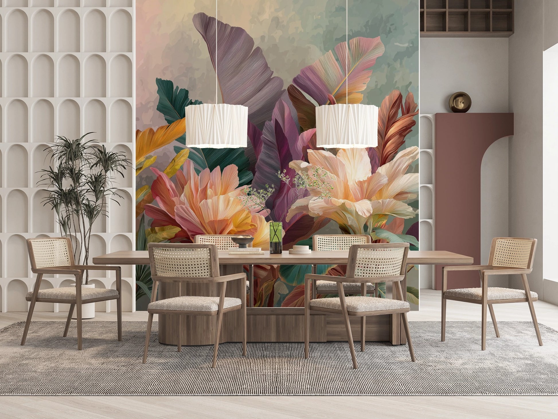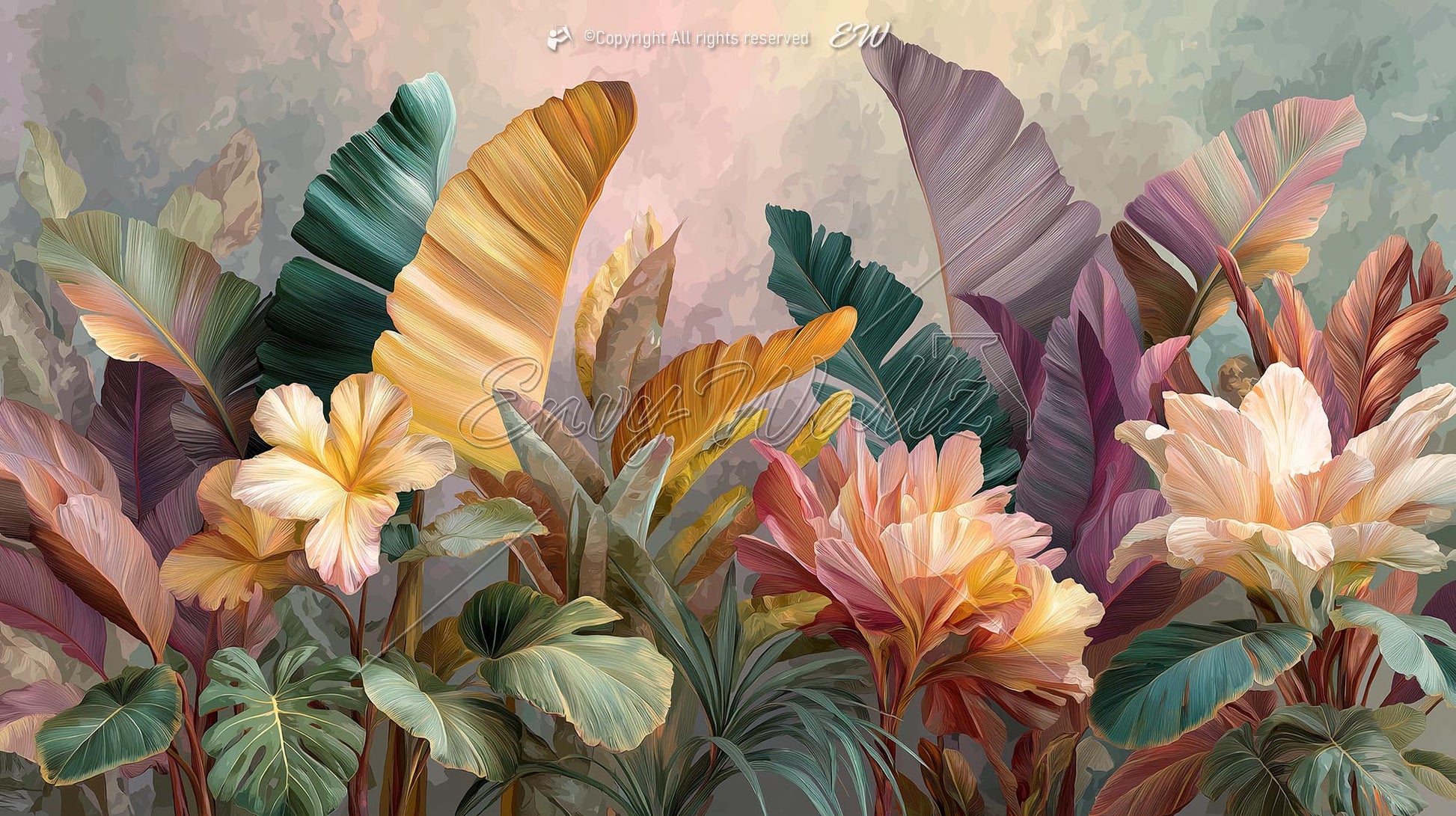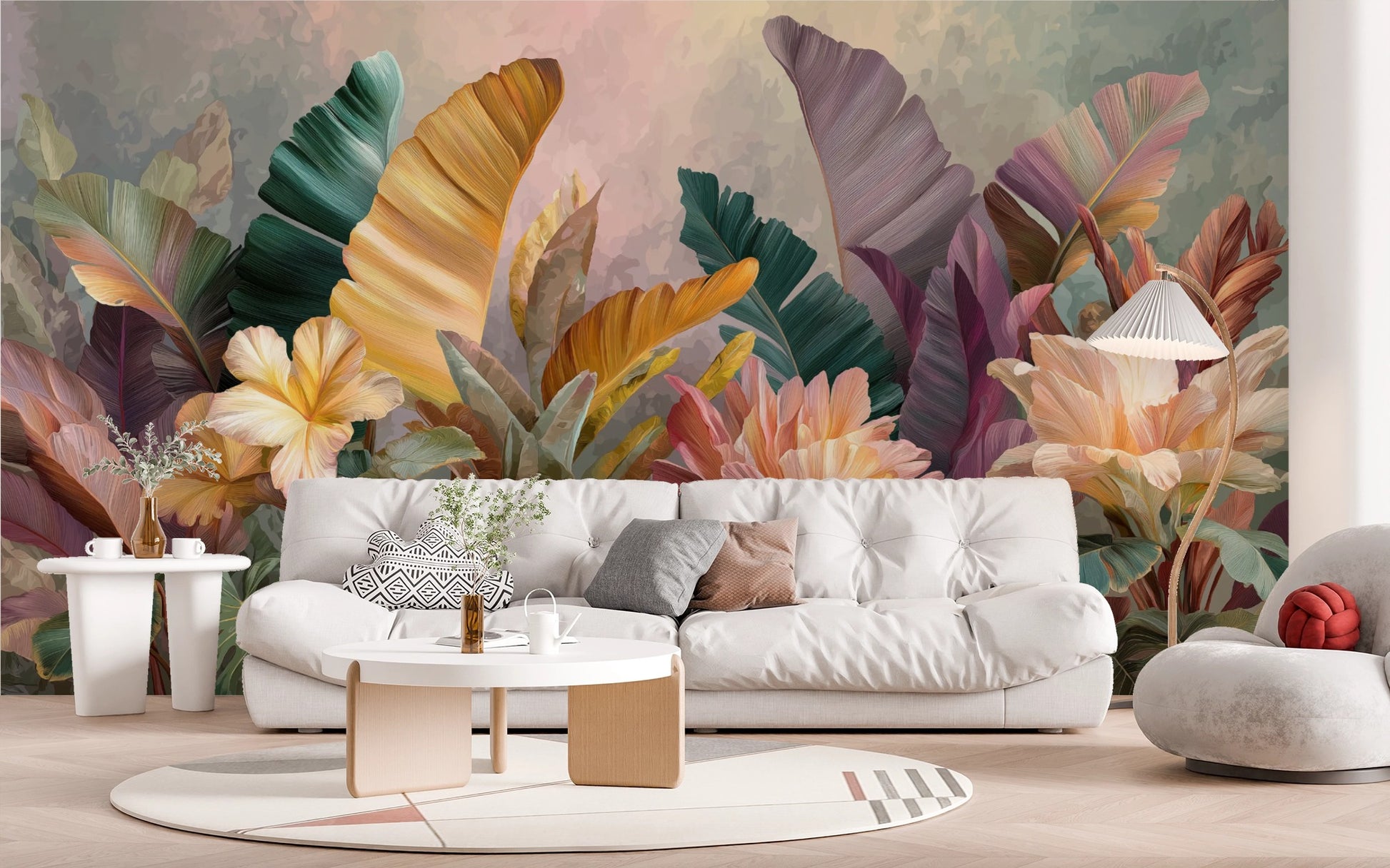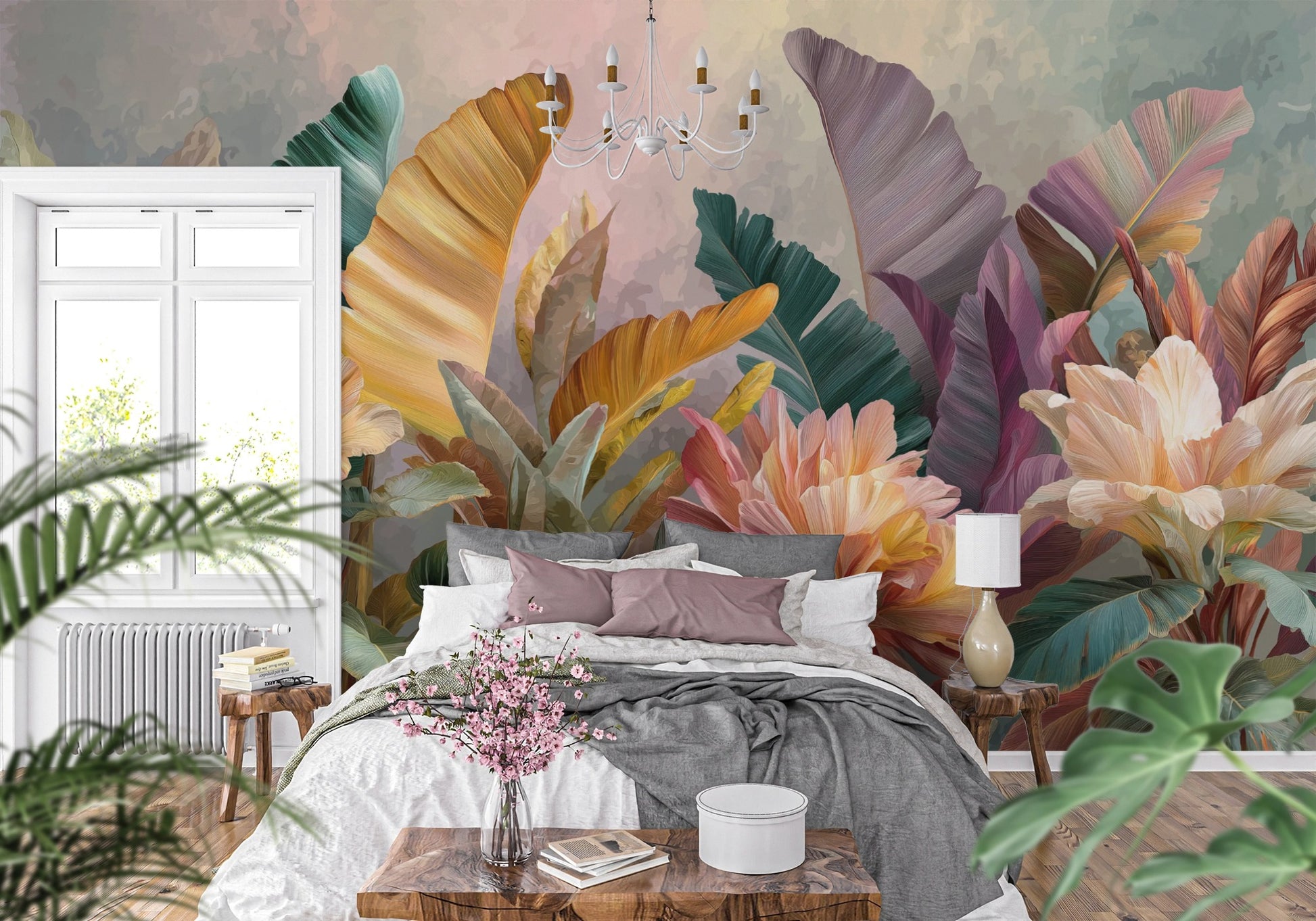 This self adhesive wallpaper showcases a lush pastel botanical scene. Large banana, calathea and palm leaves unfurl in shades of emerald, dusty pink, soft gold and lavender. The interplay of textures and shadows adds depth, evoking a tropical garden bathed in dawn light. The composition pairs exotic flowers with broad leaves, conveying warmth and serenity. Ideal for living rooms, bedrooms or studios, this mural turns any space into a tranquil oasis of colour.