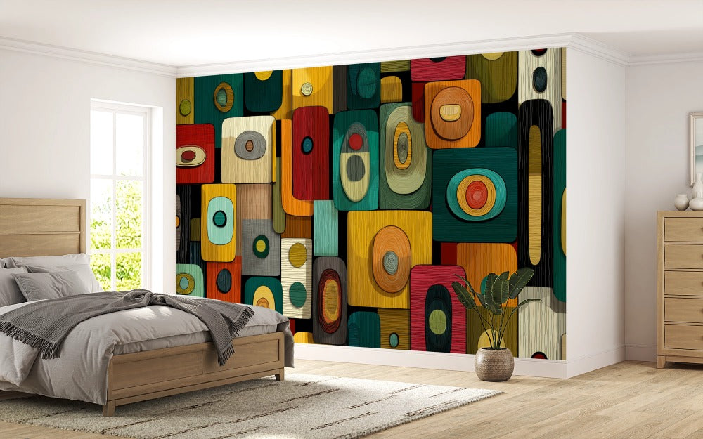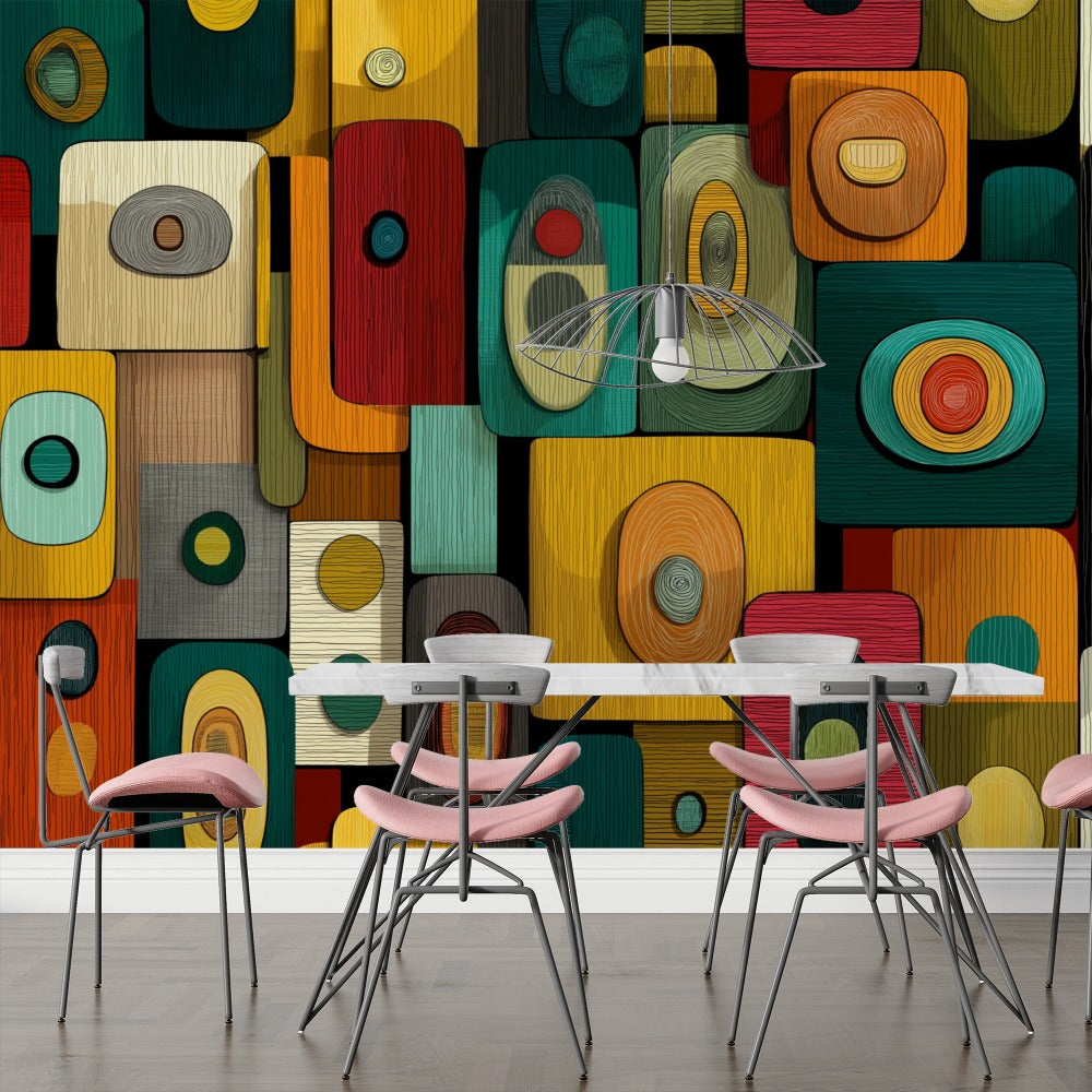 This peel and stick wallpaper features a bold geometric design inspired by mid century modern aesthetics. Rectangular and oval blocks are arranged in a vibrant palette mustard, teal, emerald green, red and orange accented by wood grain textures. Overlapping shapes create a dynamic, retro effect that brings character and personality to any space. Perfect for accent walls in living rooms, dining rooms, studios or hallways, this wallpaper adds an artistic, nostalgic touch to contemporary décor.