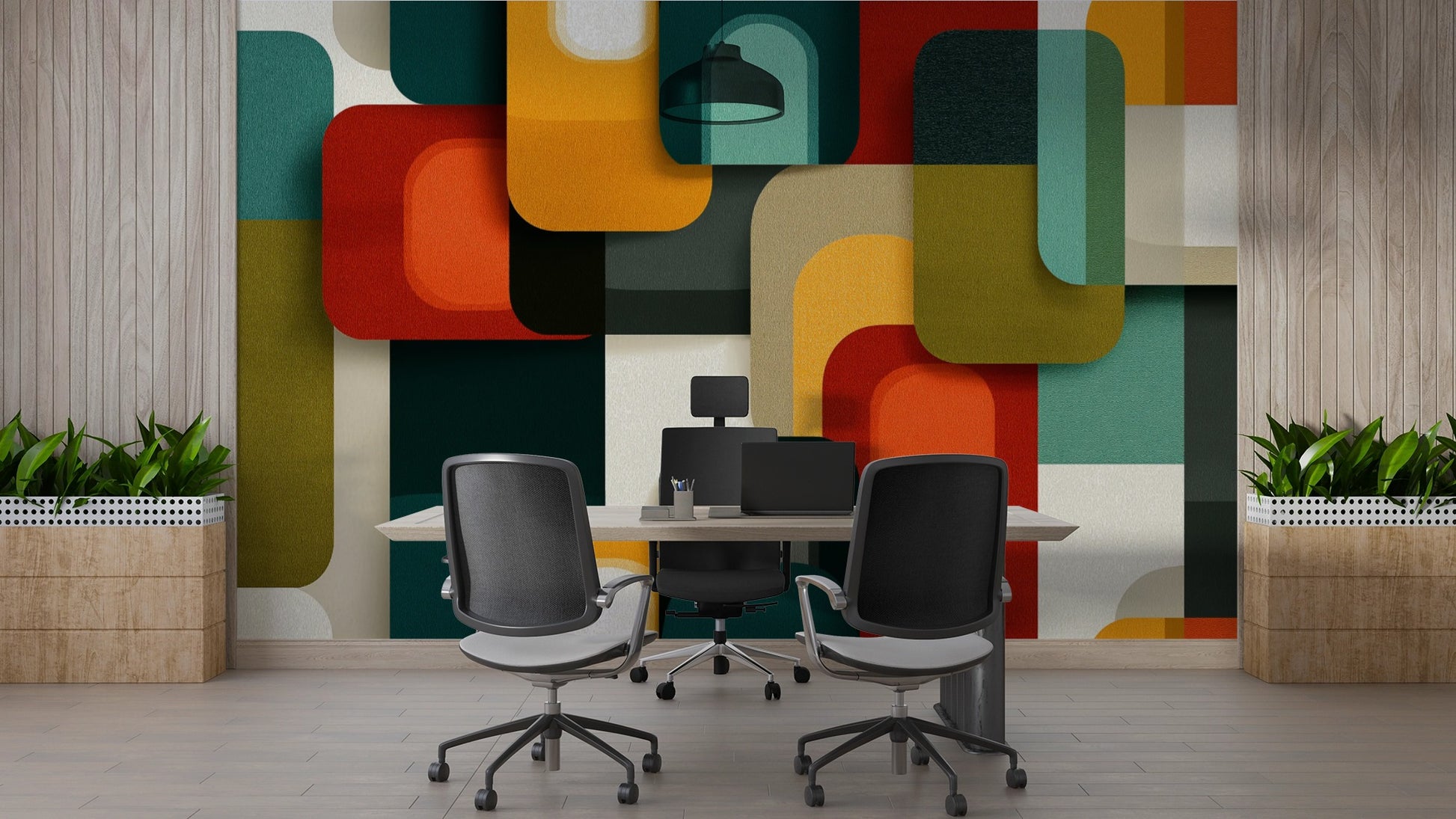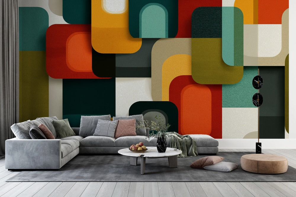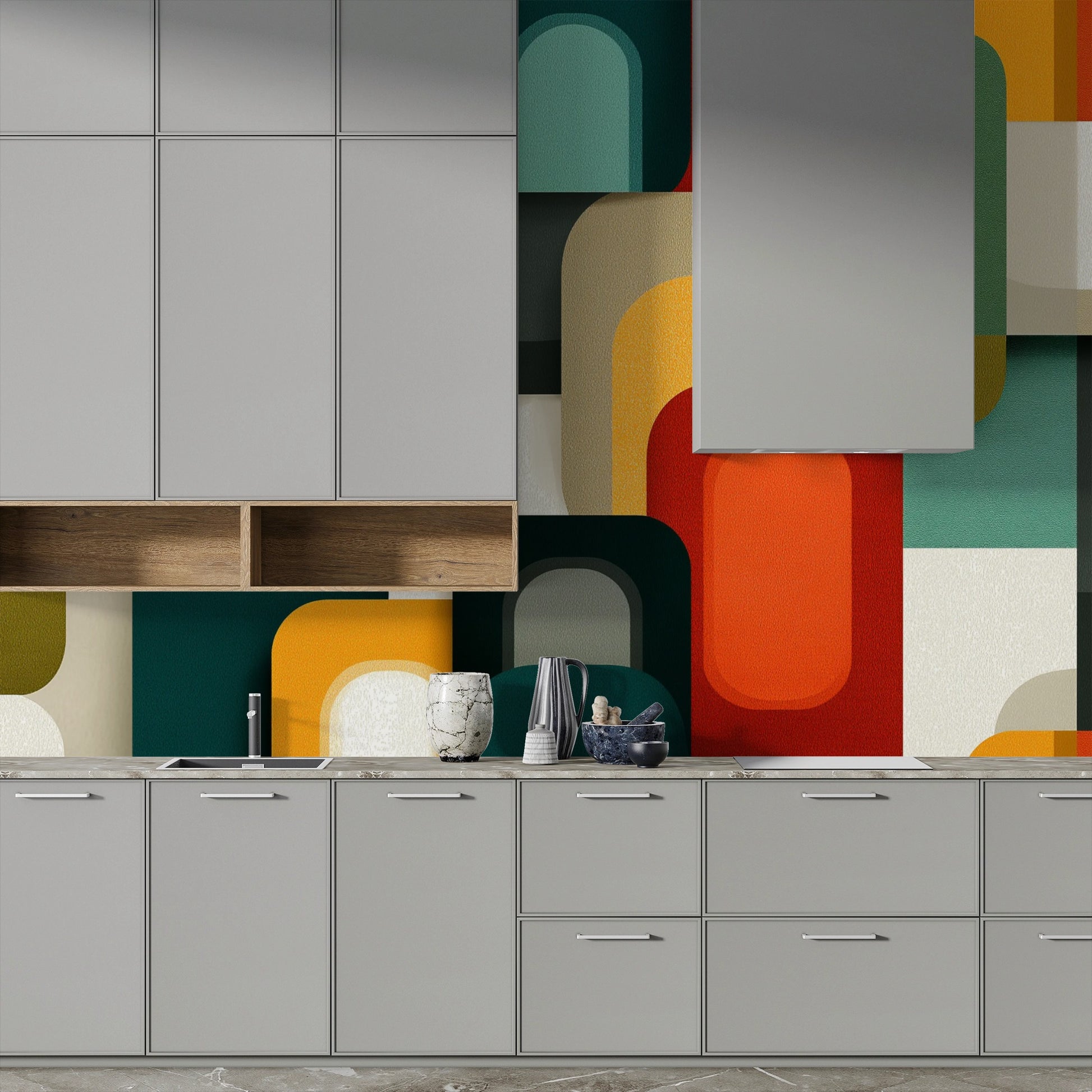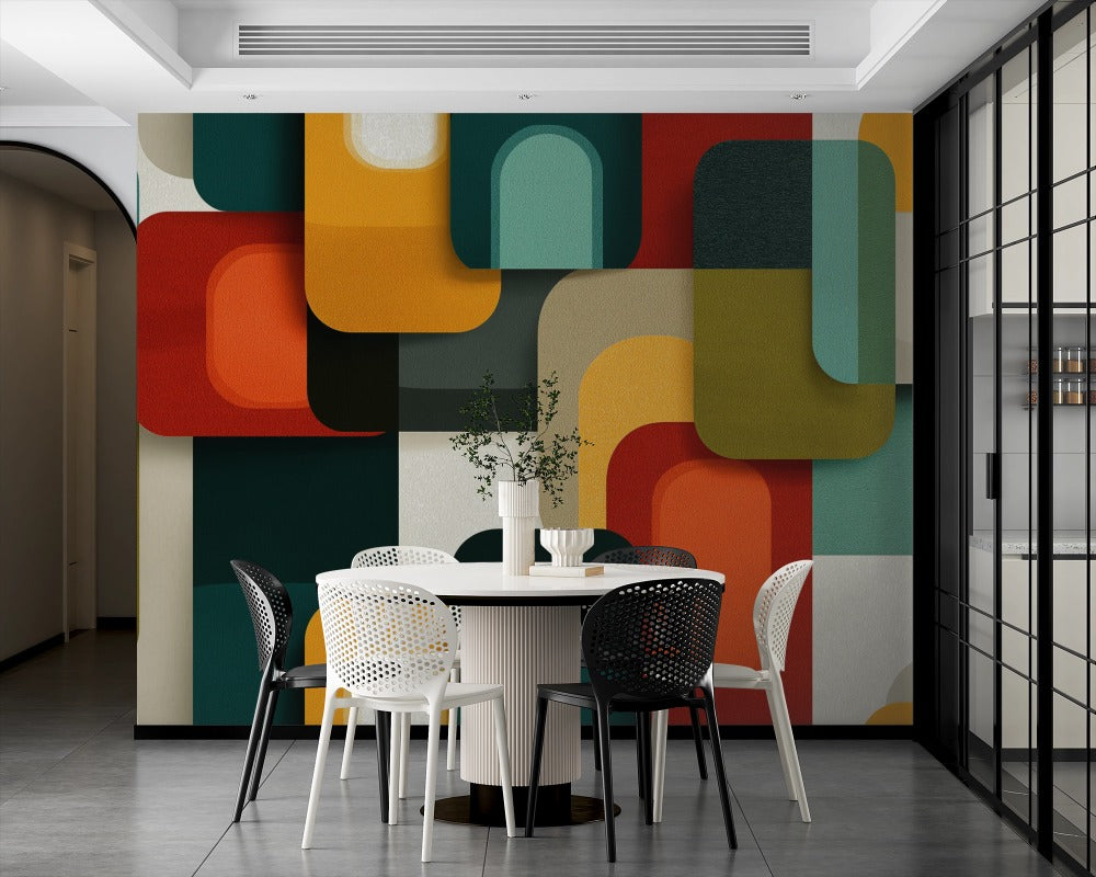 This peel and stick wallpaper features a striking geometric design with layered curved forms, inspired by mid‑century modern aesthetics. Blocks of color coral red, burnt orange, mustard, olive, teal and cream overlap with rounded edges, creating a three dimensional, textured effect. The mix of warm and cool hues adds energy and visual balance, turning any wall into a focal point of modern, playful style. Ideal for living rooms, studios or entryways, this mural adds an artistic and sophisticated touch to contemporary interiors.