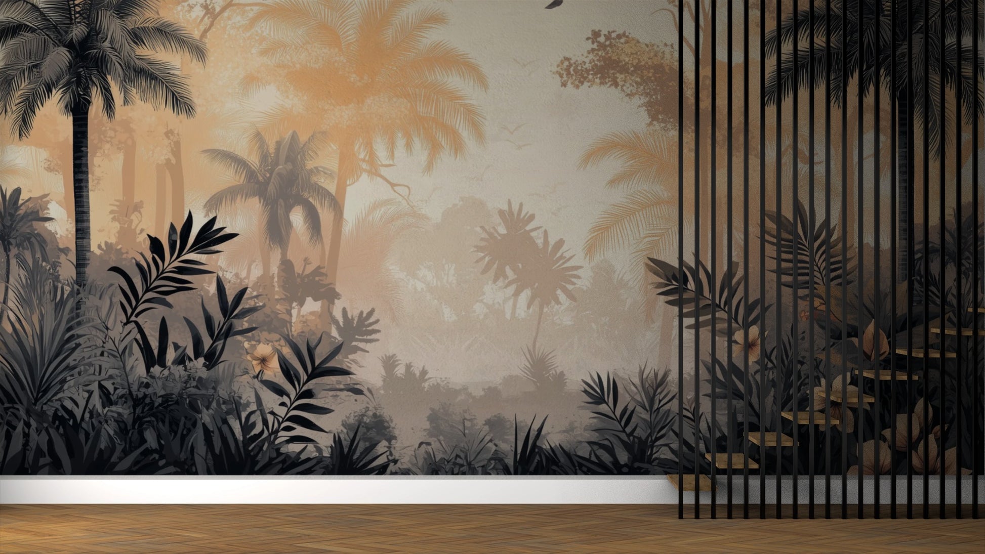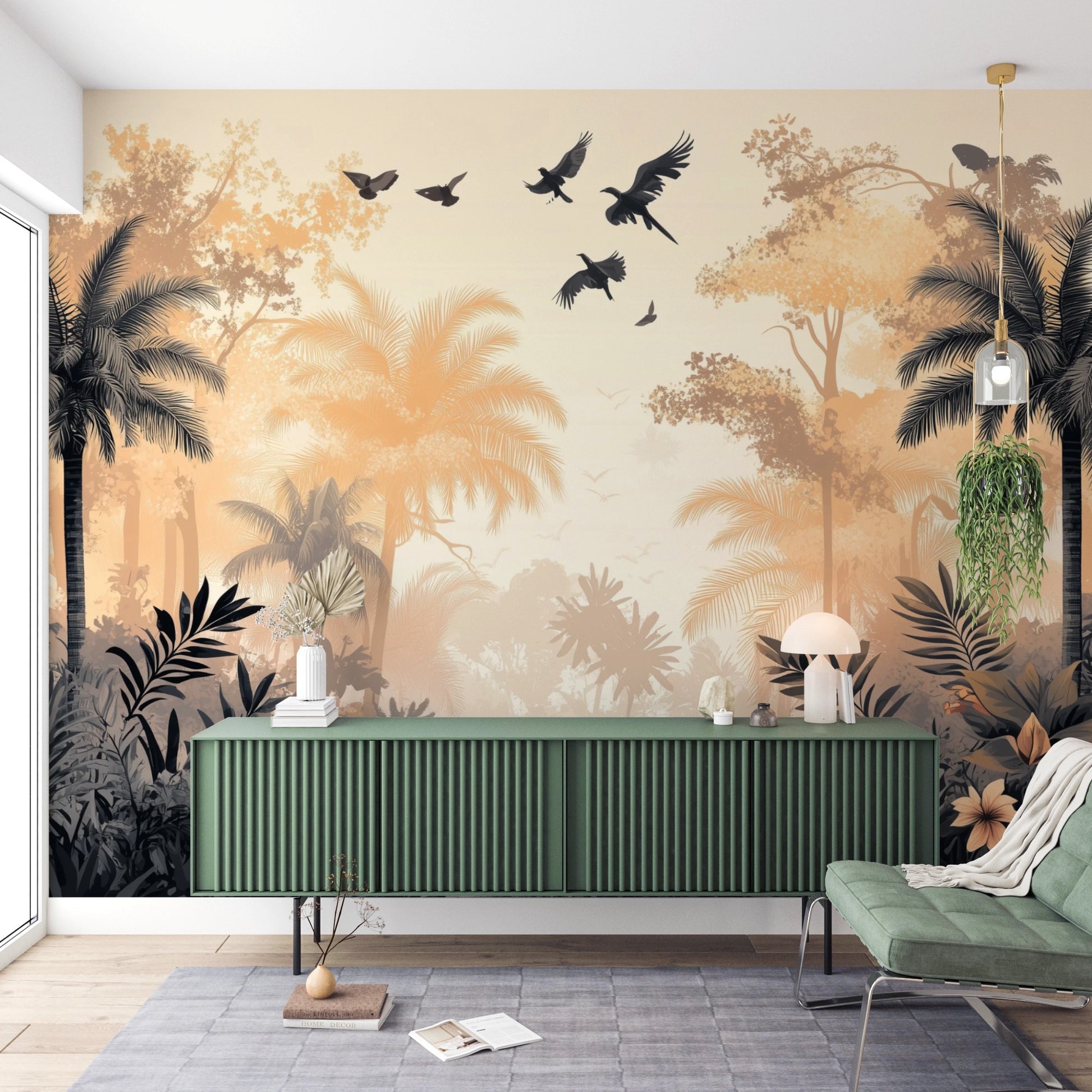 Transform your walls into a gateway to paradise with this tropical sunset mural. Towering palm trees, exotic foliage, and birds in flight capture the serene beauty of a jungle bathed in warm golden and orange hues. The artistic design adds depth and freshness, creating a cozy yet sophisticated atmosphere. Perfect for living rooms, bedrooms, or studios, this peel and stick wallpaper is easy to install and turns your space into a tropical retreat filled with elegance and style.