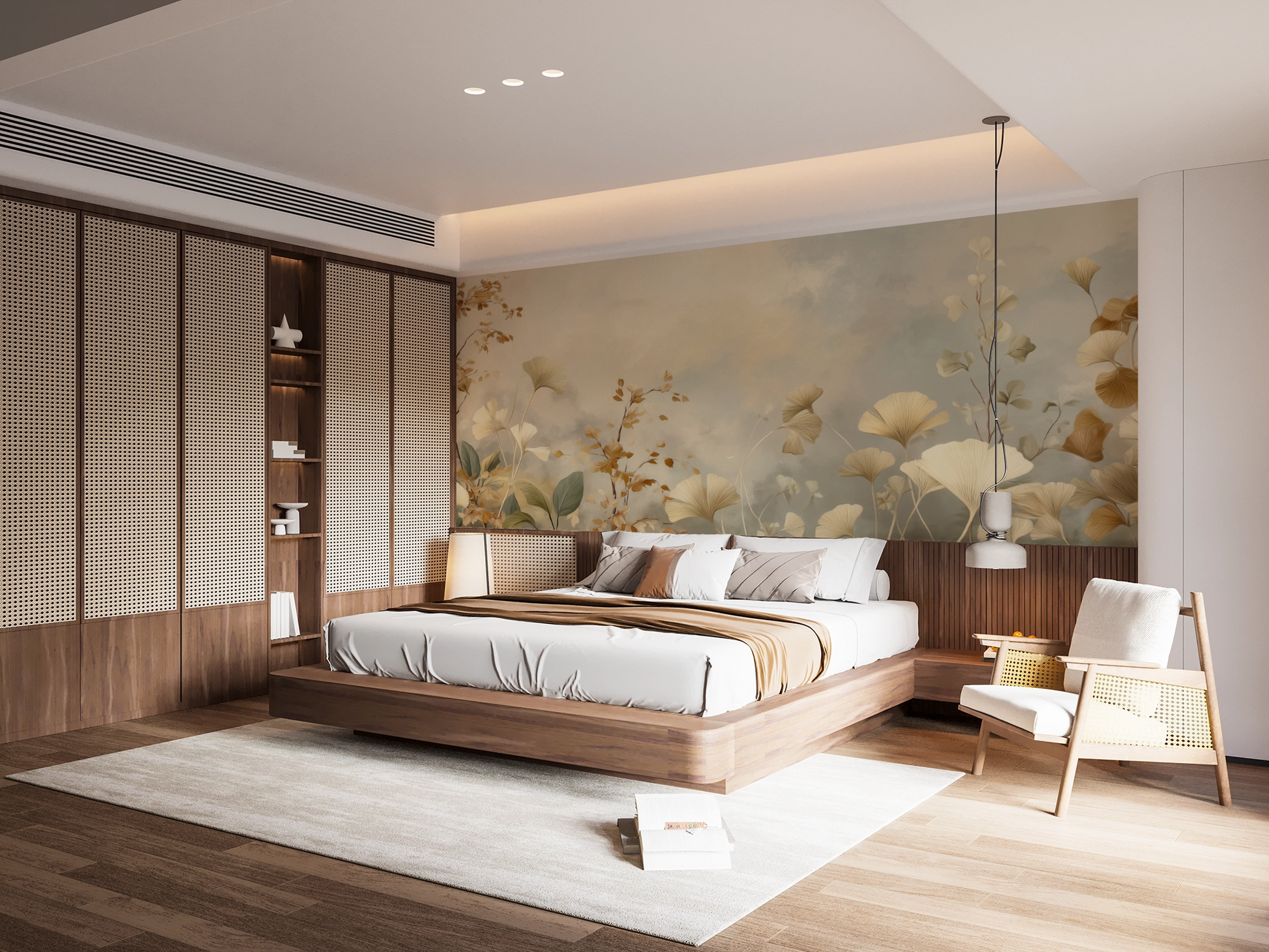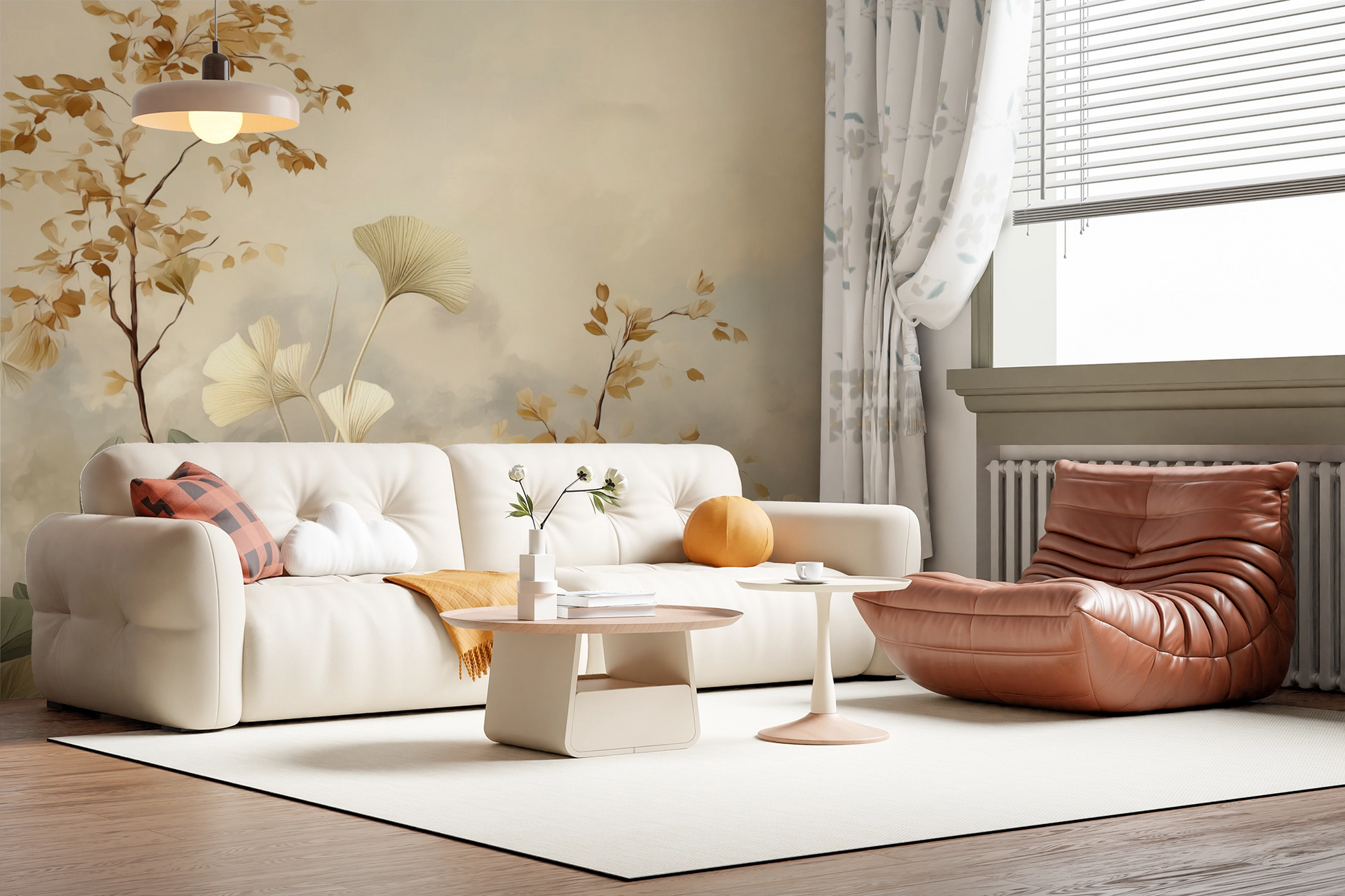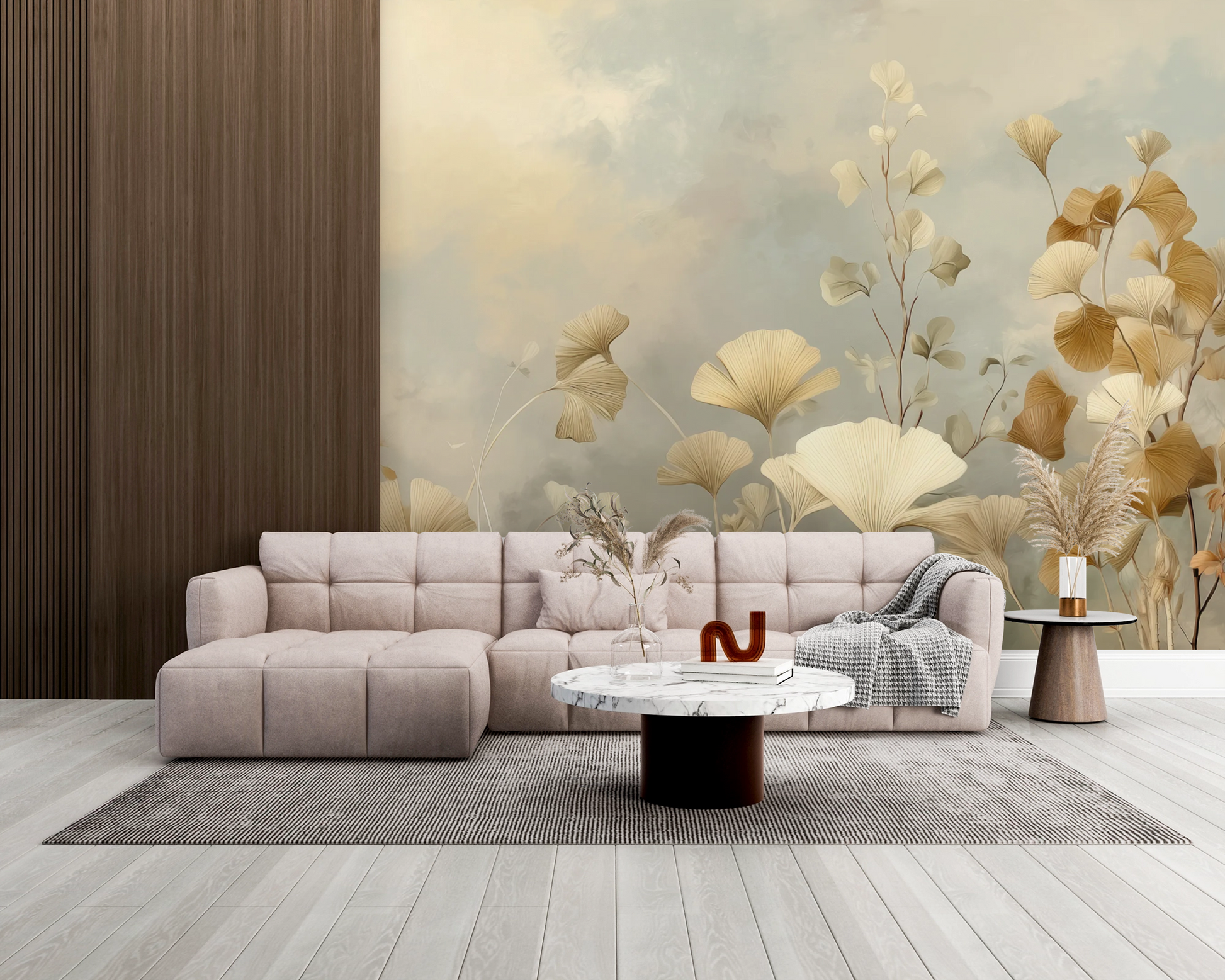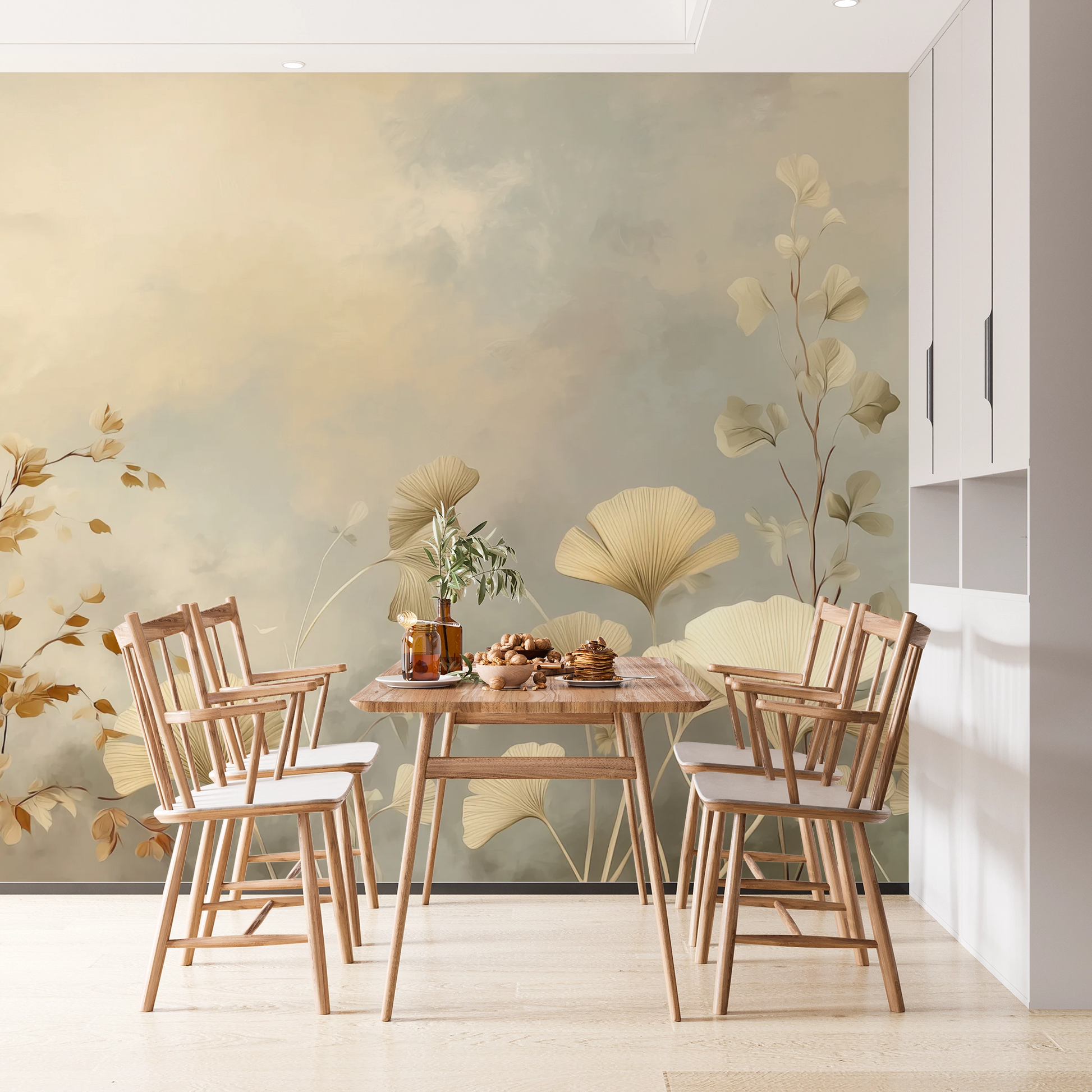 This wall mural showcases delicate ginkgo leaves and airy botanical branches illustrated in warm ivory, soft sand, and muted sage tones. The composition feels light and expansive, with gentle movement and negative space that creates a calming, balanced atmosphere. Subtle layering and soft brush textures give the design an organic, painterly quality without overwhelming the room. Ideal for modern, minimalist, and transitional interiors, this mural brings a refined botanical presence to bedrooms, living rooms, offices, and serene commercial spaces.