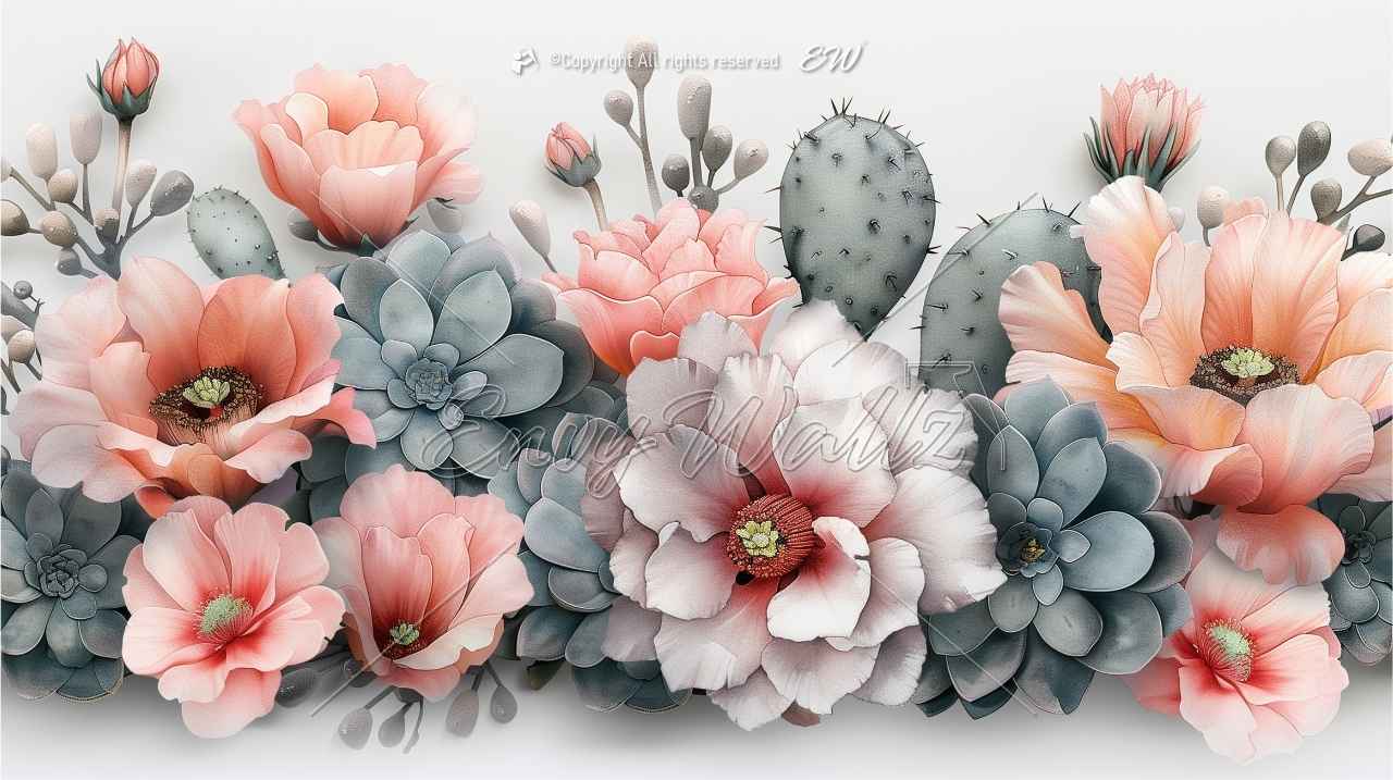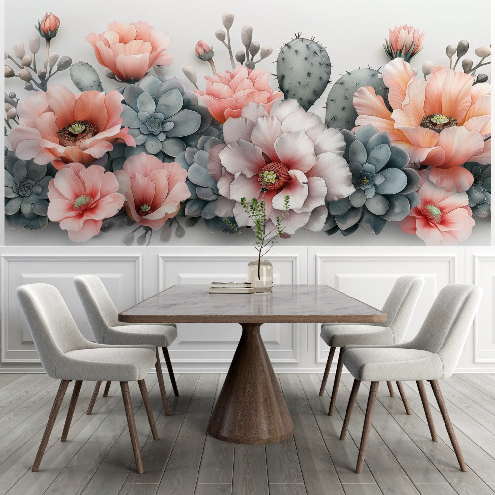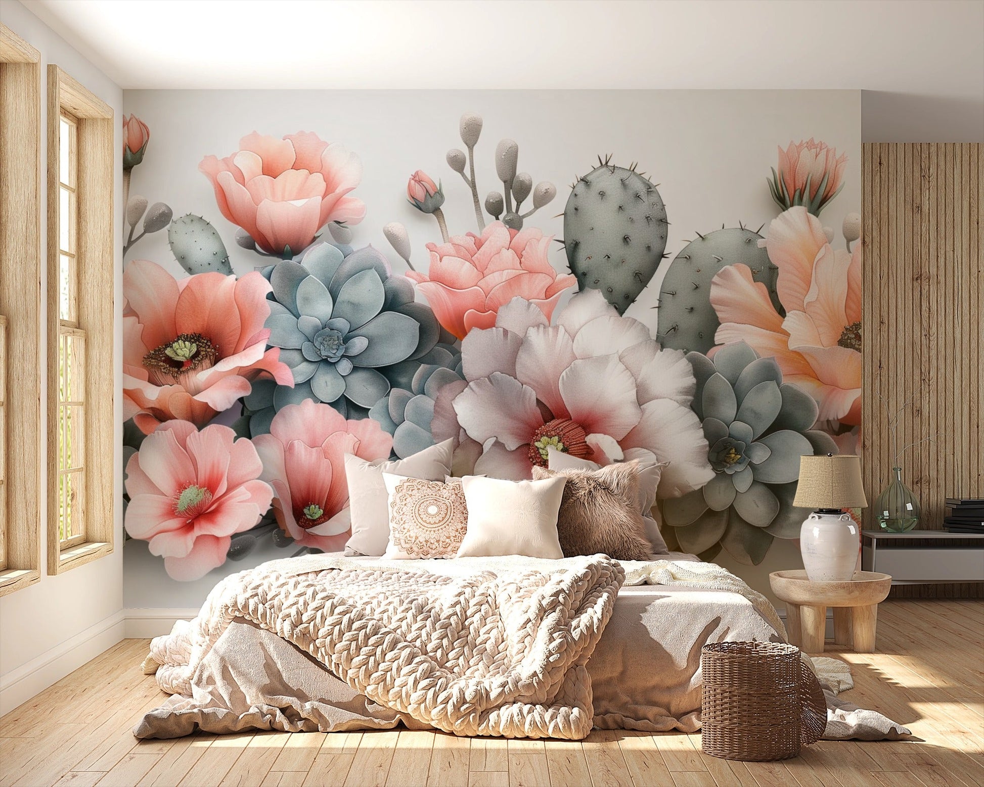 Elevate your walls with the sophisticated charm of our succulent and cactus floral peel and stick wallpaper. Featuring lush watercolor succulents in cool gray tones paired with blooming desert flowers in blush and coral shades, this mural creates a perfect balance of strength and softness. Ideal for bedrooms, living rooms, nurseries, or creative spaces, it adds depth, freshness, and a modern botanical touch to your home.