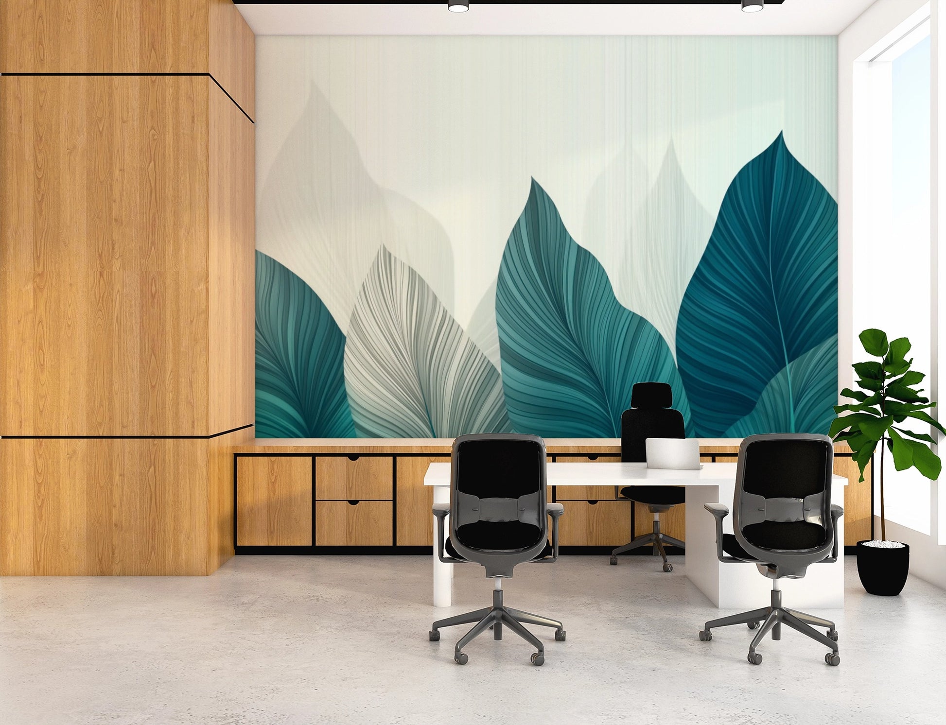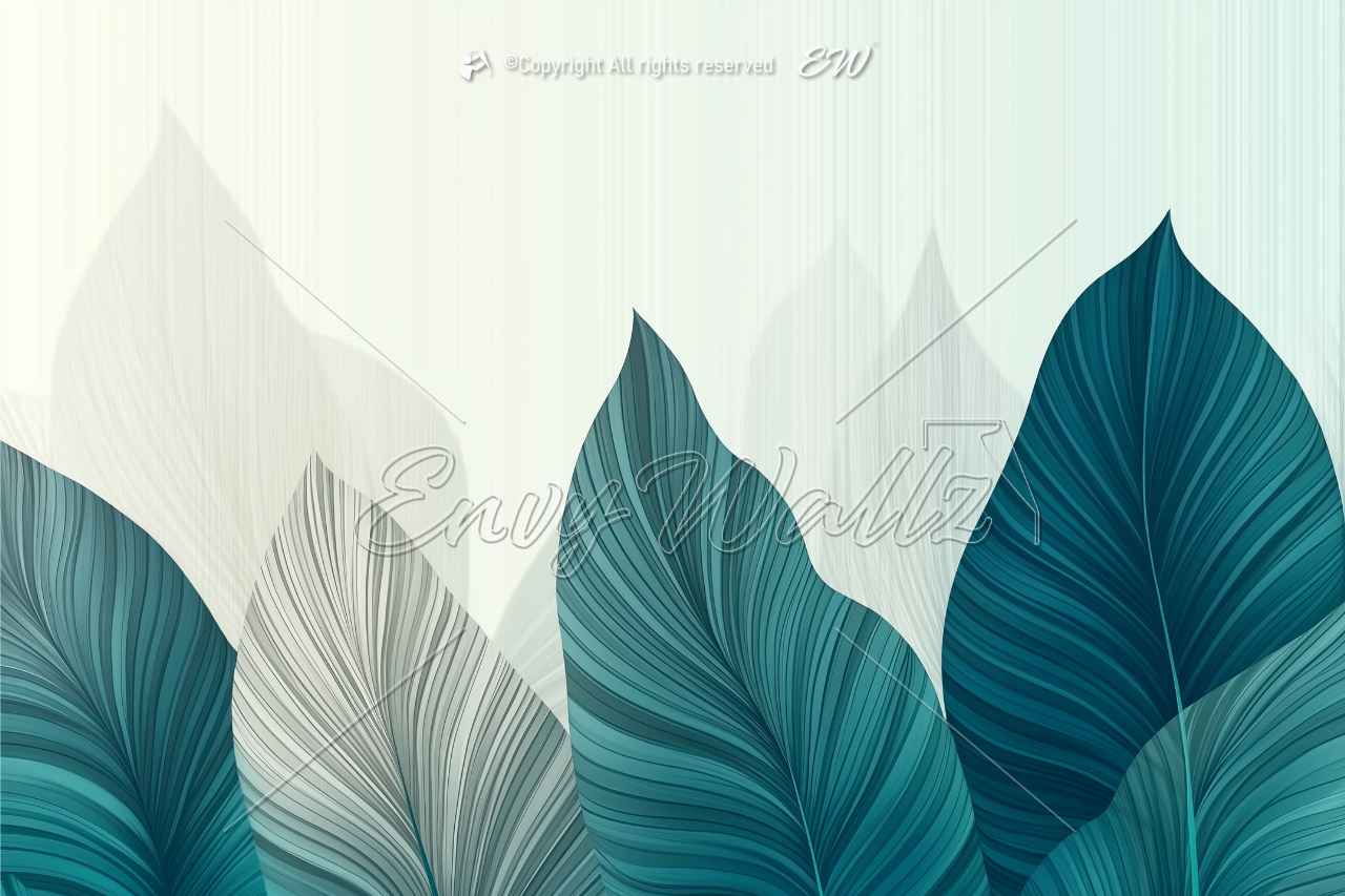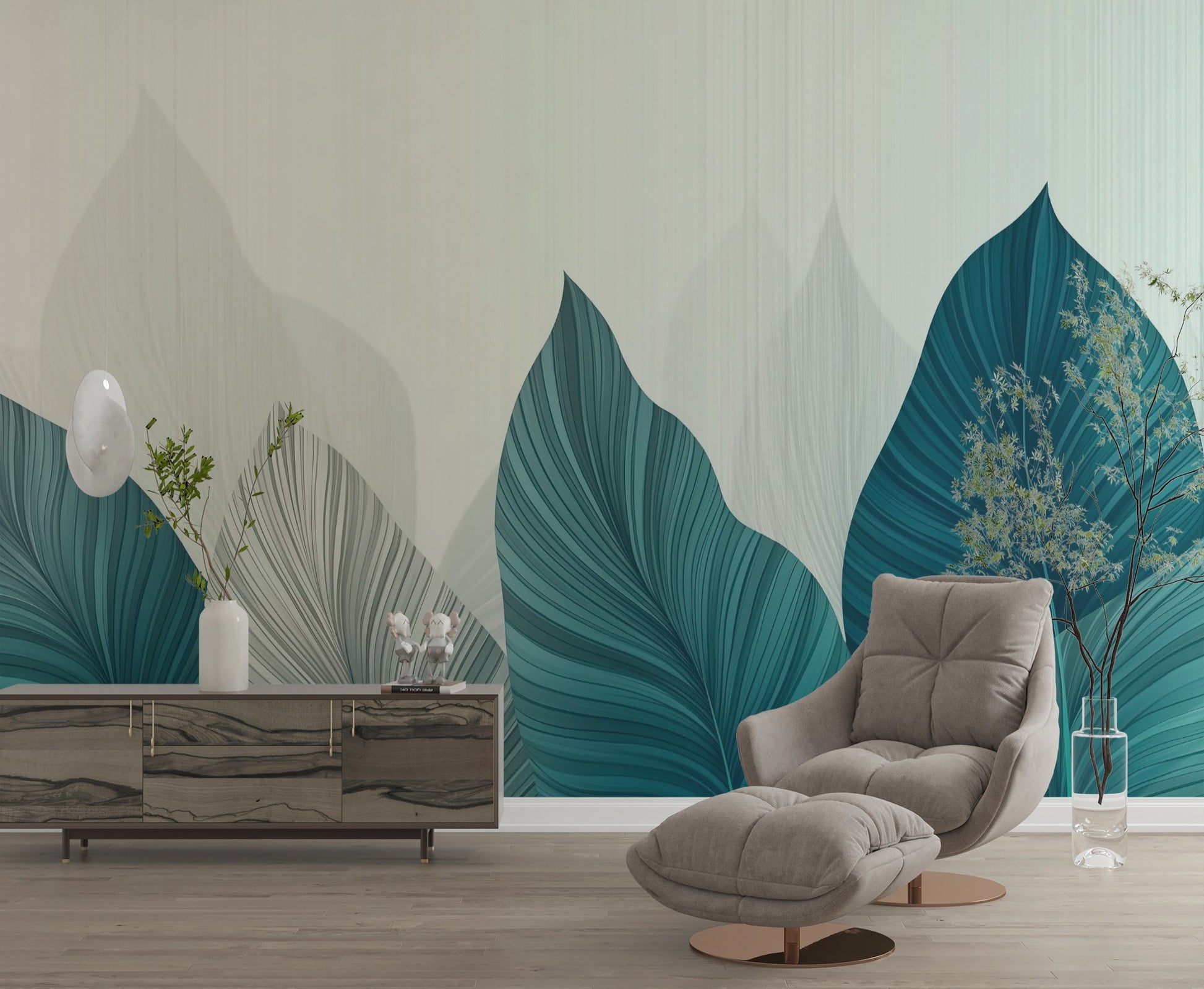 Create a refreshing and modern look in your home with our tropical leaf peel and stick wallpaper. Featuring oversized banana style leaves in rich teal and soft gray tones, this mural combines elegance with a bold botanical statement. Its minimal gradient background enhances depth and freshness, making it ideal for living rooms, bedrooms, dining areas, or creative workspaces.