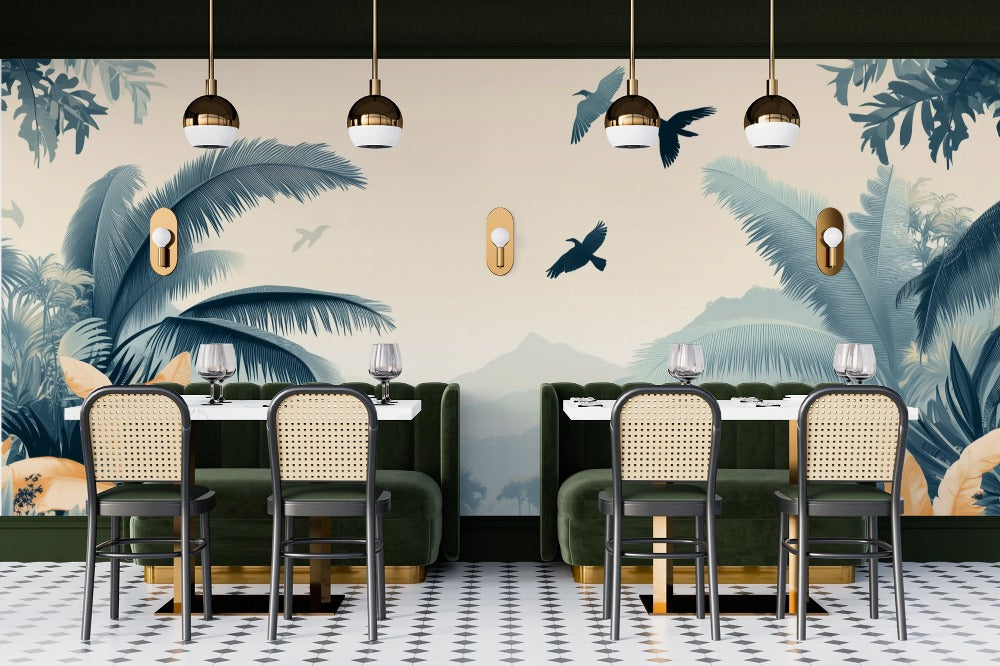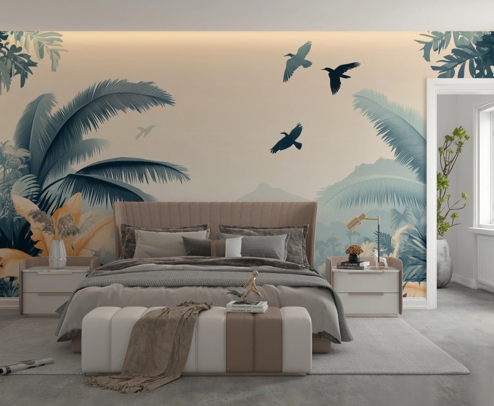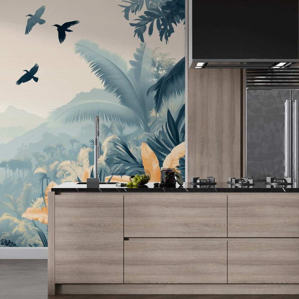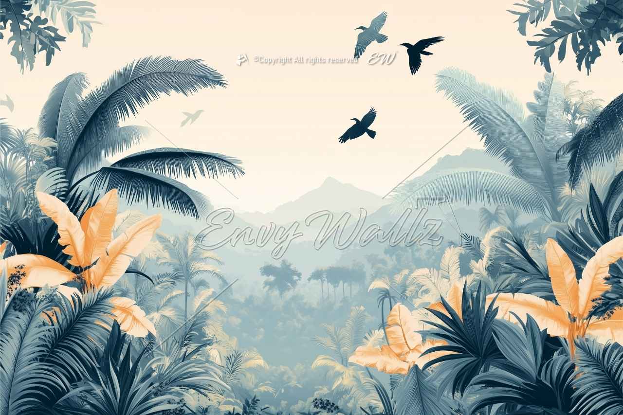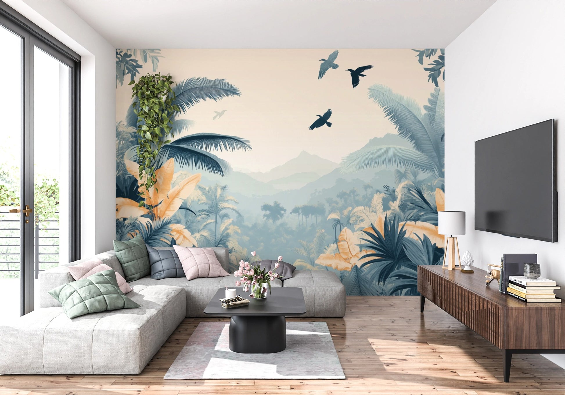 This self adhesive wallpaper captures the tranquility of a tropical jungle at dawn. Large palm fronds and banana leaves stretch in smoky blue and soft peach hues while dark birds glide across an ivory sky. Layers of misty mountains on the horizon add depth and a sense of calm. The colour palette blends warm and cool tones to create a modern, balanced ambiance, turning any living room, bedroom or office into an exotic oasis. The design melds stylized botanical elements with a minimalist backdrop, bringing sophistication and warmth to your space.