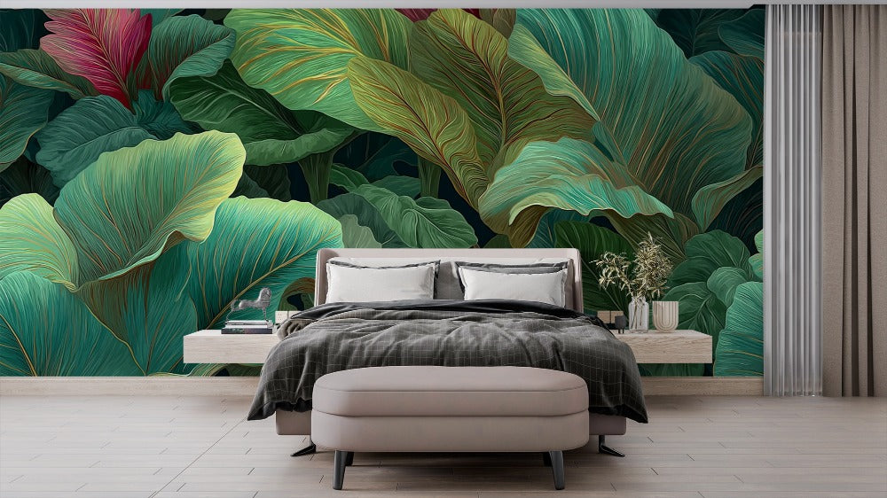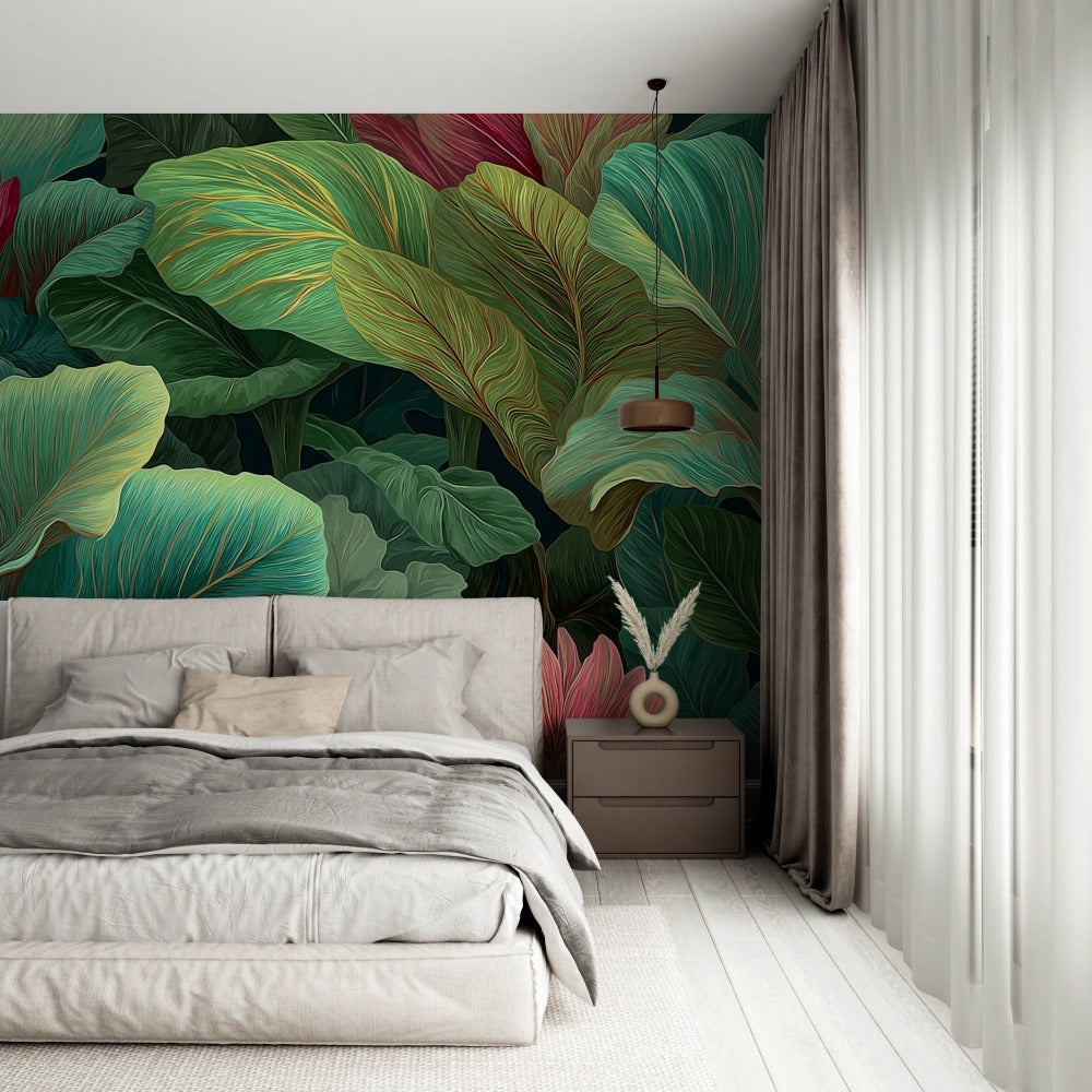 This self‑adhesive wallpaper features lush tropical foliage layered with oversized leaves in emerald, turquoise and teal hues, accented by golden veining and pops of coral pink. Calathea‑ and banana‑style leaves overlap to create depth and movement, evoking the vibrancy of a verdant jungle. The rich, natural palette infuses any room with energy and freshness, transforming living rooms, bedrooms or studios into lively retreats. Its detailed, modern design is perfect for those who want to bring nature indoors in a sophisticated way.