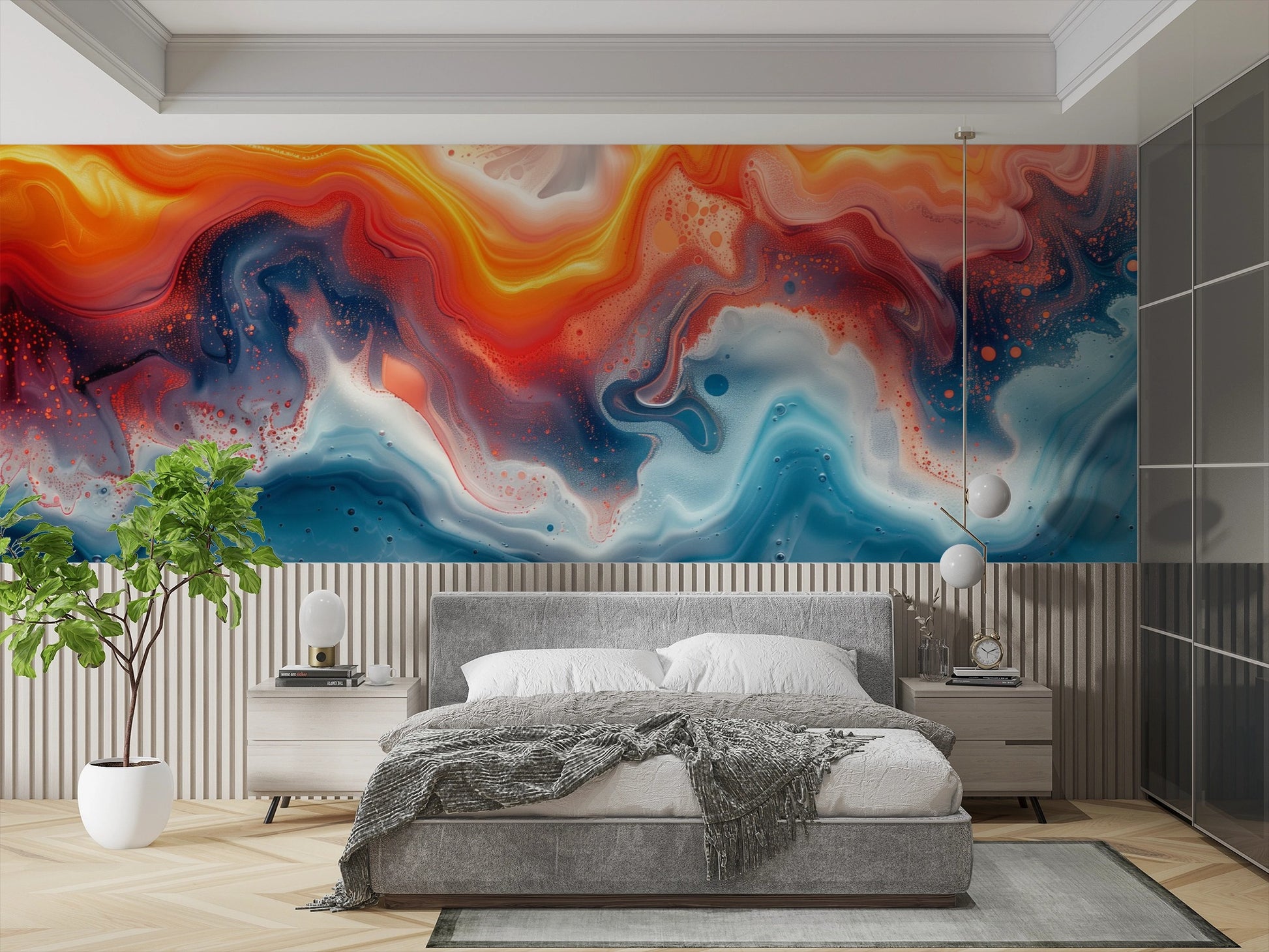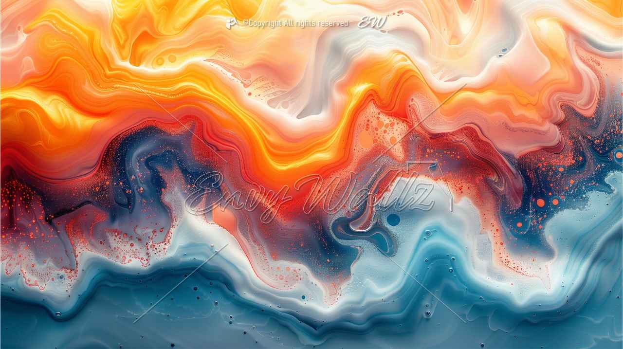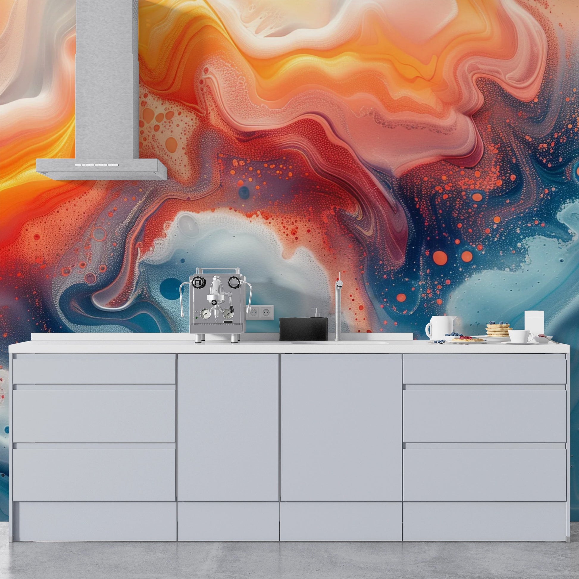 Transform your walls with this abstract fluid art peel and stick wallpaper mural, featuring vibrant orange, fiery red, and golden tones contrasted with deep blues and pearly whites. Its modern artistic design brings energy and sophistication to living rooms, offices, or creative spaces.