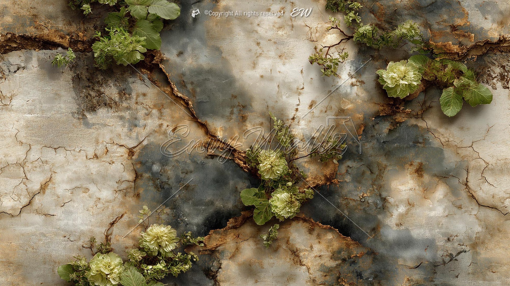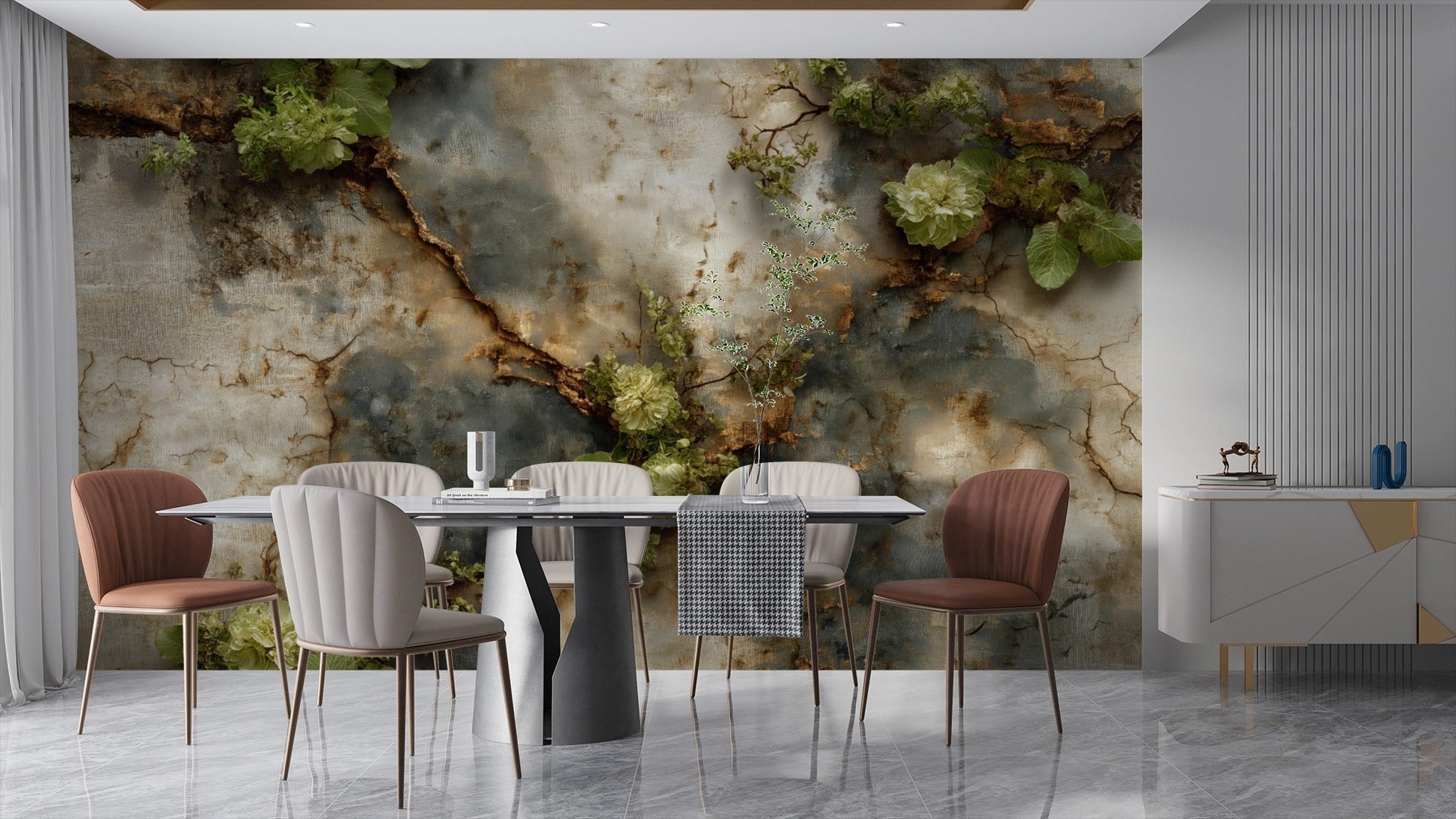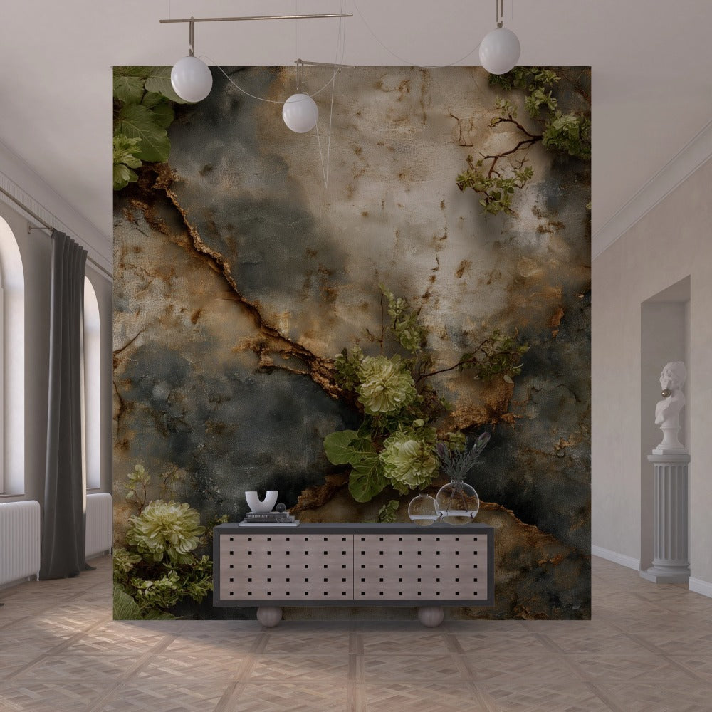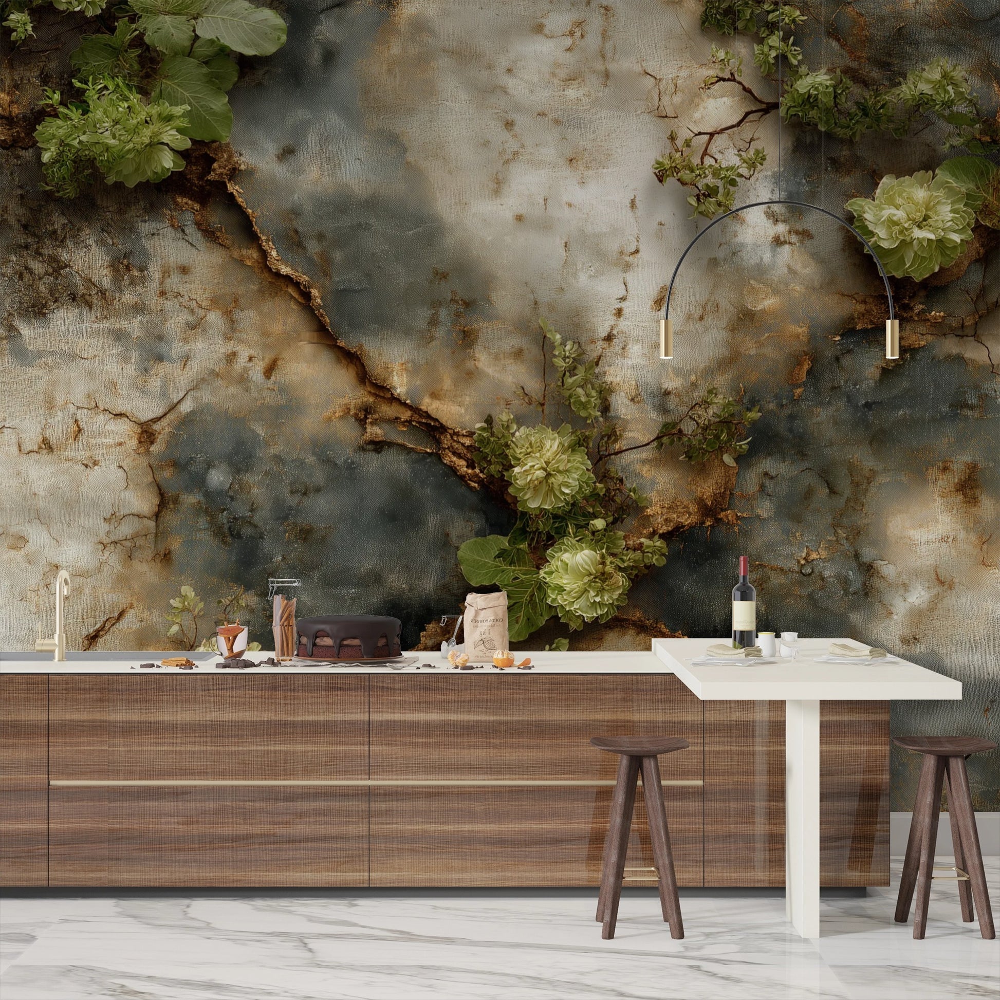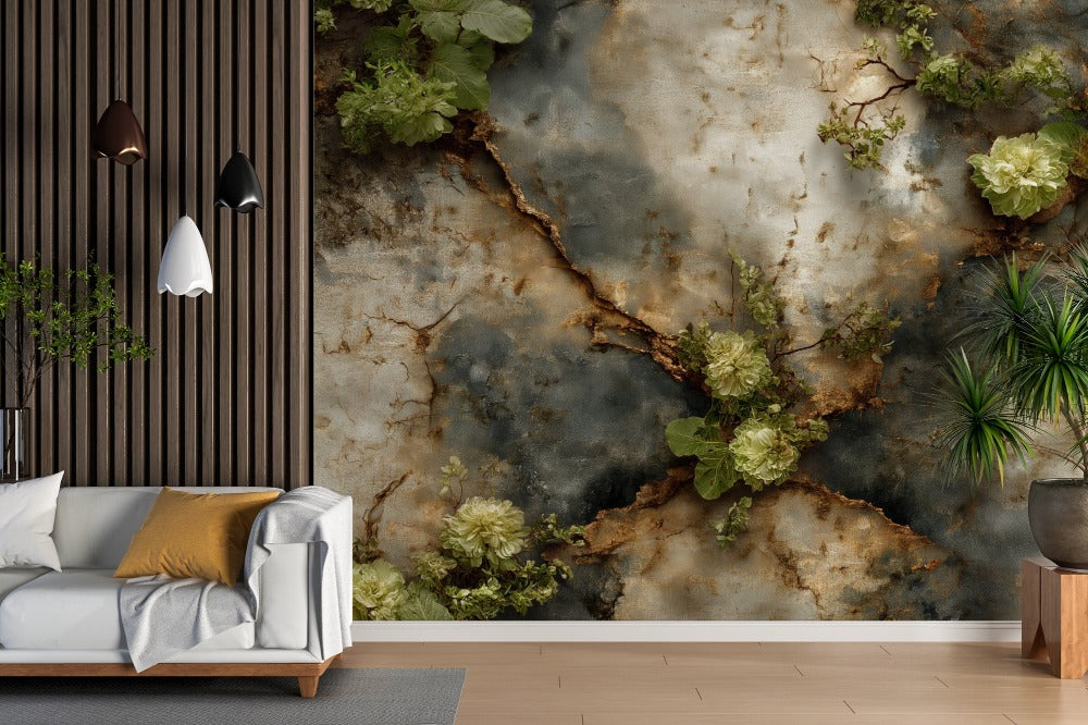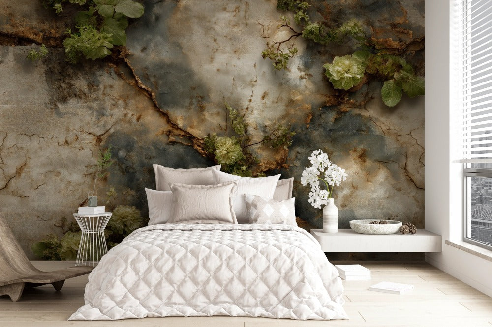 This self‑adhesive mural wallpaper captures the allure of an aged stone wall reclaimed by nature. Weathered textures with cracked stone and golden rust tones provide the backdrop for sprouting green leaves and pale chartreuse blossoms. The palette blends muted blue‑gray and aged beige with warm metallic accents, creating a rustic, organic contrast. This mural serves as a dramatic focal point in living rooms, bedrooms or creative spaces, adding depth and character with its fusion of industrial decay and lush greenery.