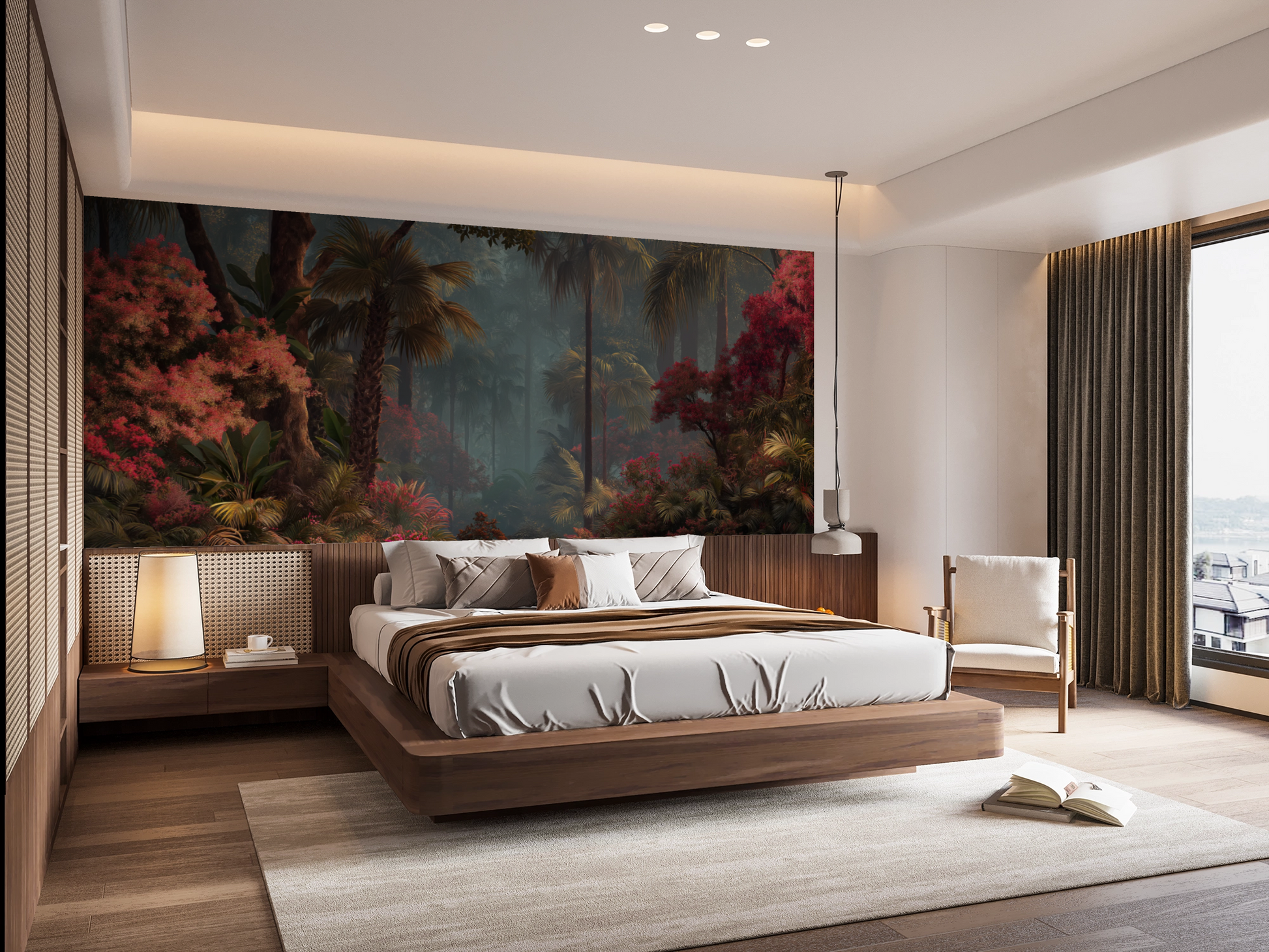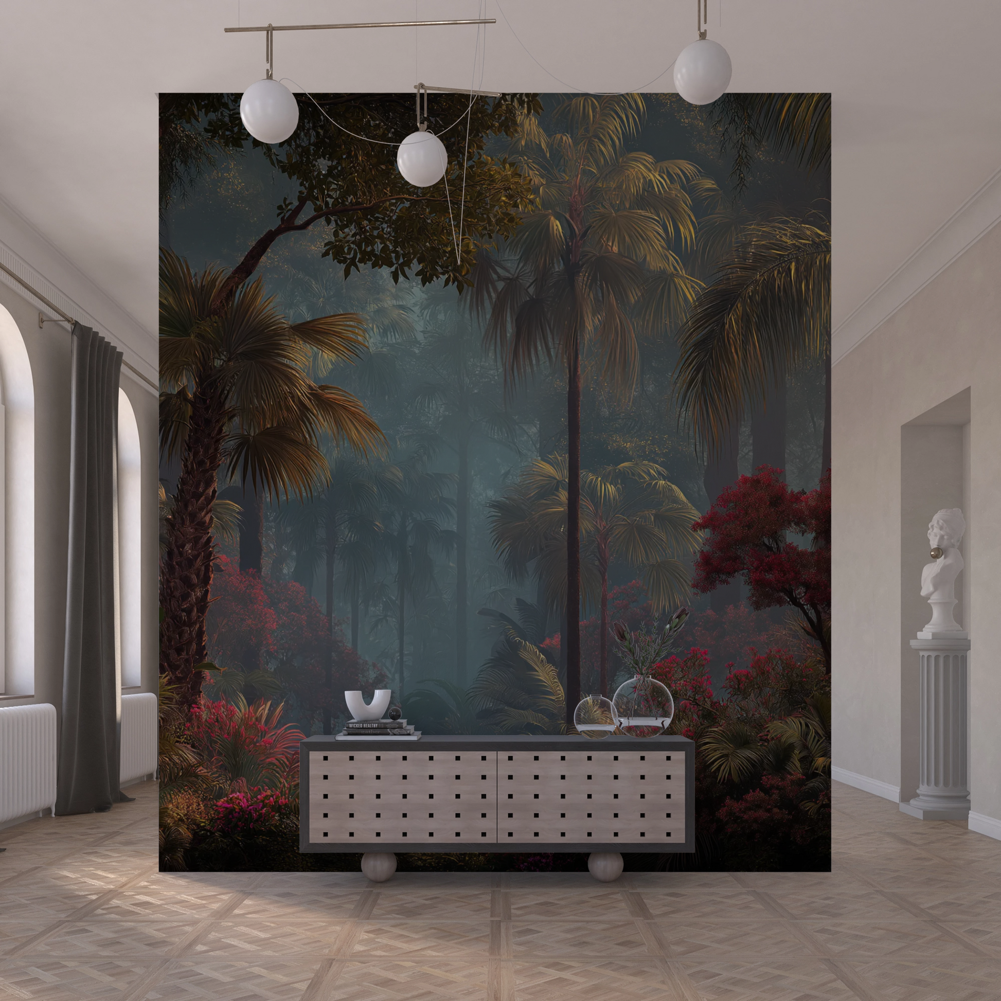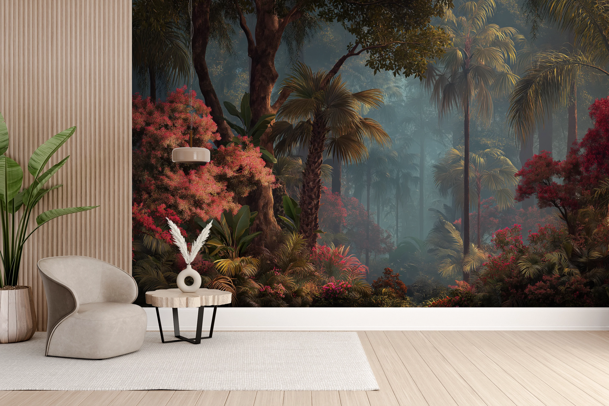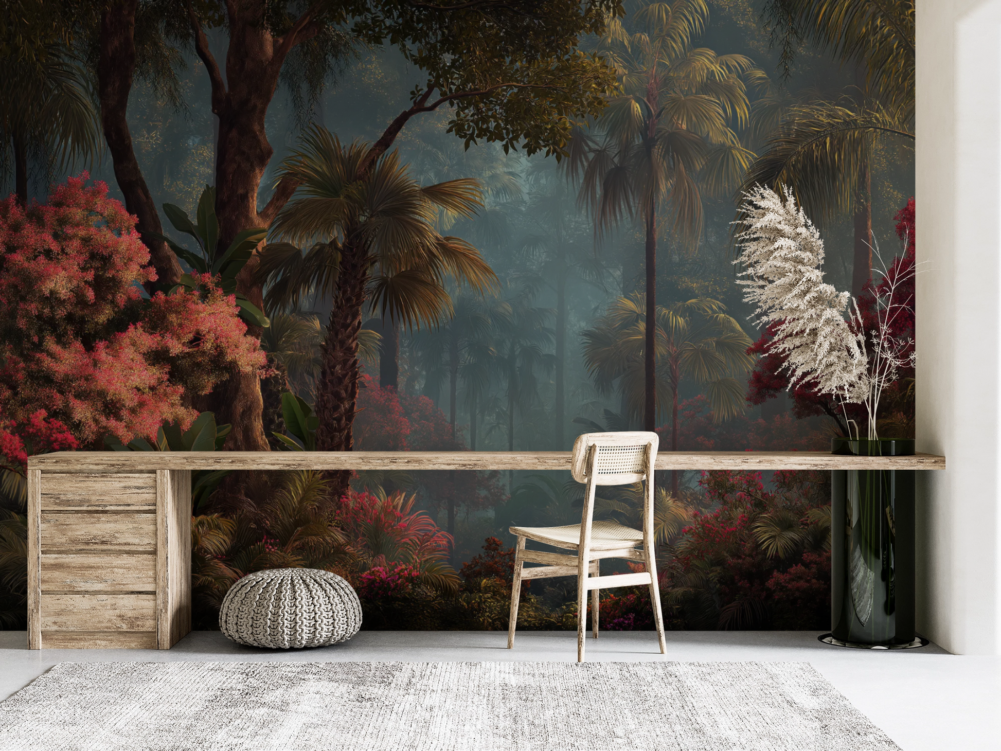 This wall mural captures a lush tropical forest layered with towering palms, dense foliage, and vibrant crimson flowering trees set against a softly misted background. Deep emerald greens, warm olive tones, and rich burgundy reds create striking contrast, while diffused light and atmospheric depth add a cinematic, immersive quality. The composition feels expansive and tranquil, drawing the eye inward through layers of vegetation and shadow. Ideal for living rooms, bedrooms, feature walls, spas, or upscale hospitality interiors, this mural delivers a bold yet calming nature-inspired statement that feels both luxurious and transportive.