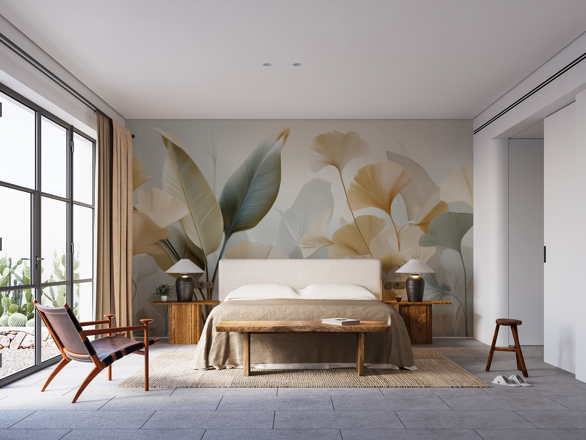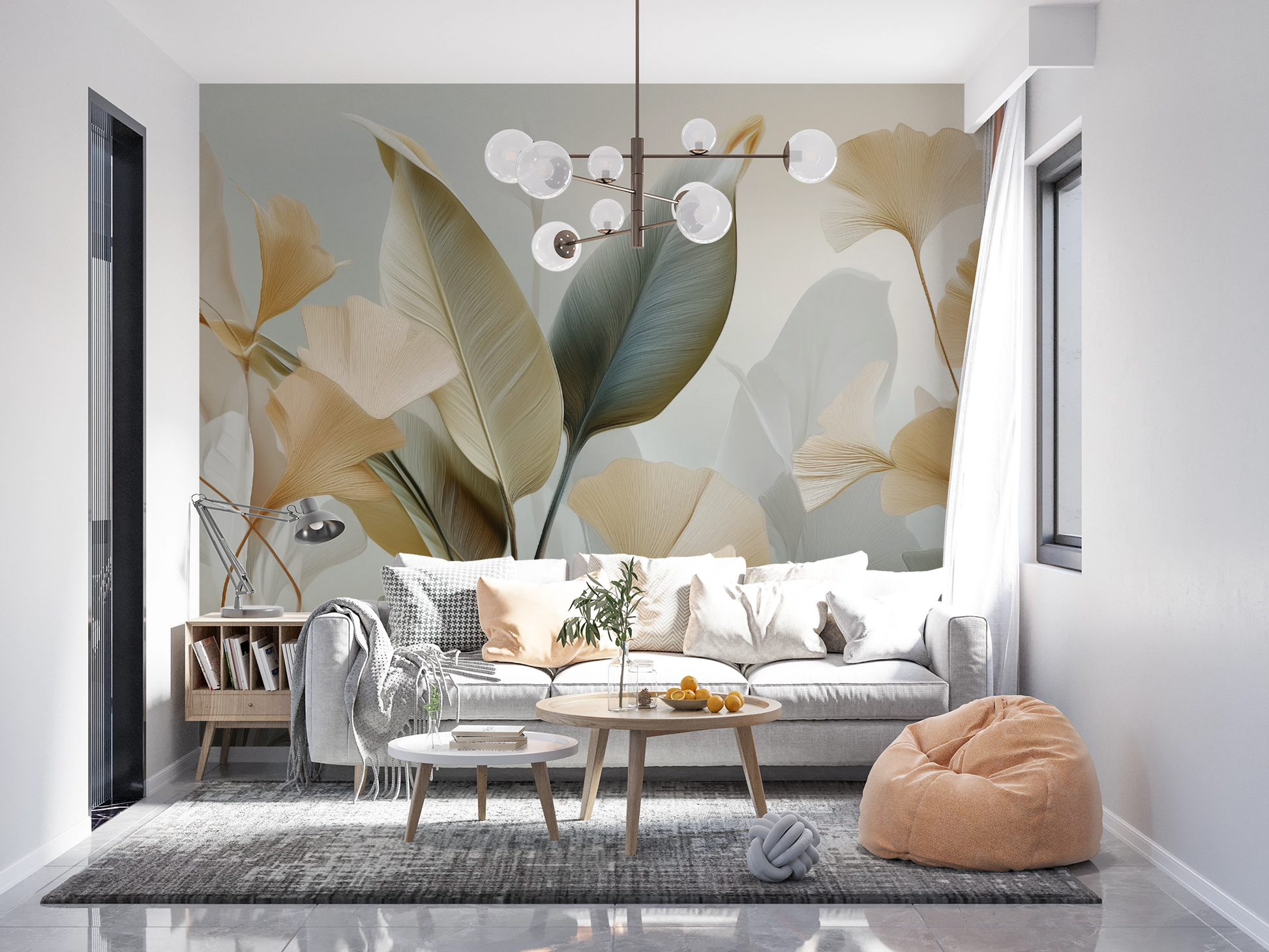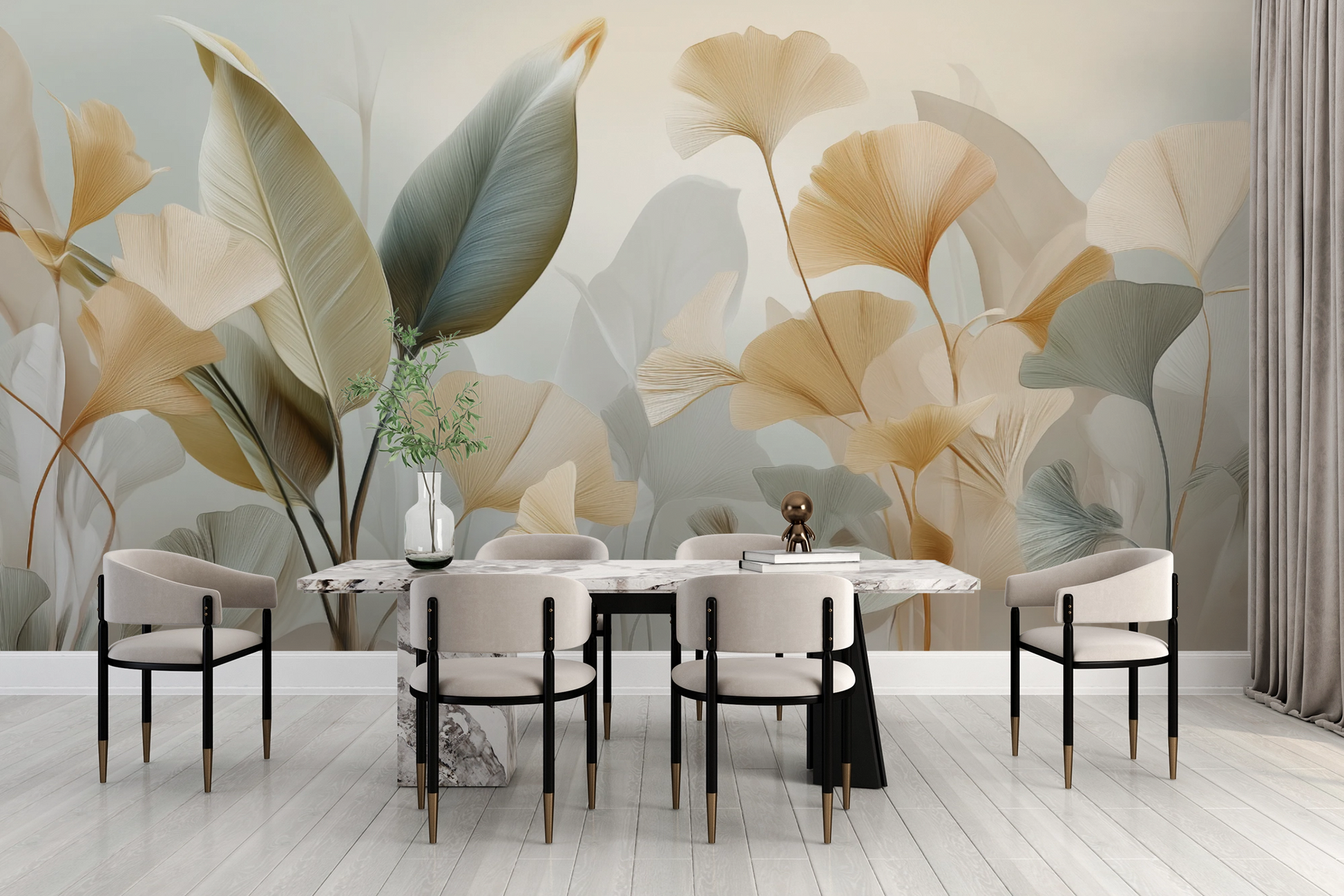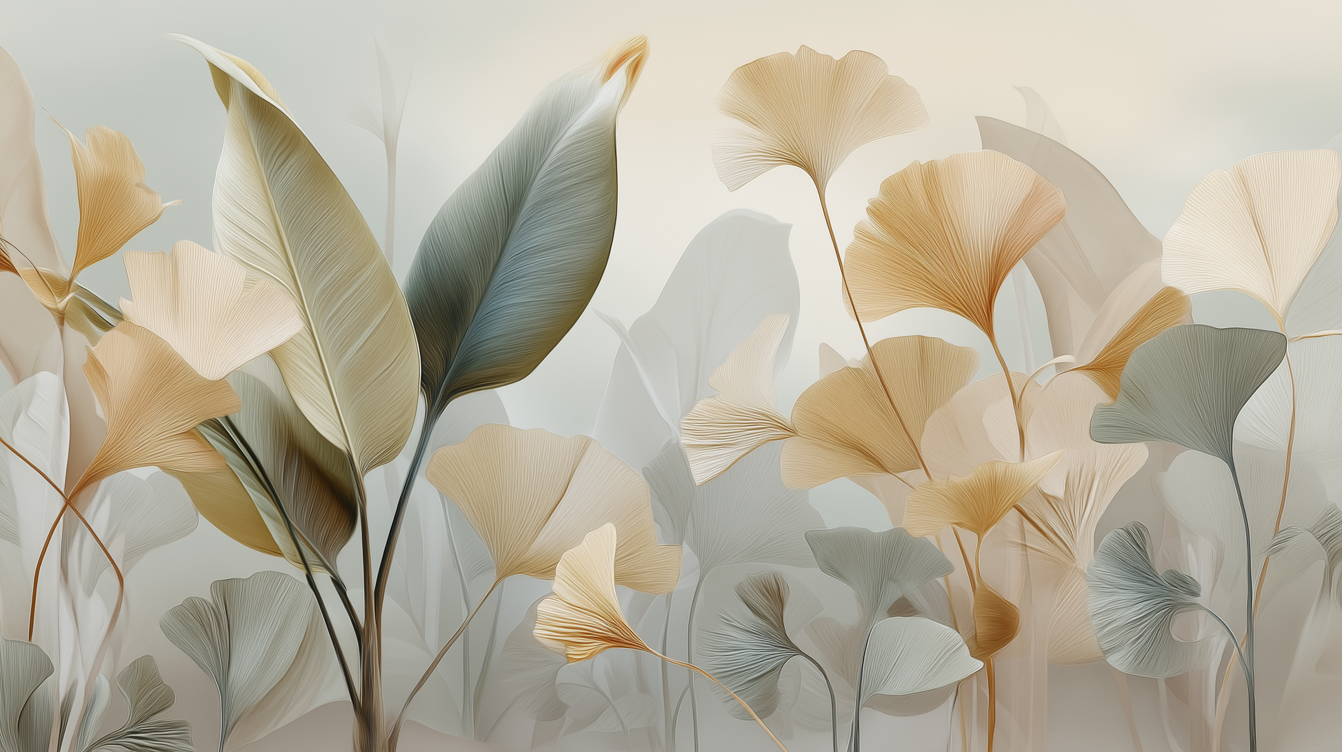 This wall mural features a graceful arrangement of ginkgo-inspired leaves rendered in soft ivory, warm beige, and muted sage tones. The flowing forms and translucent layering create a sculptural, almost ethereal composition that brings movement and lightness to the wall.