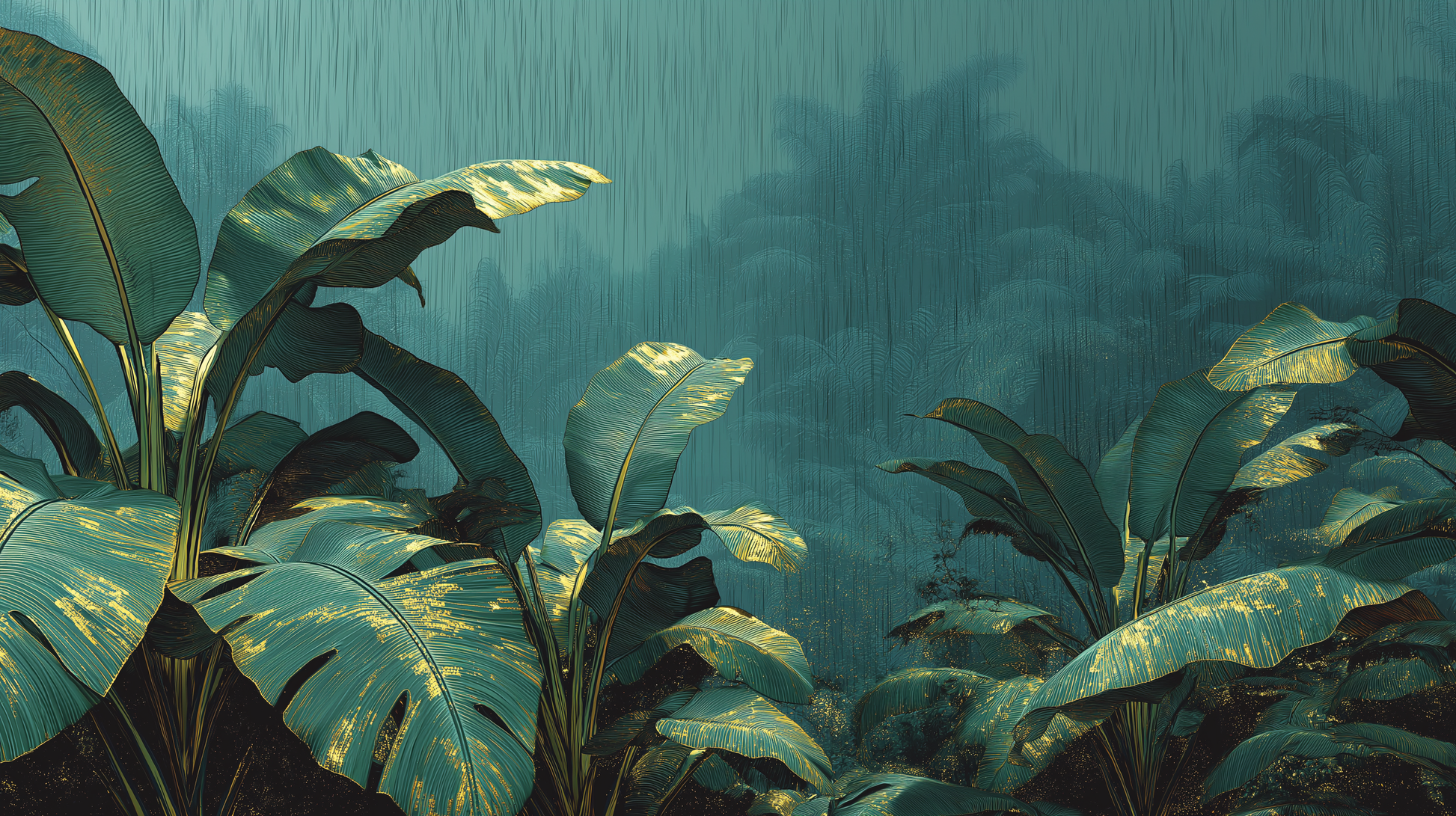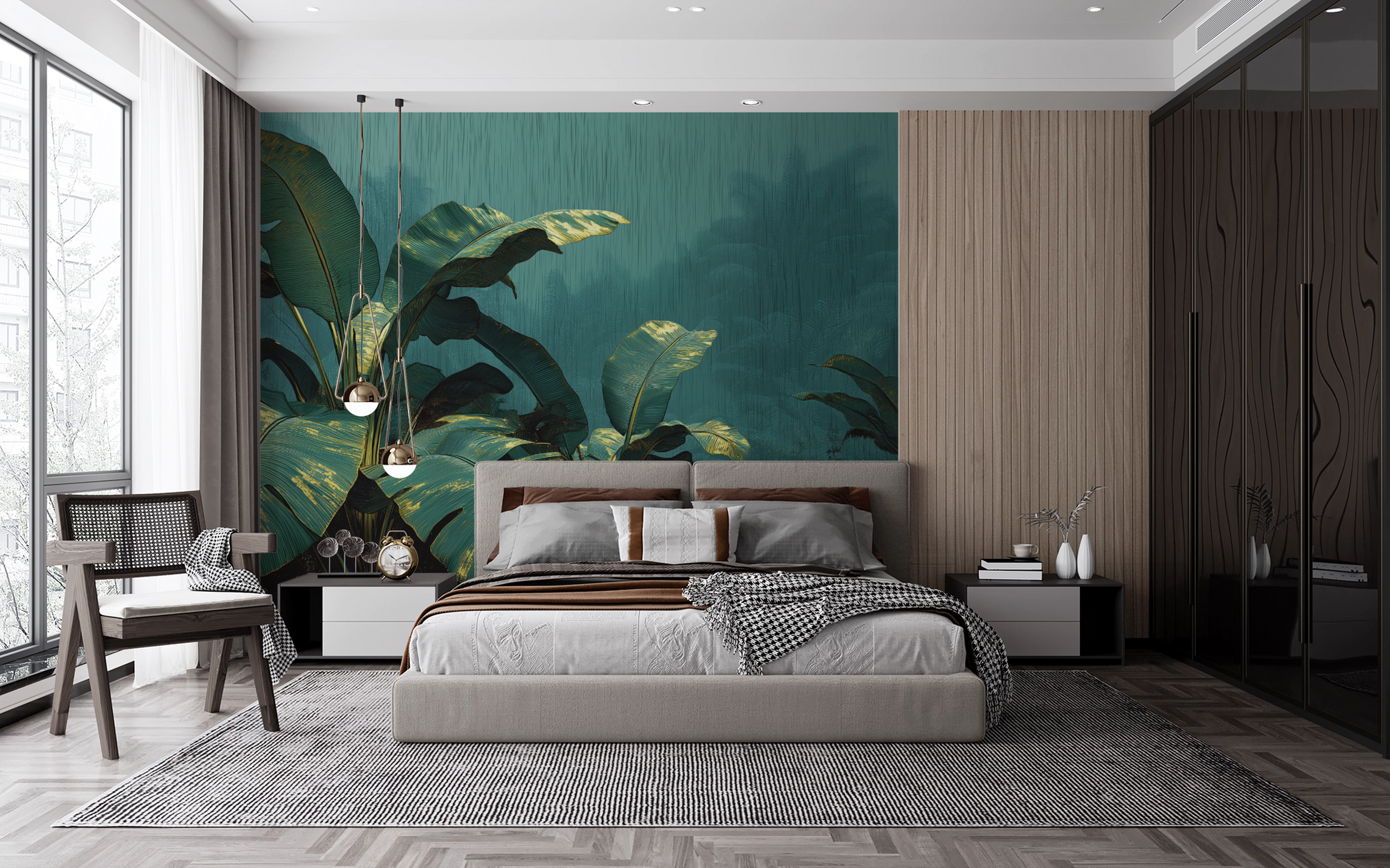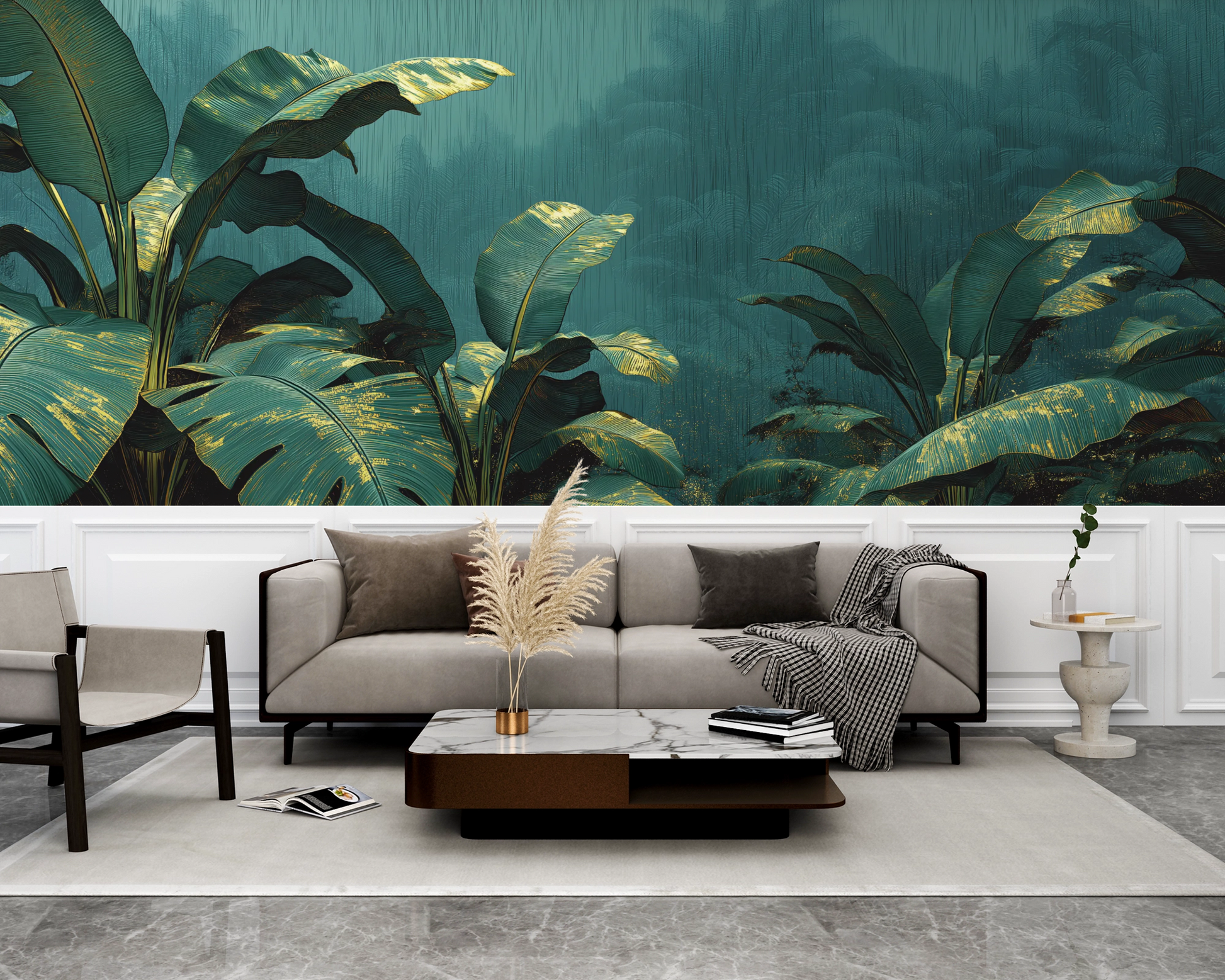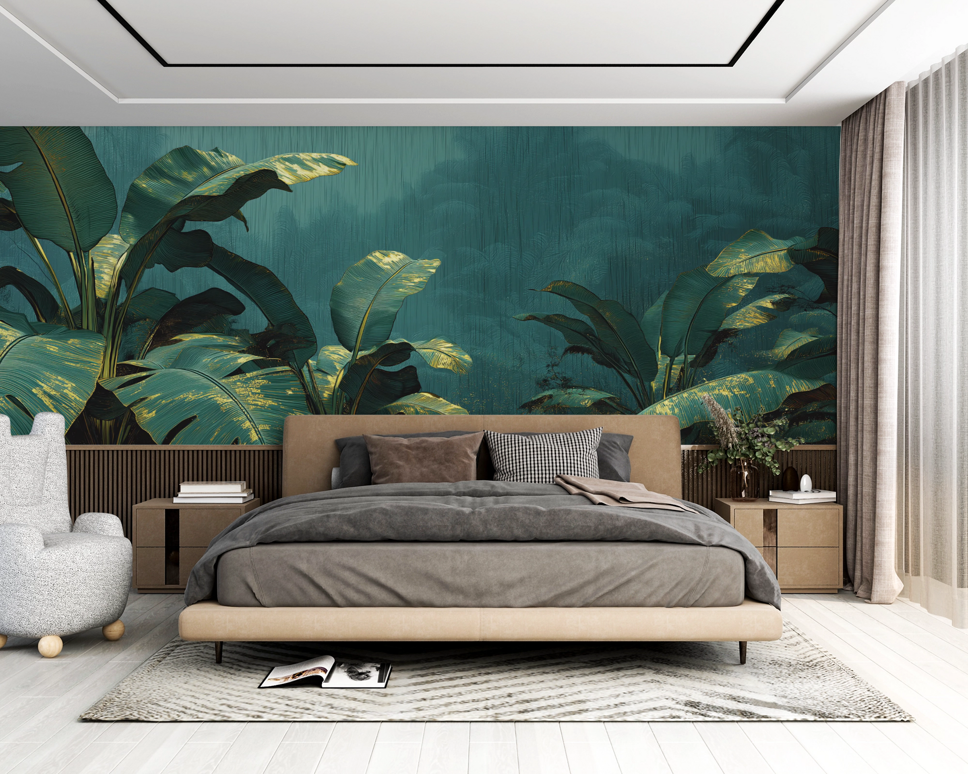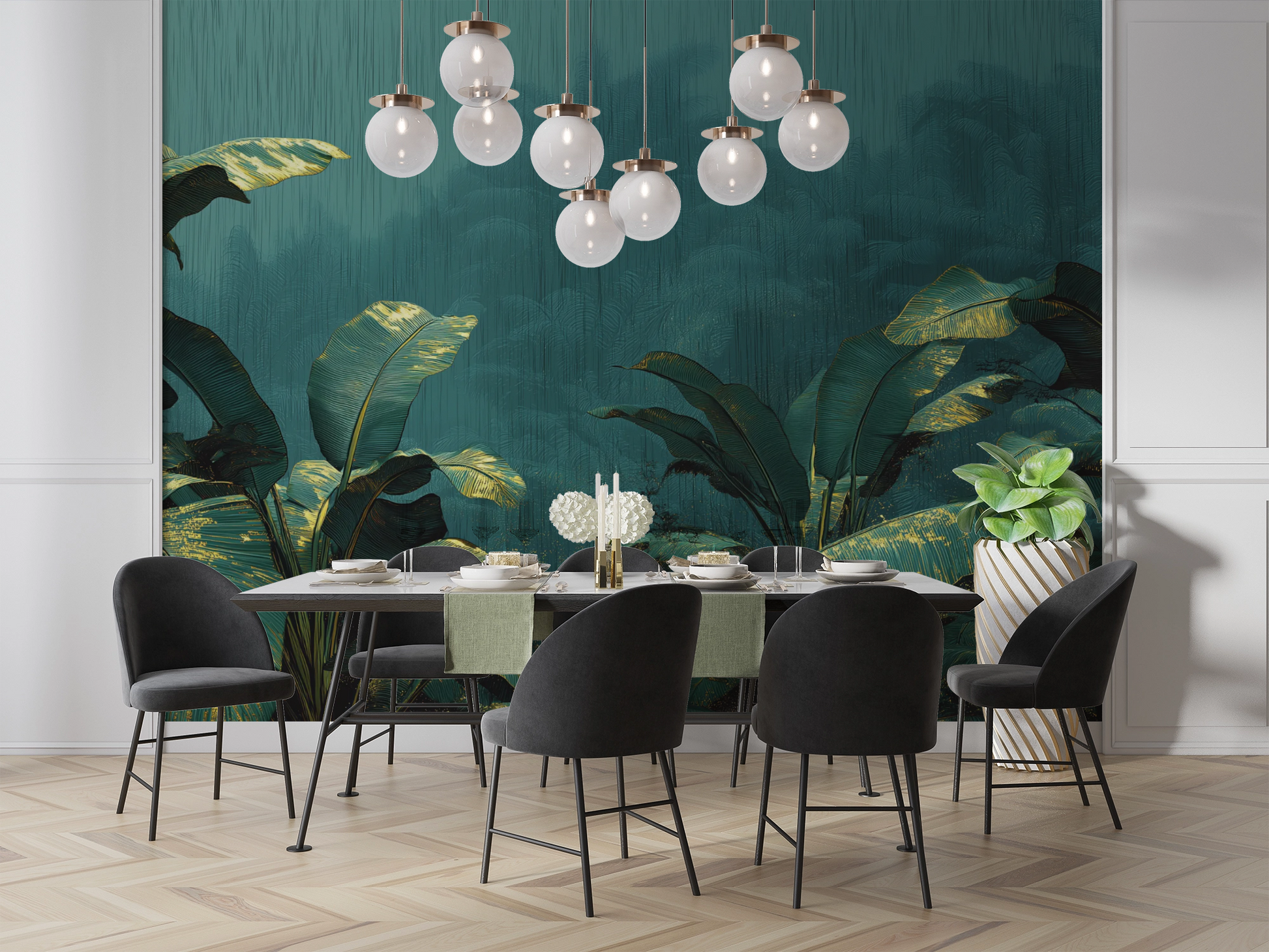 This wall mural presents a refined tropical composition where deep teal palm leaves are accented with subtle gold detailing, creating a layered and atmospheric visual experience. The softly textured background introduces depth and calm, allowing the foliage to stand out without overwhelming the space.