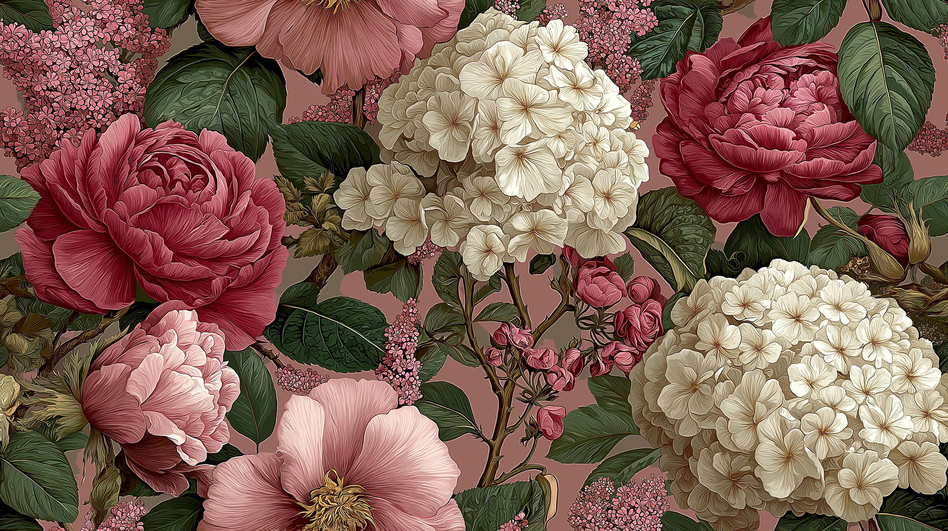A richly layered botanical composition featuring full, sculpted blooms in dusty rose, deep blush, soft ivory, and muted crimson, intertwined with deep green foliage and delicate floral clusters. The illustration style feels hand-rendered and timeless, with finely etched petals and leaves set against a warm, muted rose background. The mood is romantic, refined, and quietly dramatic—evoking classic botanical tapestries and vintage garden rooms. This mural brings elegance, warmth, and depth without feeling overly ornate.