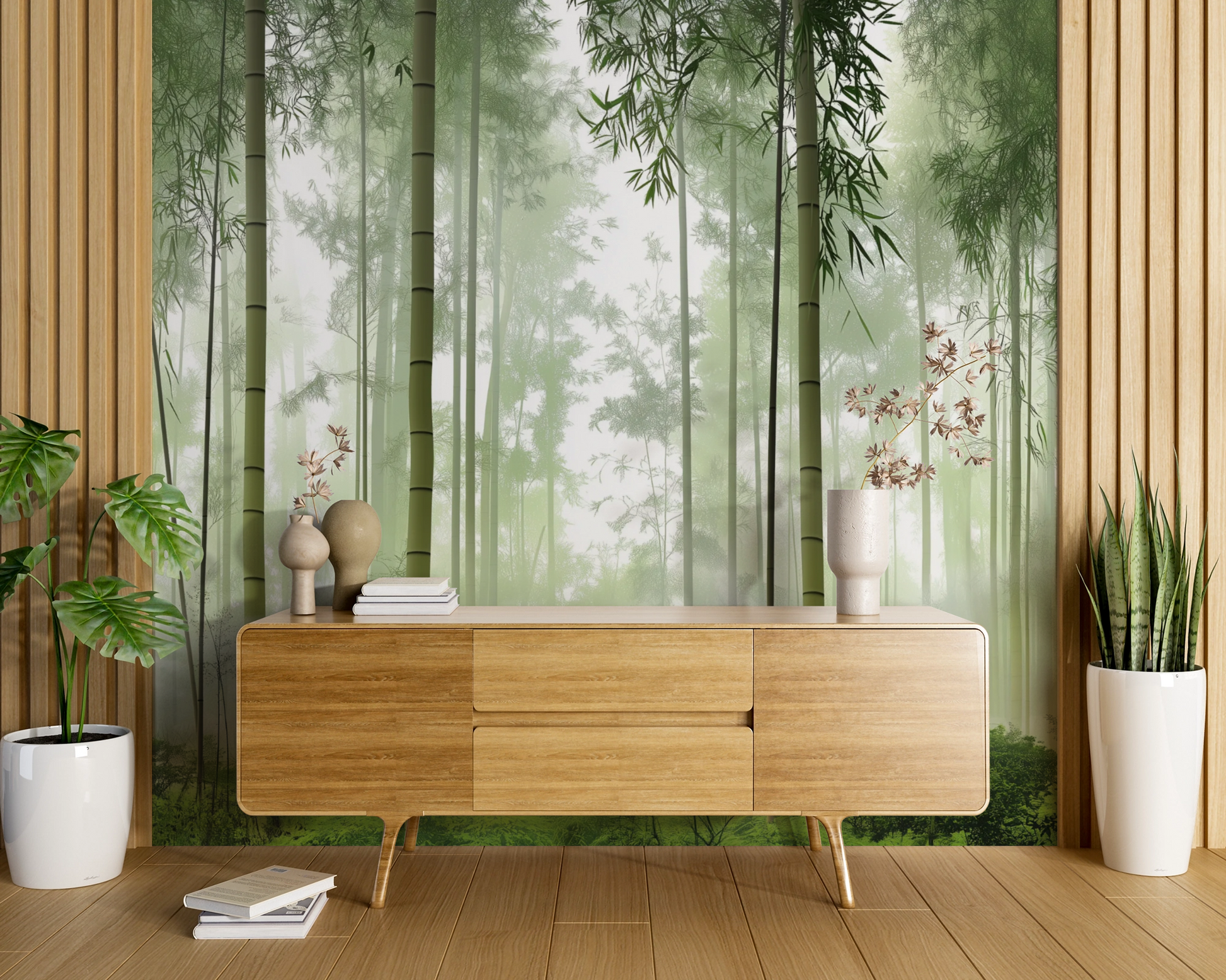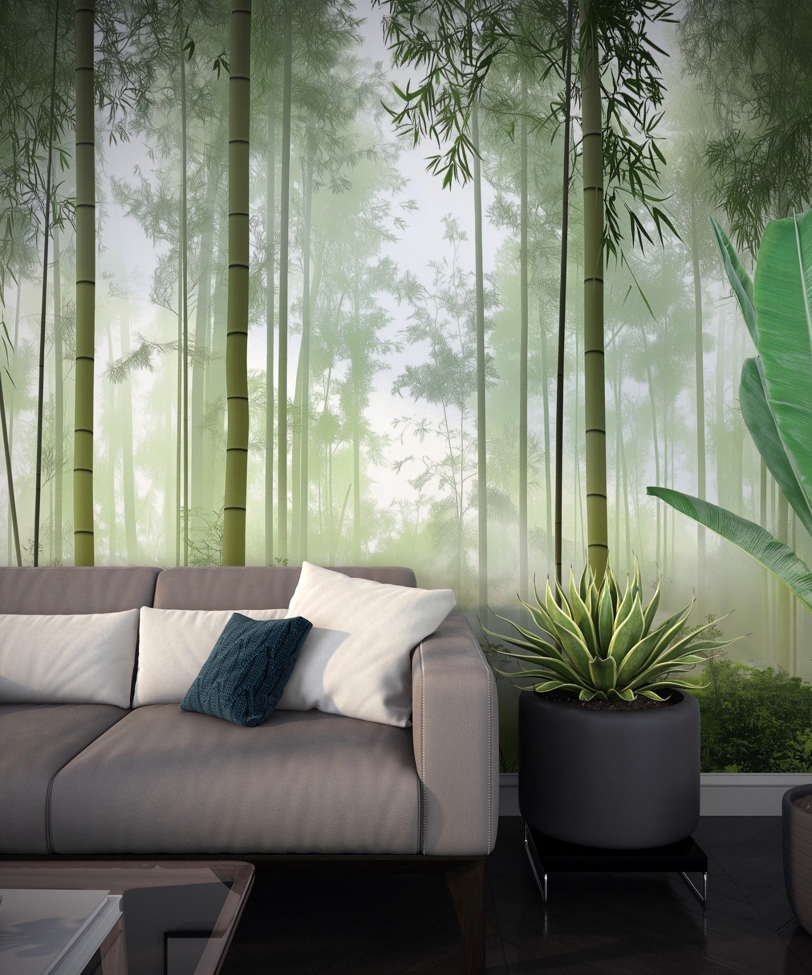 This mural sets a tranquil, meditative mood inspired by the quiet rhythm of nature. Tall bamboo stalks rise gently through soft morning mist, layered in calming shades of sage and pale green. The diffused light and subtle depth create a sense of stillness, balance, and clarity—inviting calm focus and emotional grounding. It’s an ideal backdrop for spaces meant to feel restorative, minimal, and quietly immersive