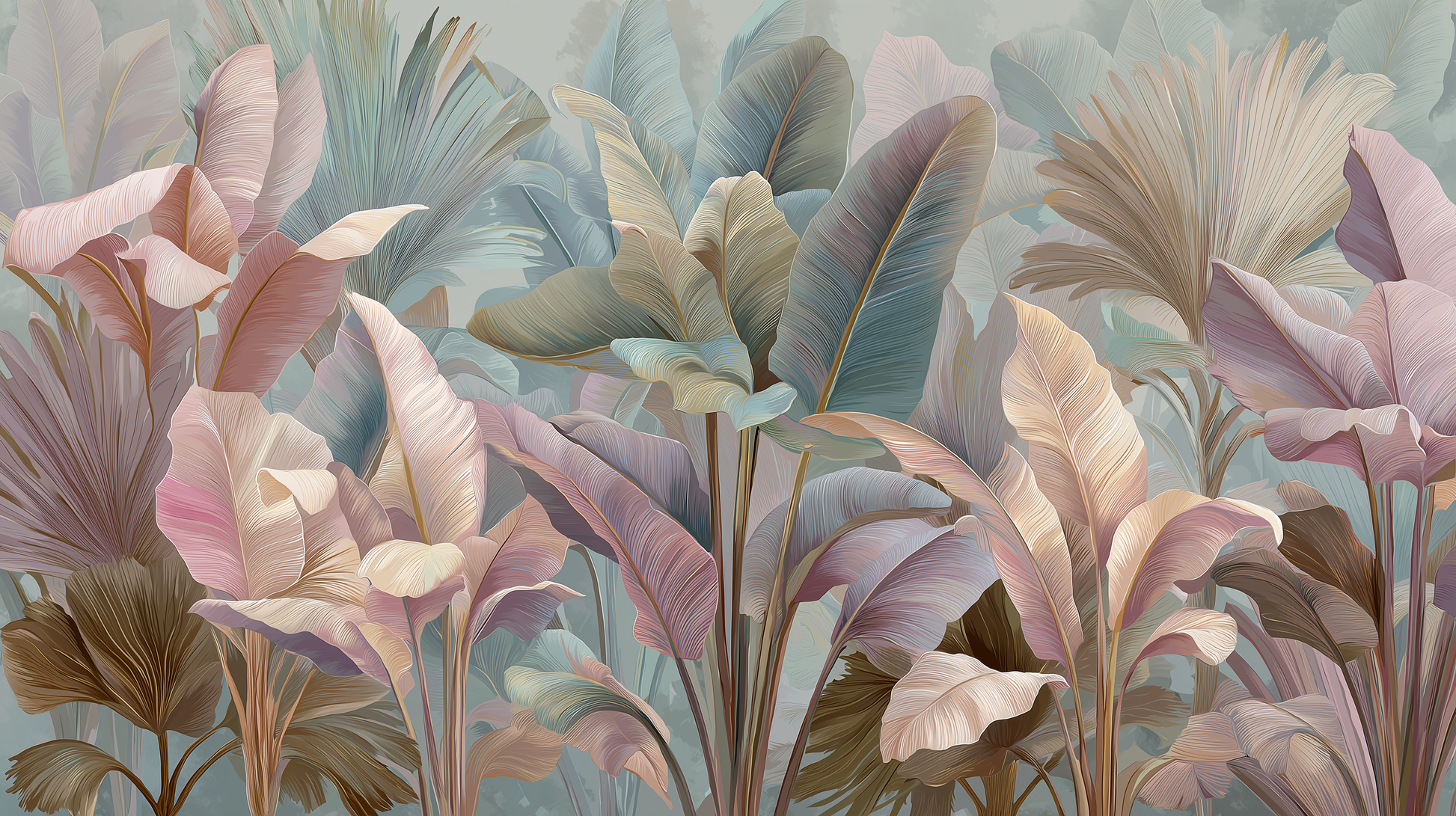 Layered tropical leaves rise softly across the surface in muted pastels of blush, sand, sage, and misty blue. Each form flows with fine, delicate linework, creating depth without heaviness and movement without noise. The mood is tranquil, soothing, and airy—designed to evoke a quiet sense of balance and calm, as if the space is gently breathing. This mural brings a refined, peaceful atmosphere that feels warm, modern, and effortlessly elegant.