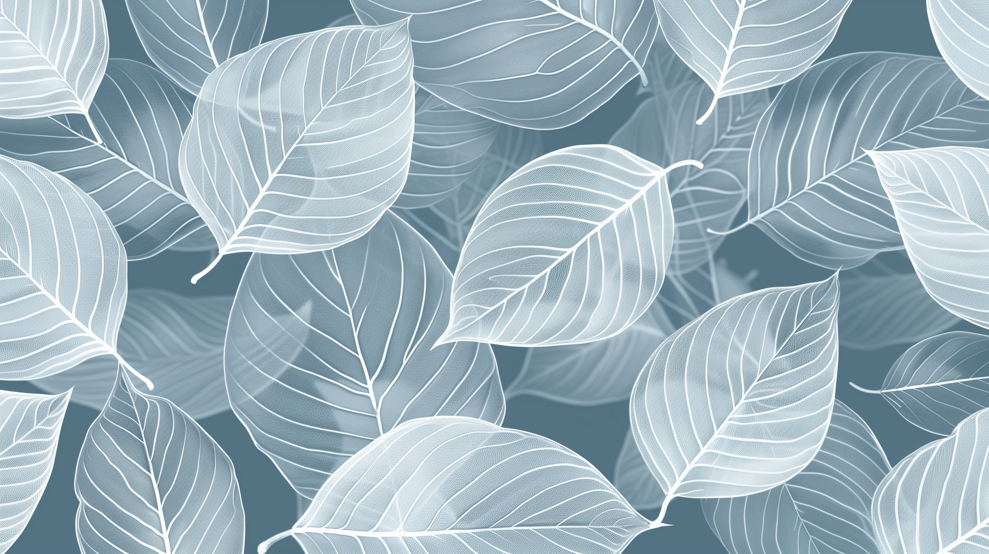 This wall mural showcases an elegant arrangement of translucent botanical leaves layered across a muted blue background. Fine white vein detailing creates a delicate, hand-drawn effect, while overlapping leaf forms add depth and movement without visual clutter. The cool blue-gray palette feels calm, modern, and refined, making the design both versatile and timeless. Its airy composition allows light to flow naturally through a space, offering a subtle organic texture rather than a bold statement. Ideal for bedrooms, bathrooms, offices, living rooms, or minimalist interiors, this mural brings a sense of serenity and understated sophistication while maintaining a clean, contemporary aesthetic.