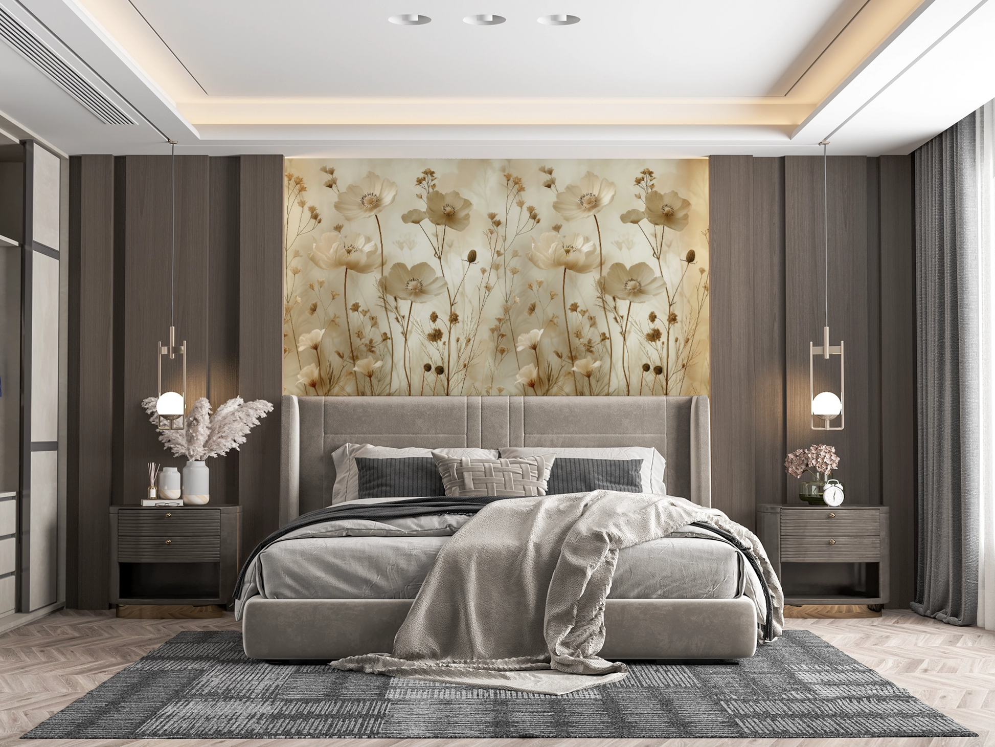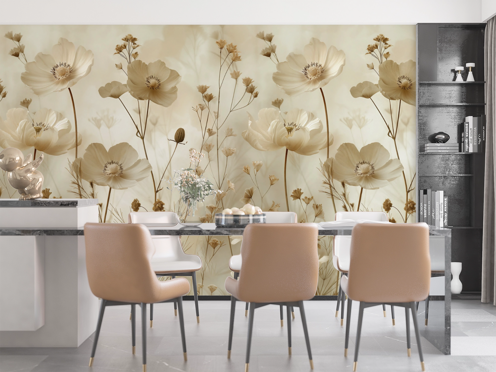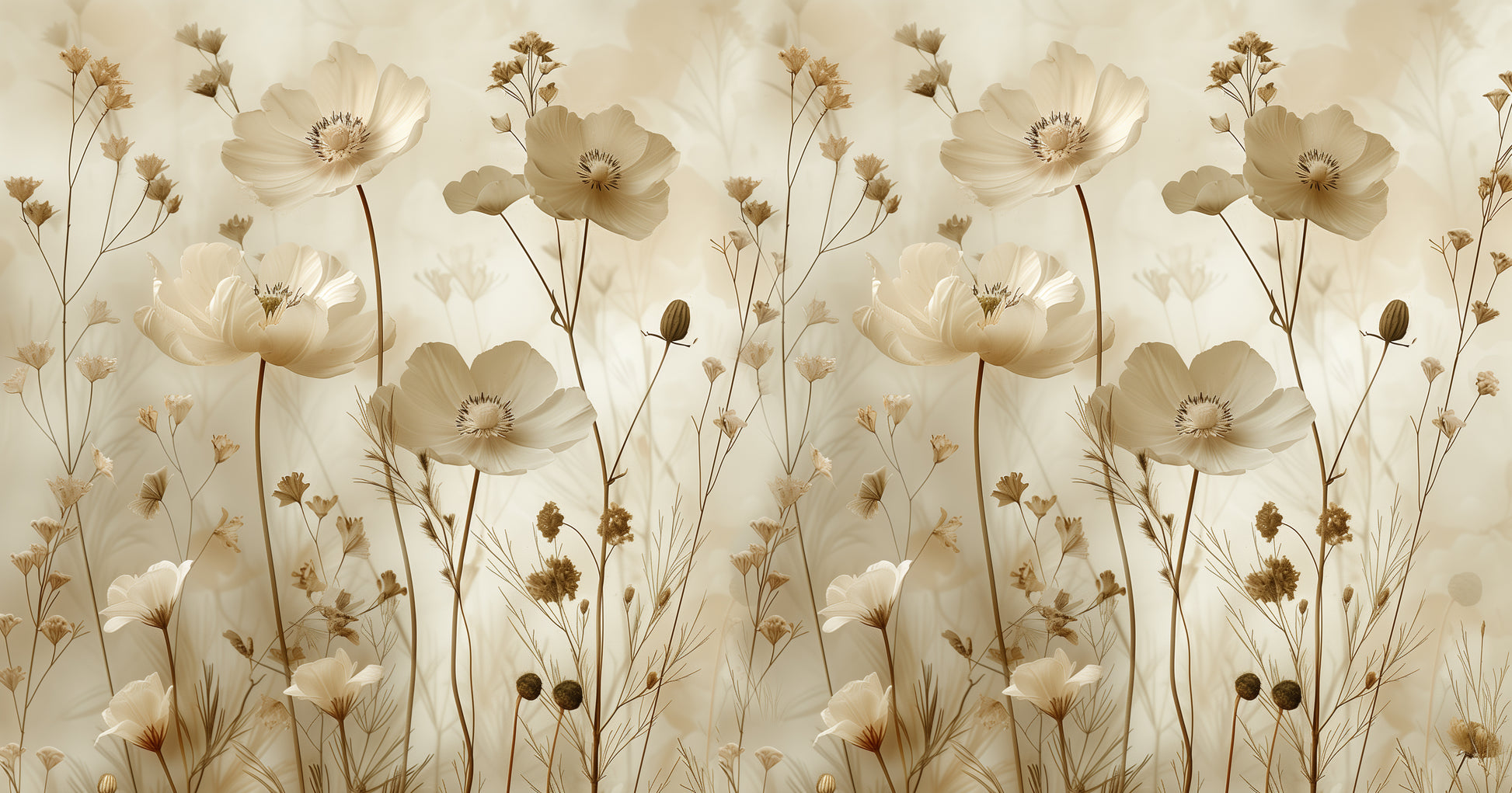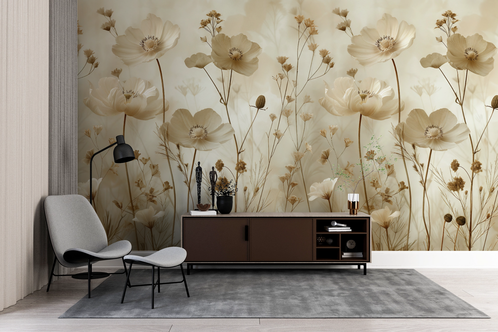 Delicate wildflowers rise gently against a warm, creamy backdrop, their petals rendered in soft ivory and muted champagne tones. Slender stems and fine botanical details create a light, airy composition that feels calm and understated. The overall atmosphere is peaceful and intimate, evoking the quiet beauty of a sunlit meadow where everything feels slow, balanced, and effortlessly elegant. Designed to add warmth and serenity without visual weight, this mural brings a refined, natural softness to any space.