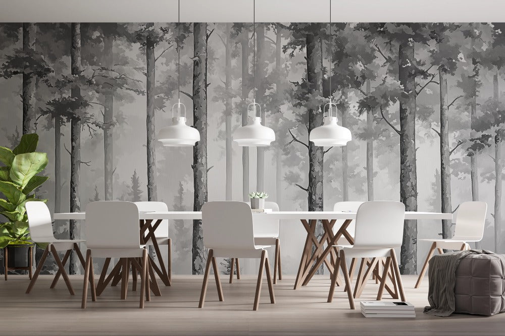 A quiet forest scene softened by drifting mist and layered depth, this mural evokes a sense of calm, stillness, and introspection. Tall pine trunks rise through a muted grayscale landscape, creating a grounded and meditative atmosphere. The composition brings visual order and emotional balance, making it ideal for spaces designed to feel serene, reflective, and intentionally uncluttered.