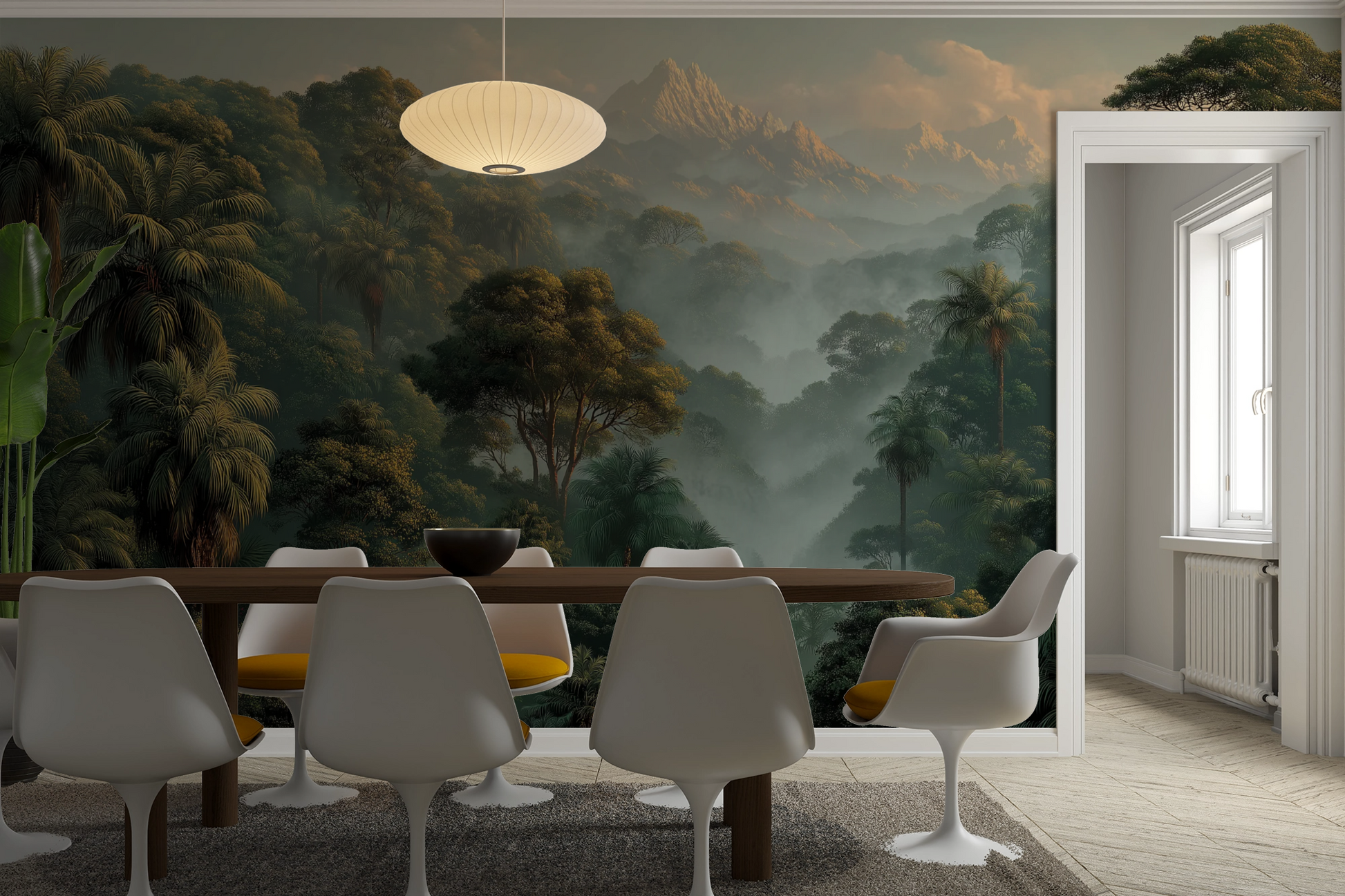 Ideal for interiors seeking a connection to nature, this mural enhances living rooms, bedrooms, offices, and large feature walls with a refined sense of scale and tranquility. The balance of rich green tones and atmospheric perspective allows the design to feel grounding without overpowering the space.